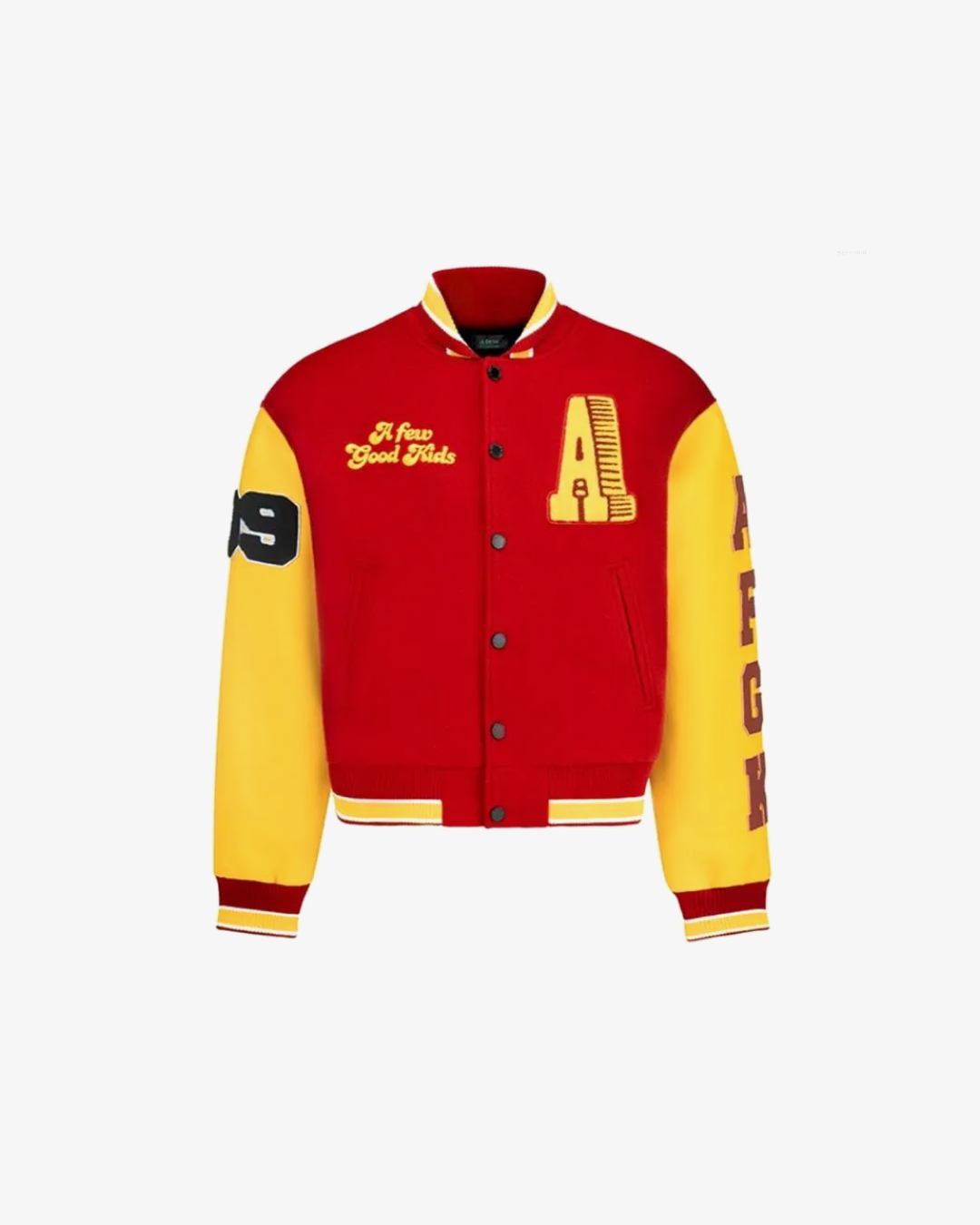 Crafted with premium materials, this jacket features a sturdy wool body for warmth and durability, paired with smooth, high-quality leather sleeves that add a touch of luxury and contrast. The jacket is detailed with bold, embroidered patches and logos that showcase the unique flair of A Few Good Kids, making it a standout piece in any wardrobe.