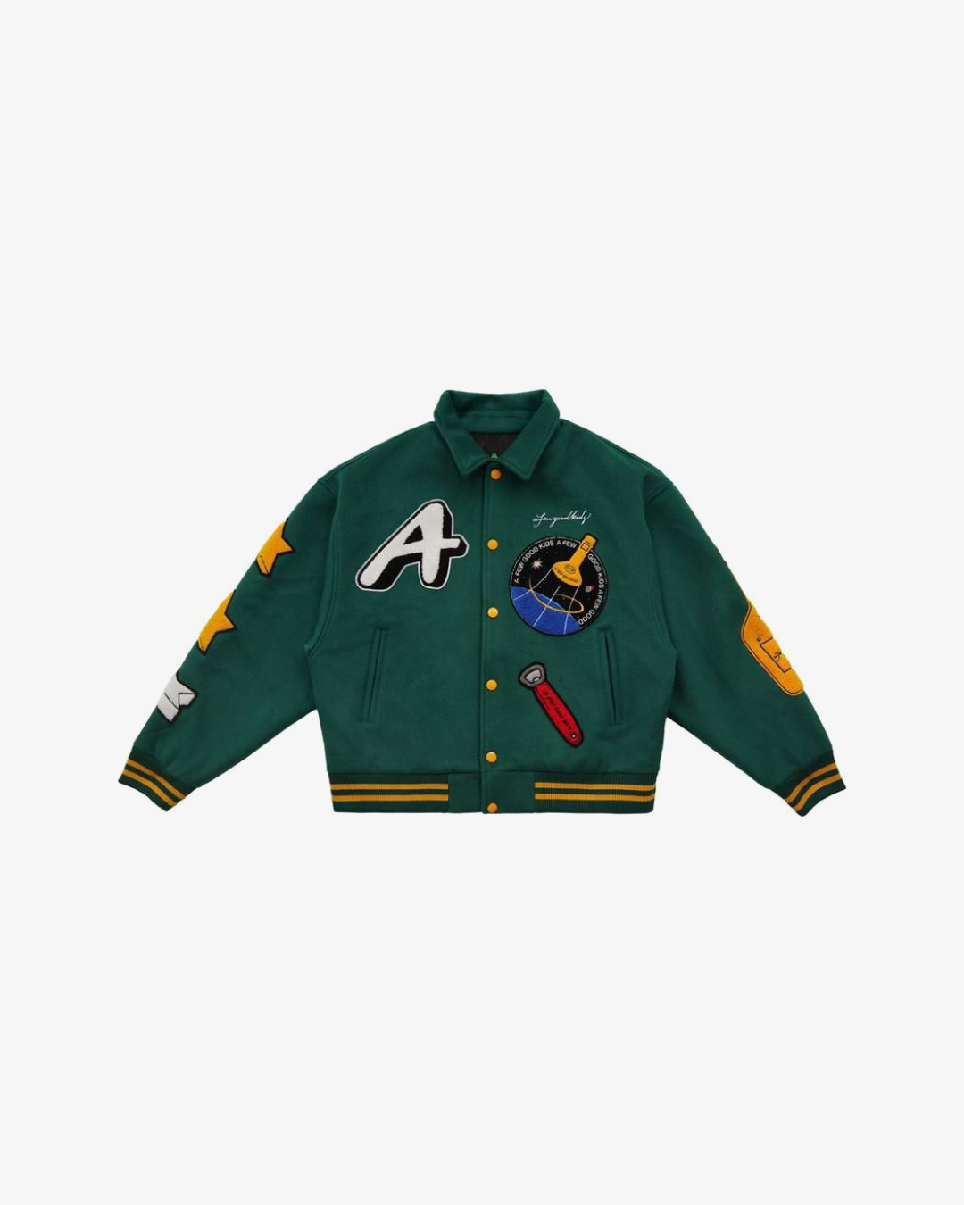 Featuring bold, contrasting colors and intricate embroidered patches, the jacket pays homage to traditional varsity designs while incorporating modern streetwear aesthetics. The ribbed collar, cuffs, and hem add a snug fit, while the button-up front allows for easy layering over your favorite tees or hoodies.