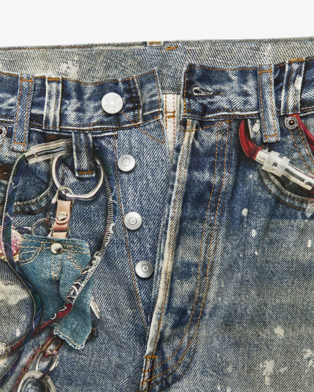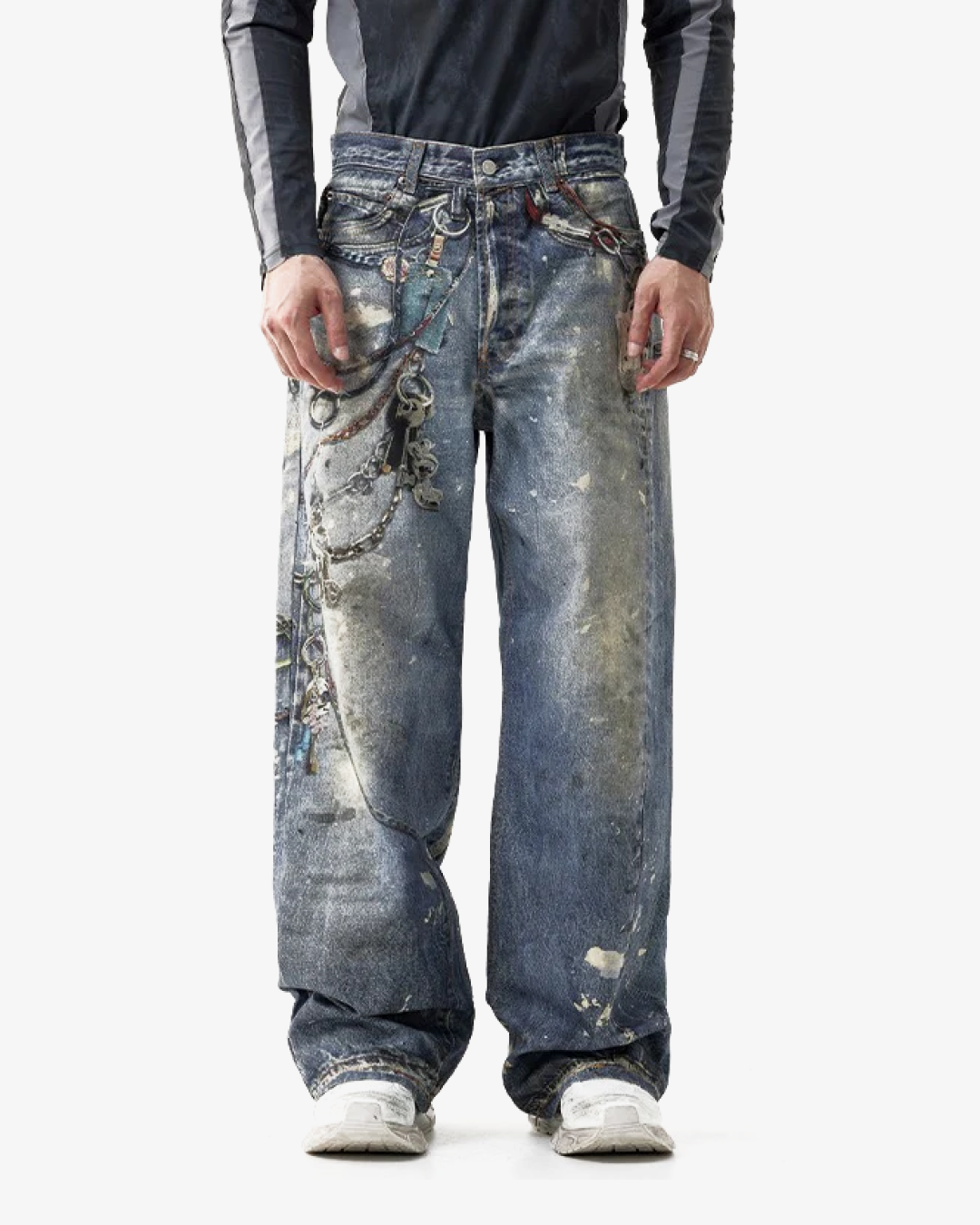 Crafted from high-quality denim, the jeans feature an all-over graphic print, blending intricate patterns and textural elements, creating a visually striking effect. The print is subtle yet artistic, adding a creative flair to your casual wardrobe. The slim-fit cut maintains a modern silhouette while allowing for a comfortable, relaxed feel.
