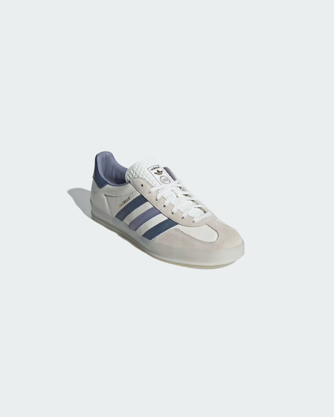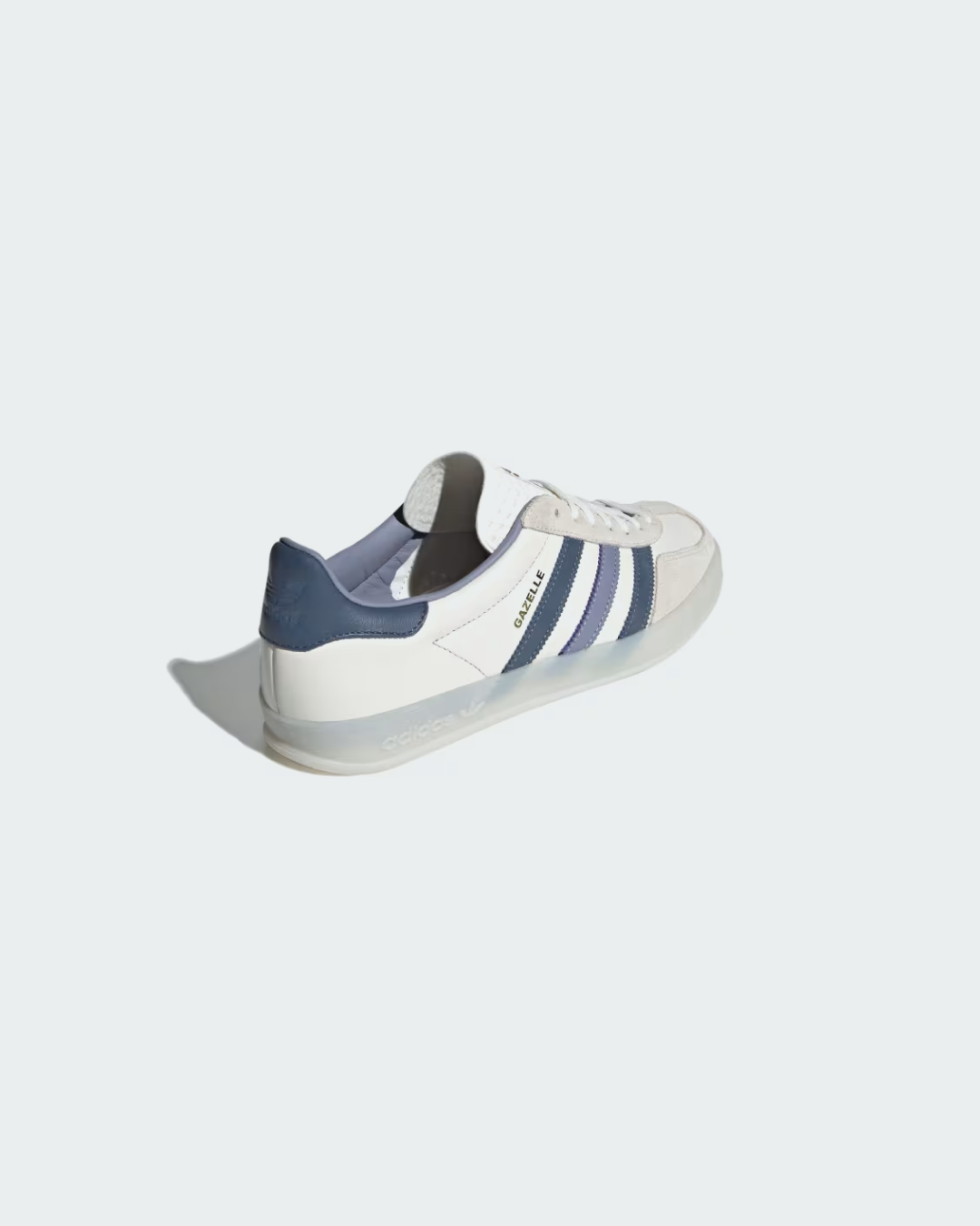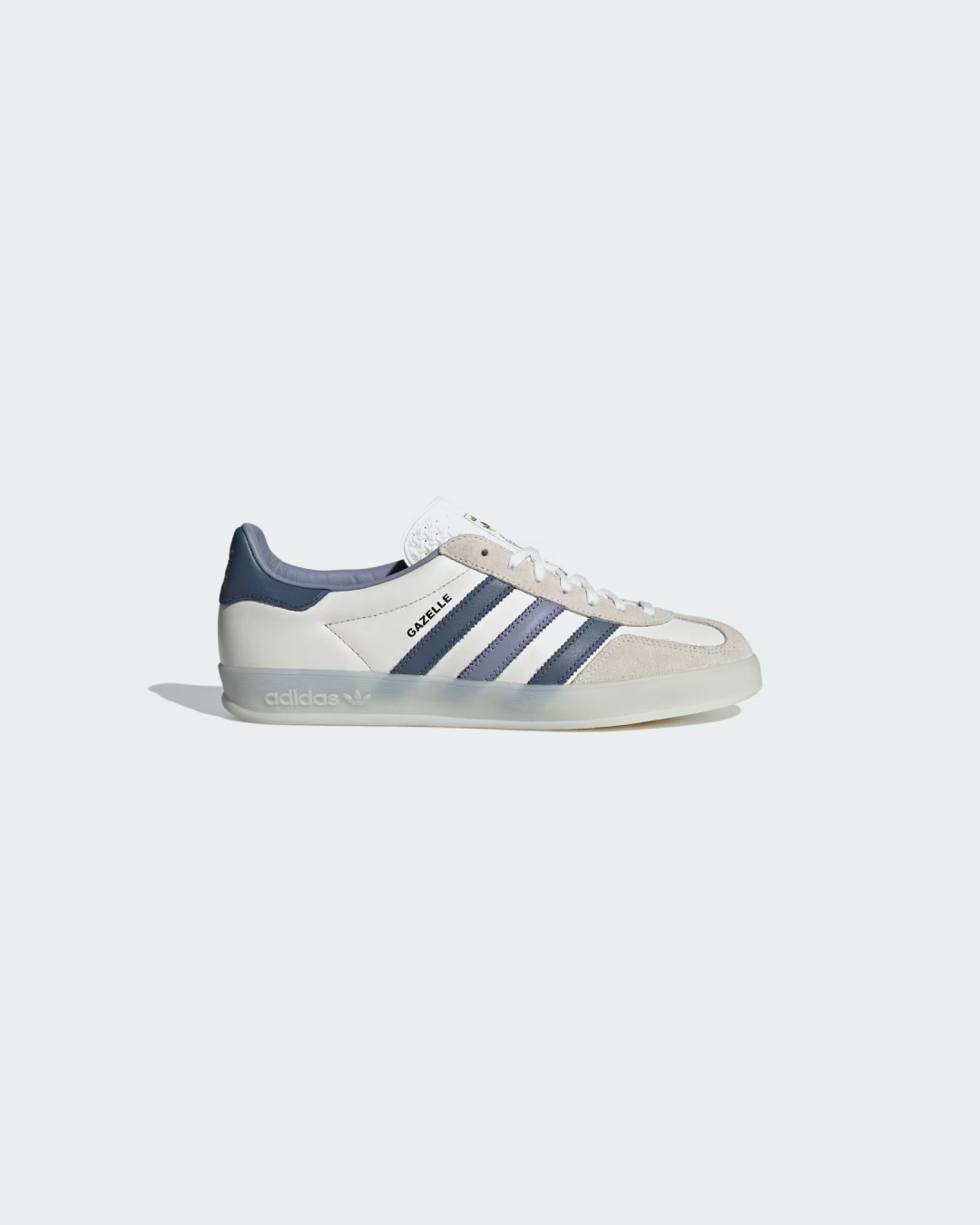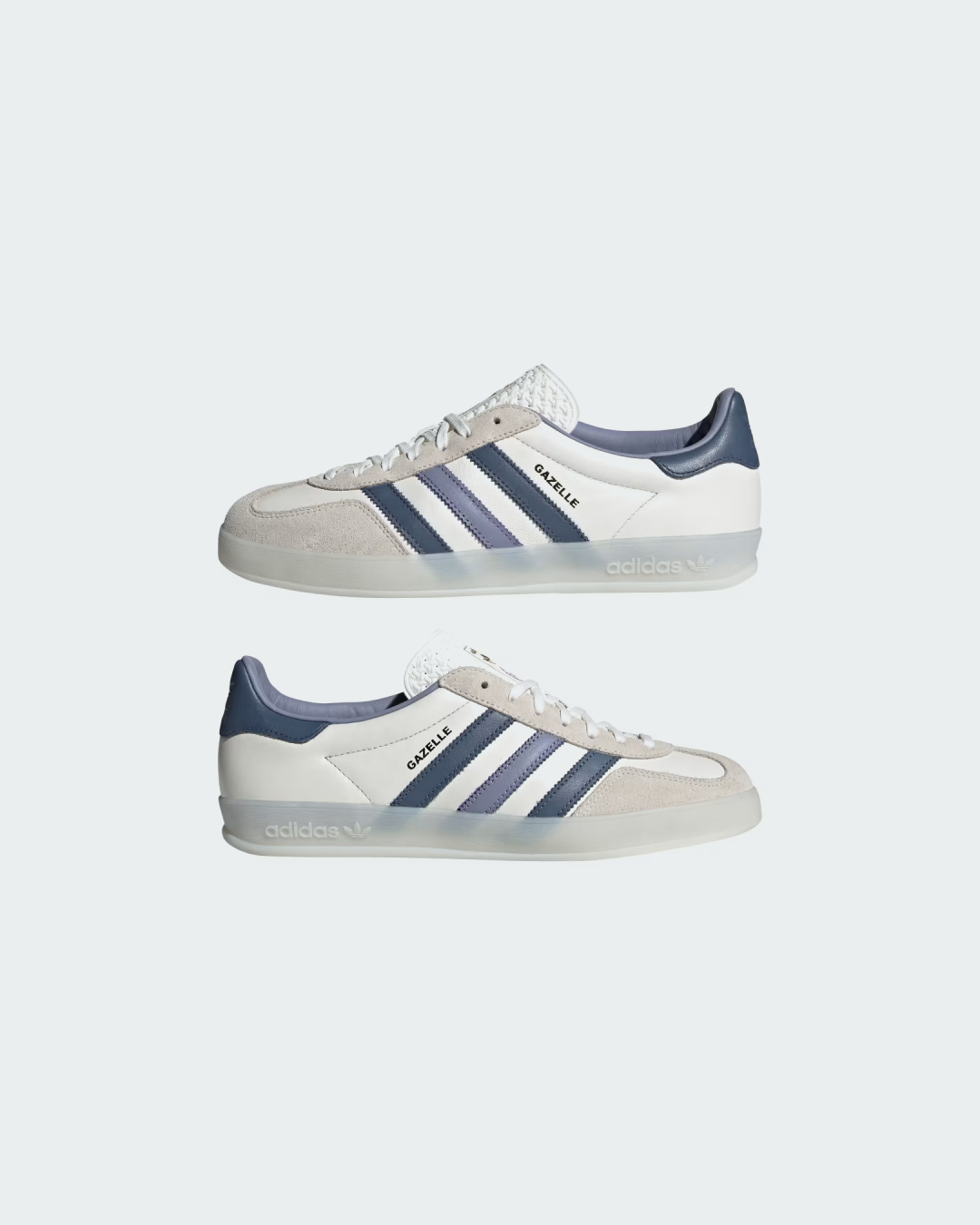 The Adidas Gazelle Indoor “Core White/Preloved Ink Melange” is a refined take on the classic Gazelle silhouette, blending heritage design with contemporary flair. Originally introduced as an indoor training shoe in the 1970s, this iteration maintains its iconic low-profile while incorporating modern materials and colorways.