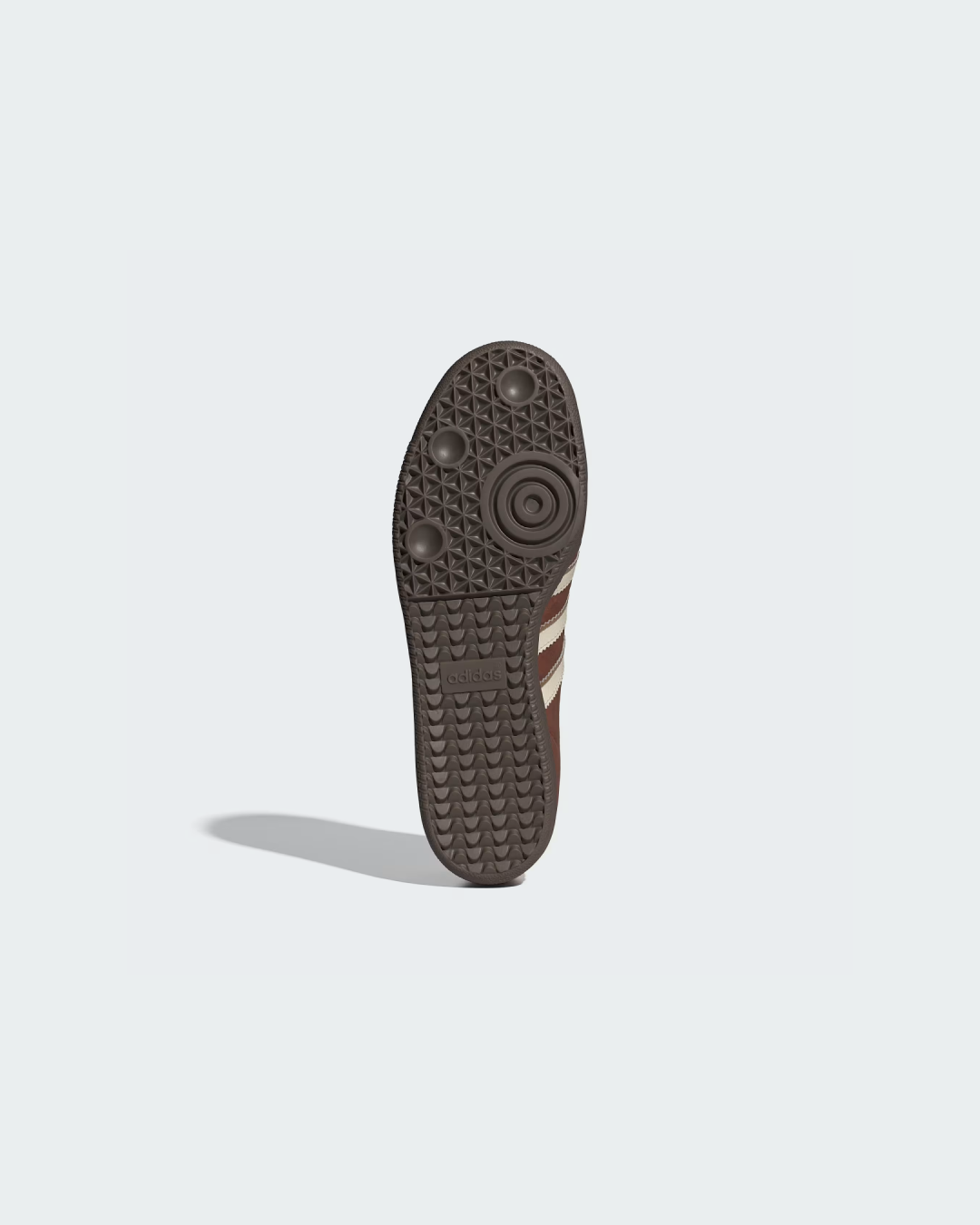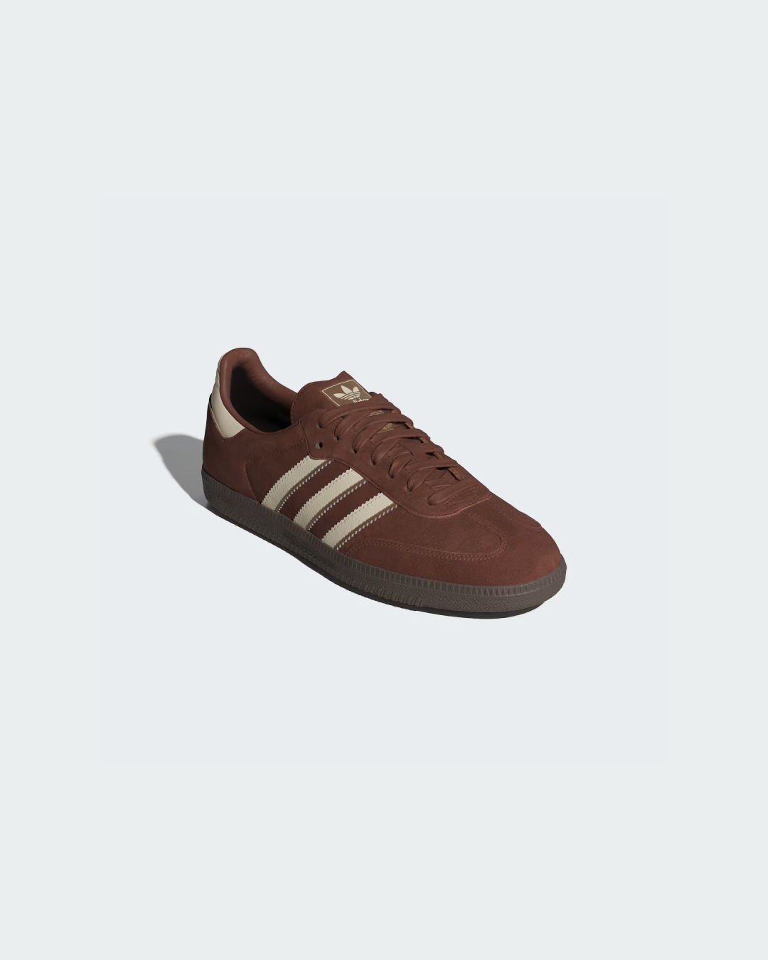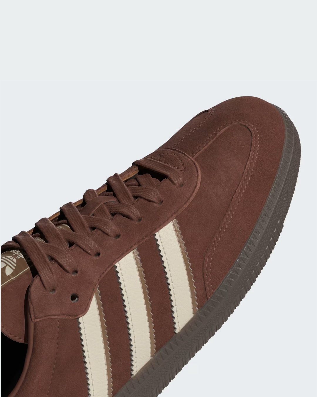 Crafted with a rich brown suede and leather upper, the OG Samba retains its signature T-toe overlay and serrated 3-Stripes branding, while the contrast gum rubber sole delivers that unmistakable retro finish. The low-profile design hugs the foot comfortably, making it ideal for all-day wear. Subtle Adidas detailing on the tongue and sidewall round out the look, paying homage to the brand’s legacy while keeping things fresh and on-trend.