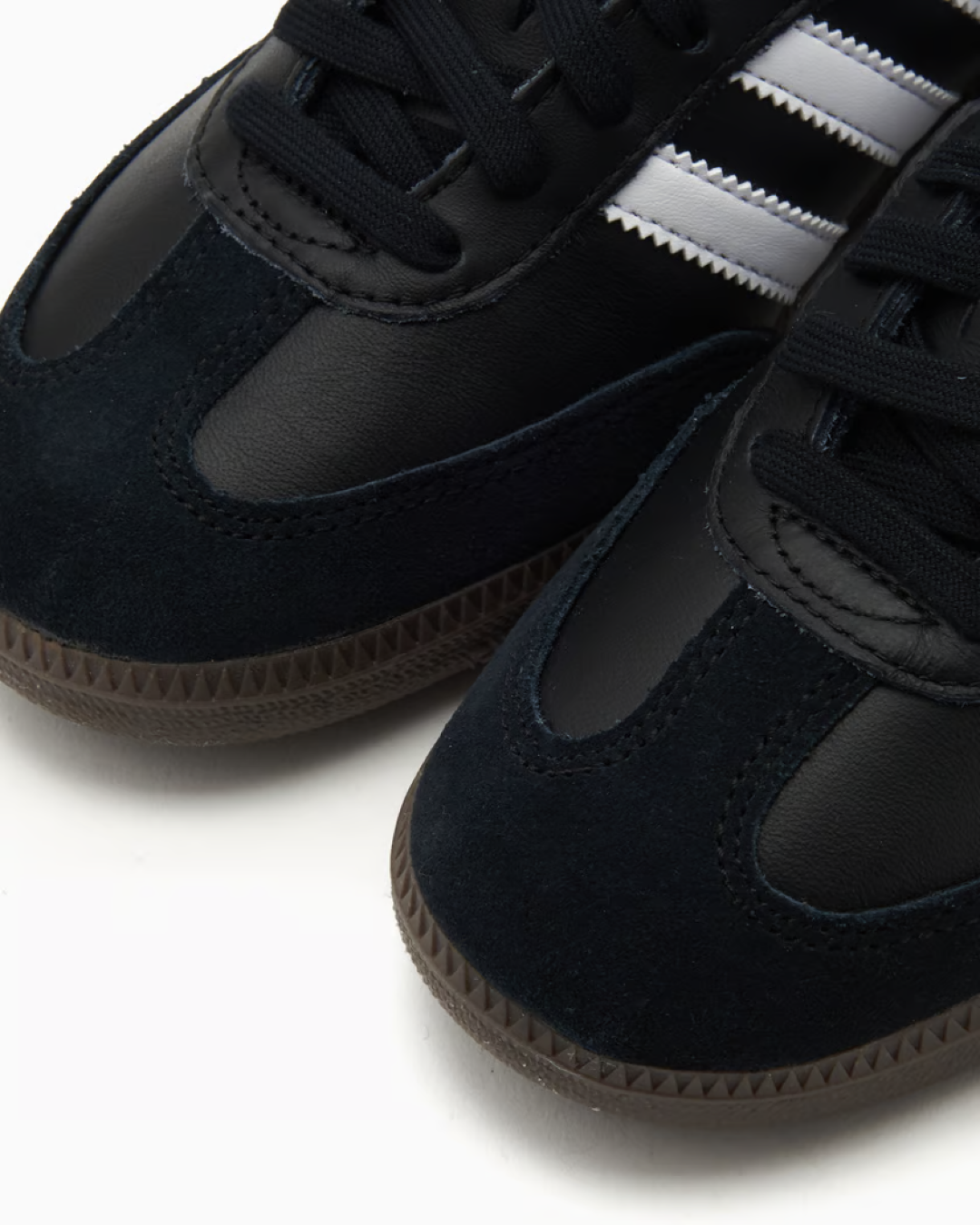 The design of this black adidas Samba maintains its most classic style with the rubber sole, the three white stripes, and the T-shaped toe cap.