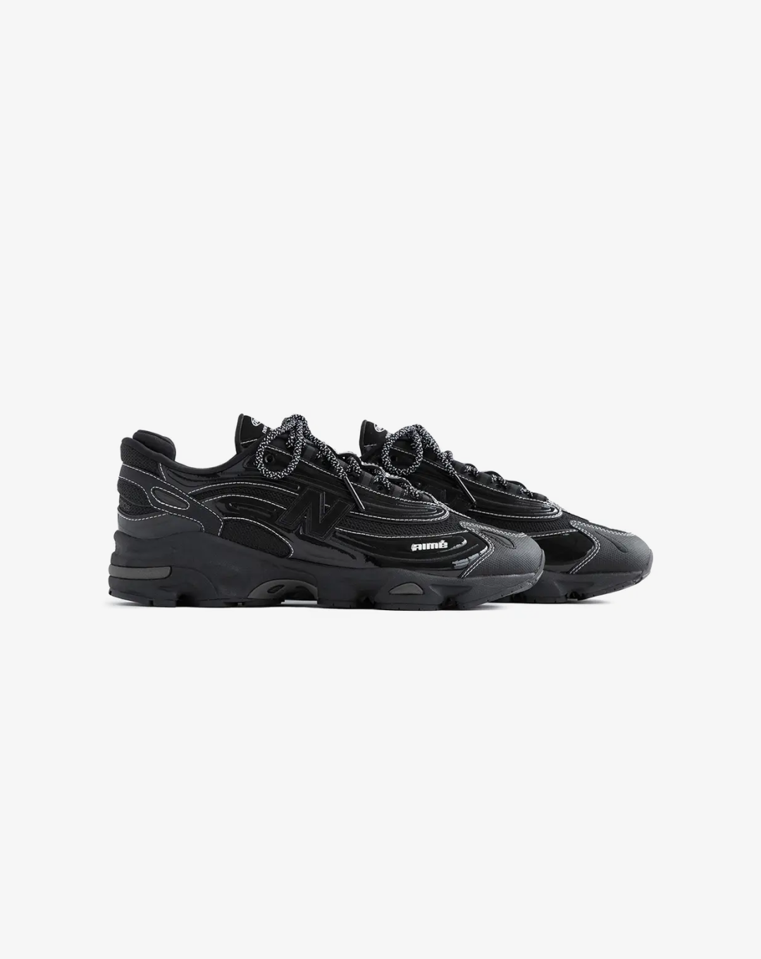 This limited-edition rendition features an all-black mesh underlay with glossy leather overlays on the midfoot and rear. White contrast stitching highlights the outlines, complementing the two-tone round laces. Discreet “N” logos nestle on the sidewalls, allowing the white “aimé” label on the lateral forefoot to stand out. Co-branding appears on the tongue and sockliners to set this colourway apart. A chunky ABZORB midsole provides supportive cushioning, backed by a segmented rubber sole. The shoe arrives in a special-edition co-branded box, a metallic “aimé” hangtag, and additional white and black cotton laces for extra styling options..