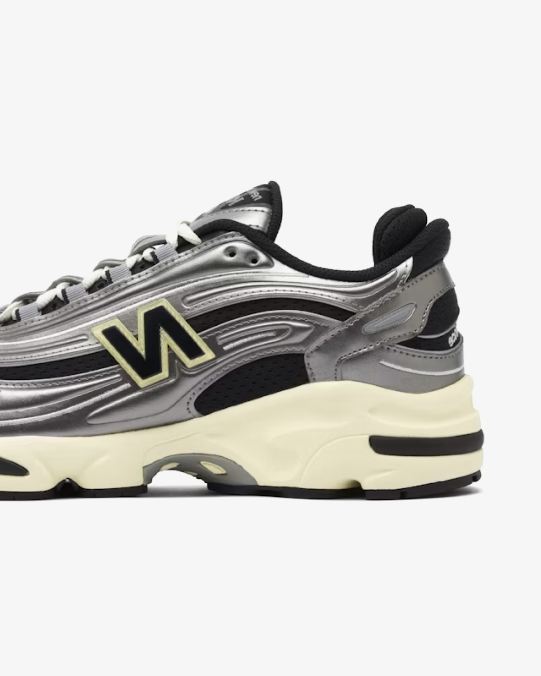 The sneaker features a sophisticated mix of materials, including premium suede, mesh, and leather, all presented in a ‘Vintage Metallic’ colorway that exudes a retro yet refined vibe. Metallic accents add a touch of luxury, while the classic New Balance branding and co-branded details on the tongue and heel showcase the collaborative effort behind the design..