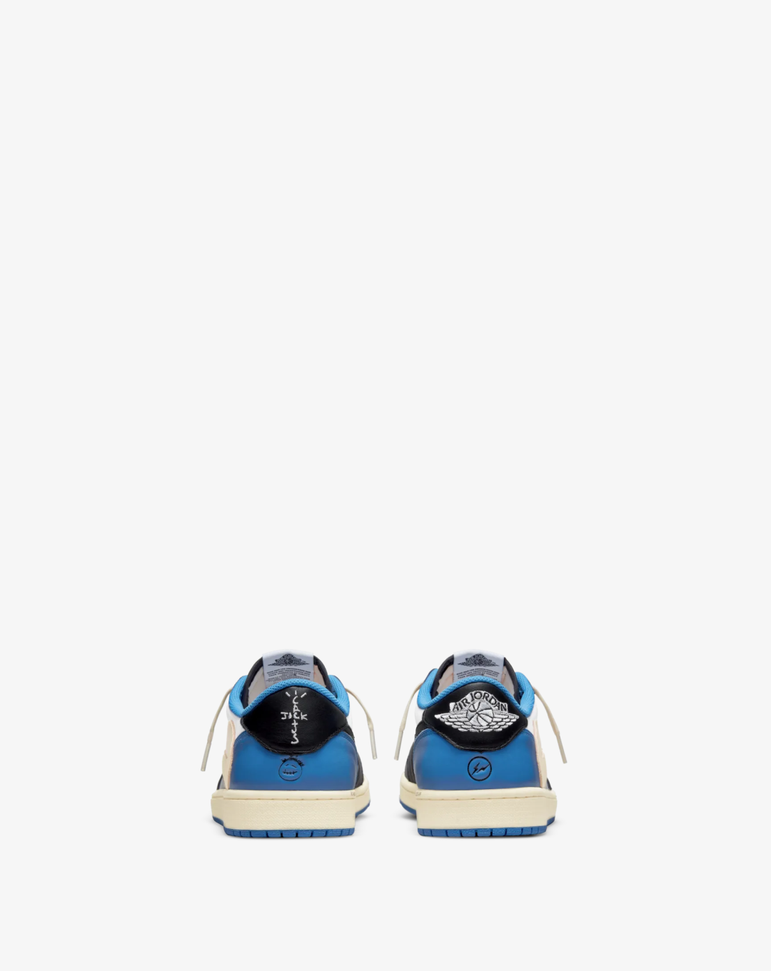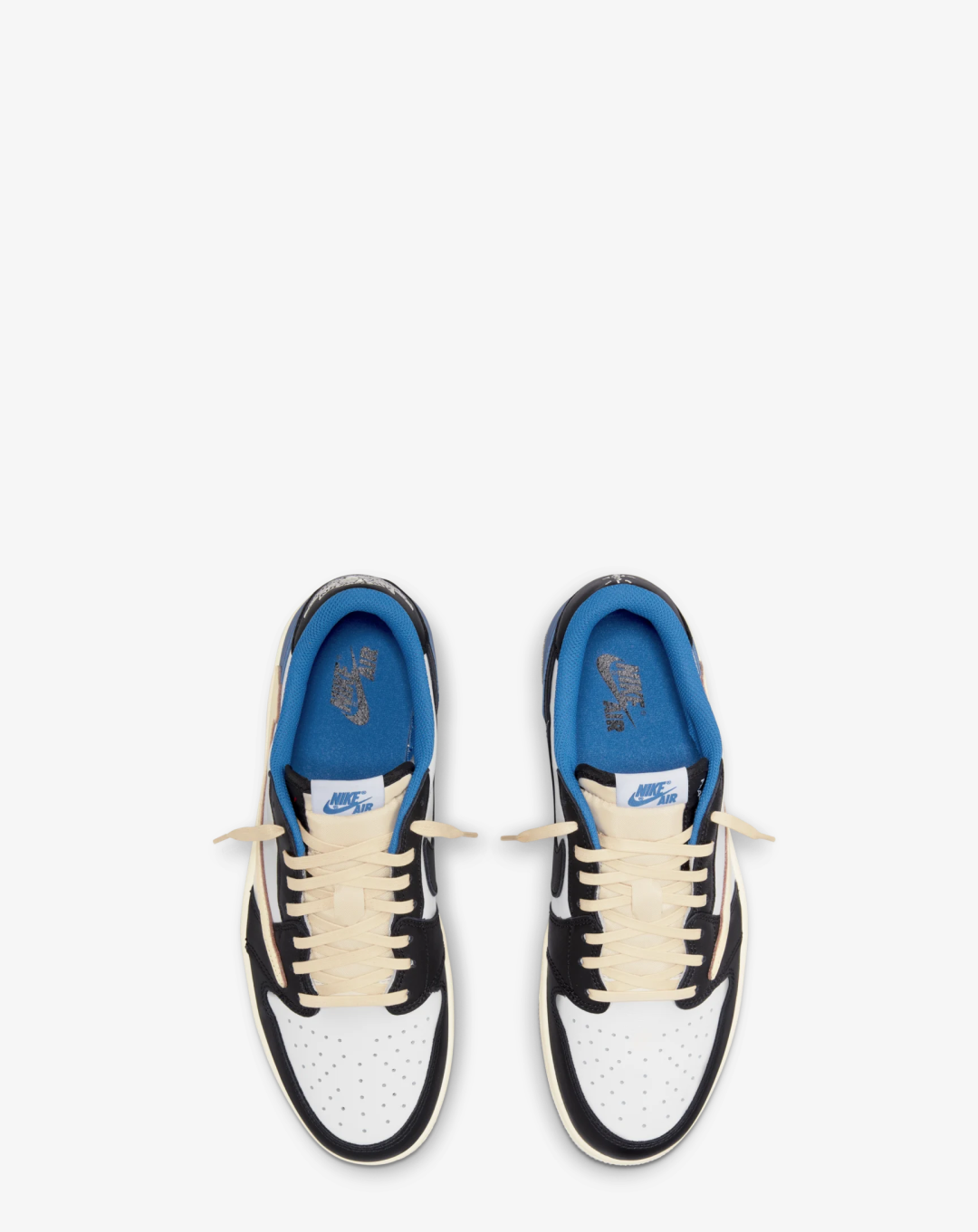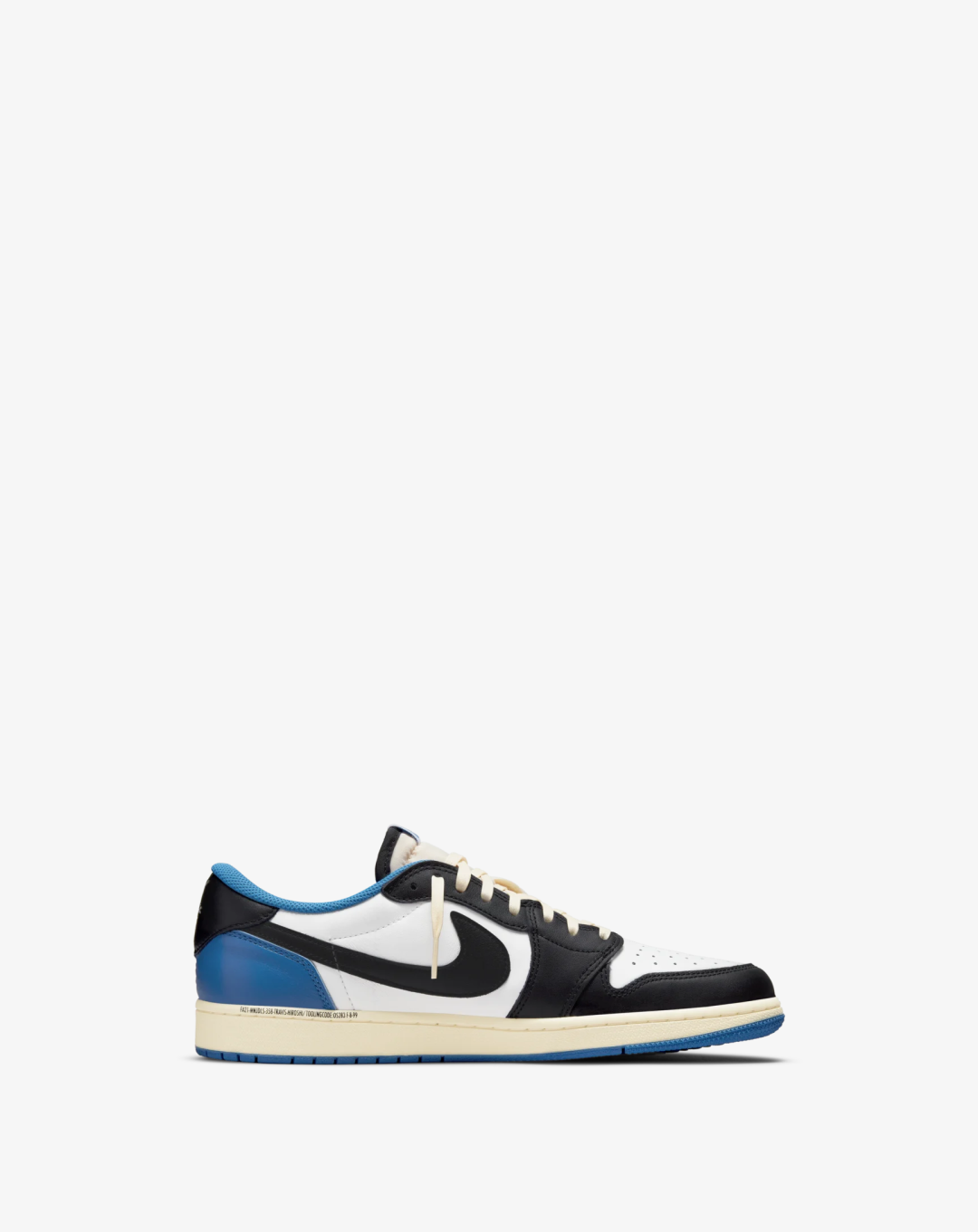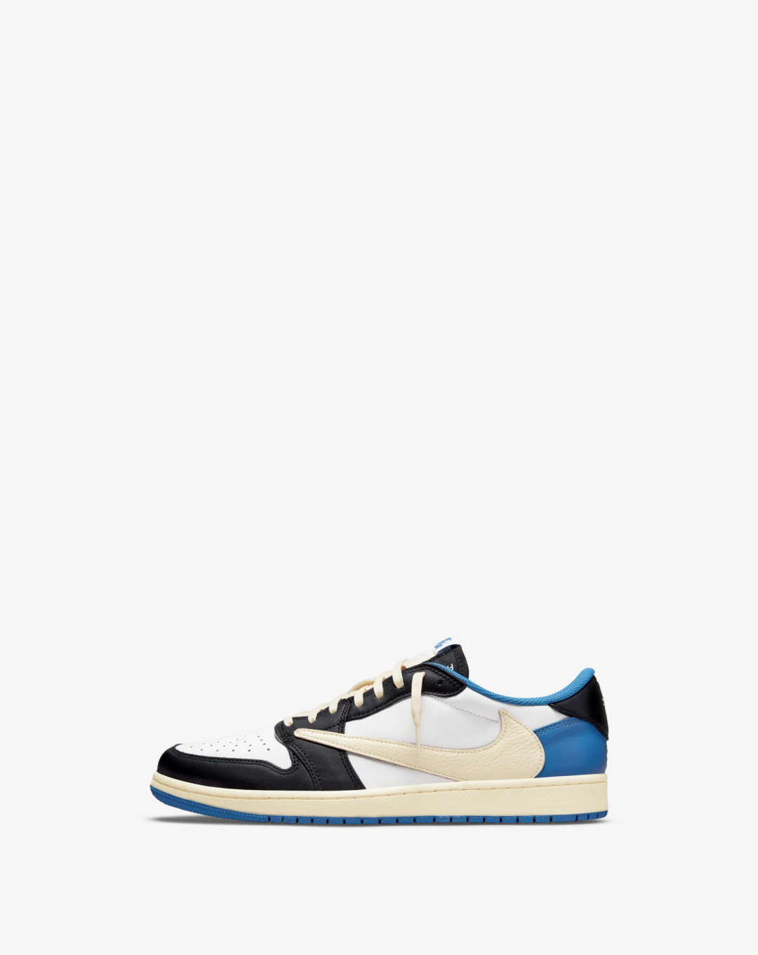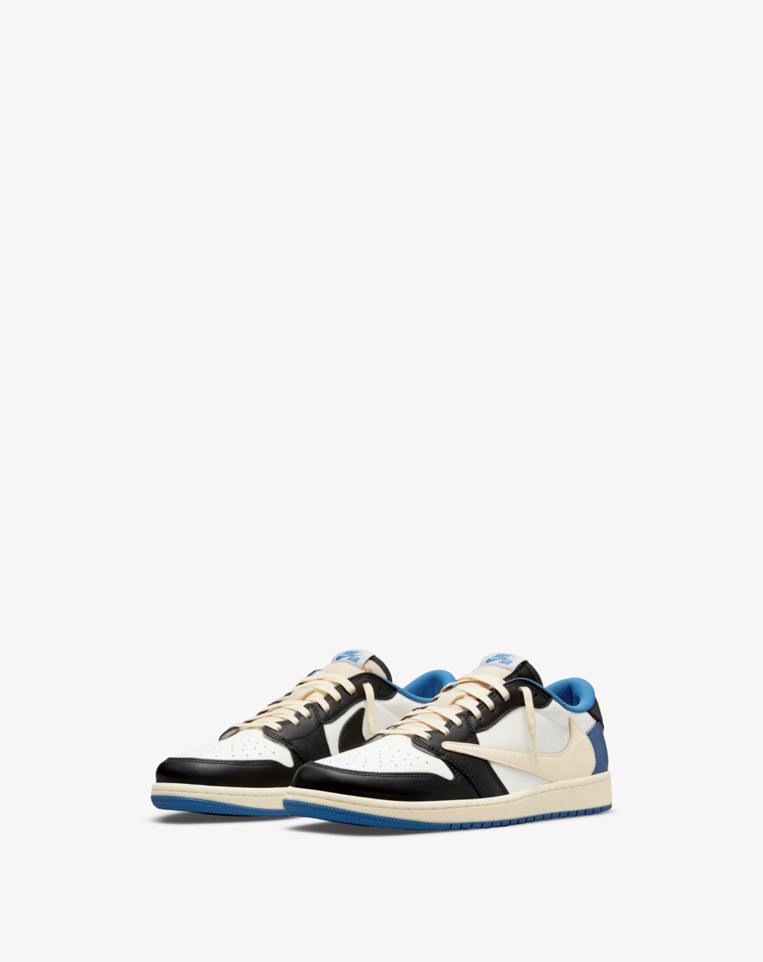 The Air Jordan 1 Low Travis Scott "Fragment" is a groundbreaking collaboration between Travis Scott, Jordan Brand, and Fragment Design, combining iconic design elements with contemporary streetwear aesthetics. This low-top sneaker features a premium leather upper in a white, black, and royal blue colorway, offering a clean and bold look. The standout reverse black Swoosh—a signature Travis Scott detail—creates a striking contrast, while Cactus Jack branding on the tongue and Fragment’s lightning bolt logo on the heel add unique collaborative touches. A sail midsole enhances the vintage aesthetic, while the rubber outsole ensures traction and durability.