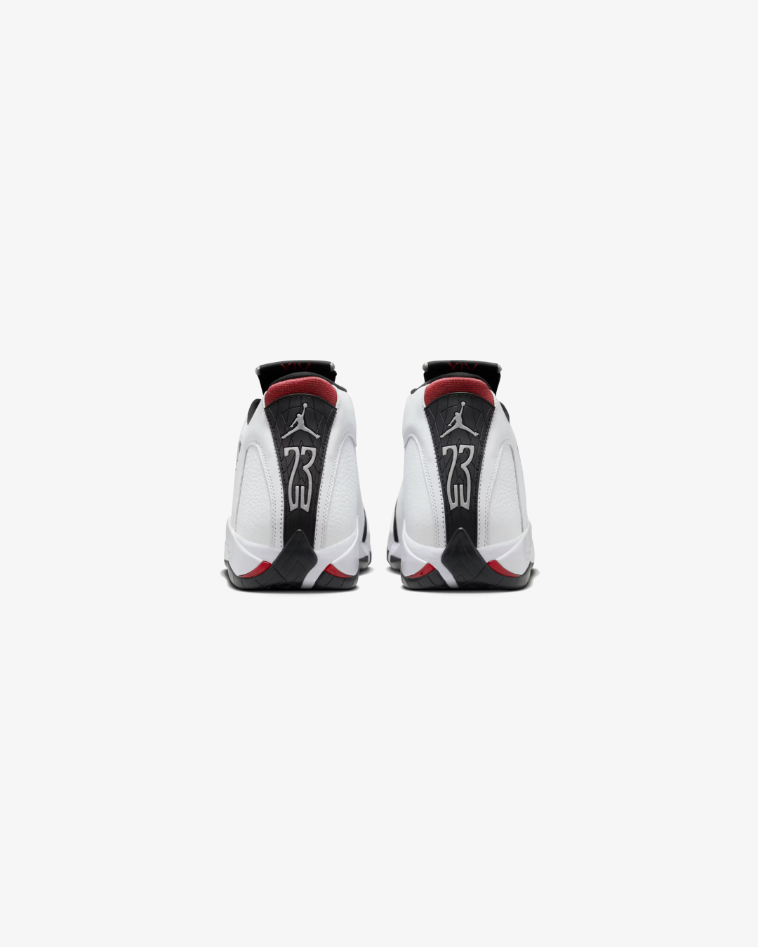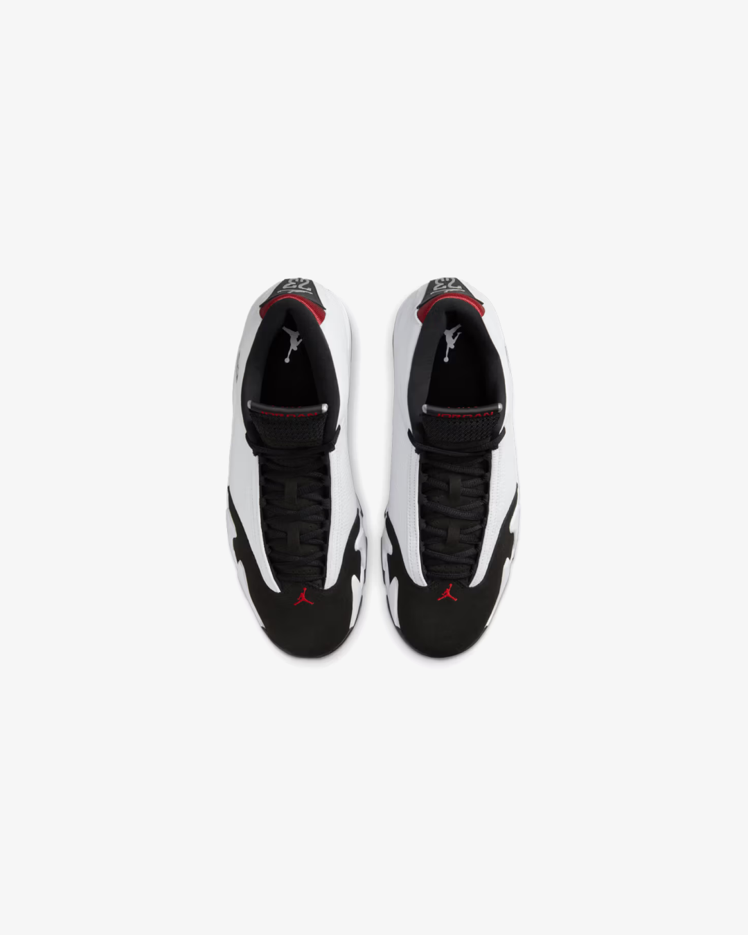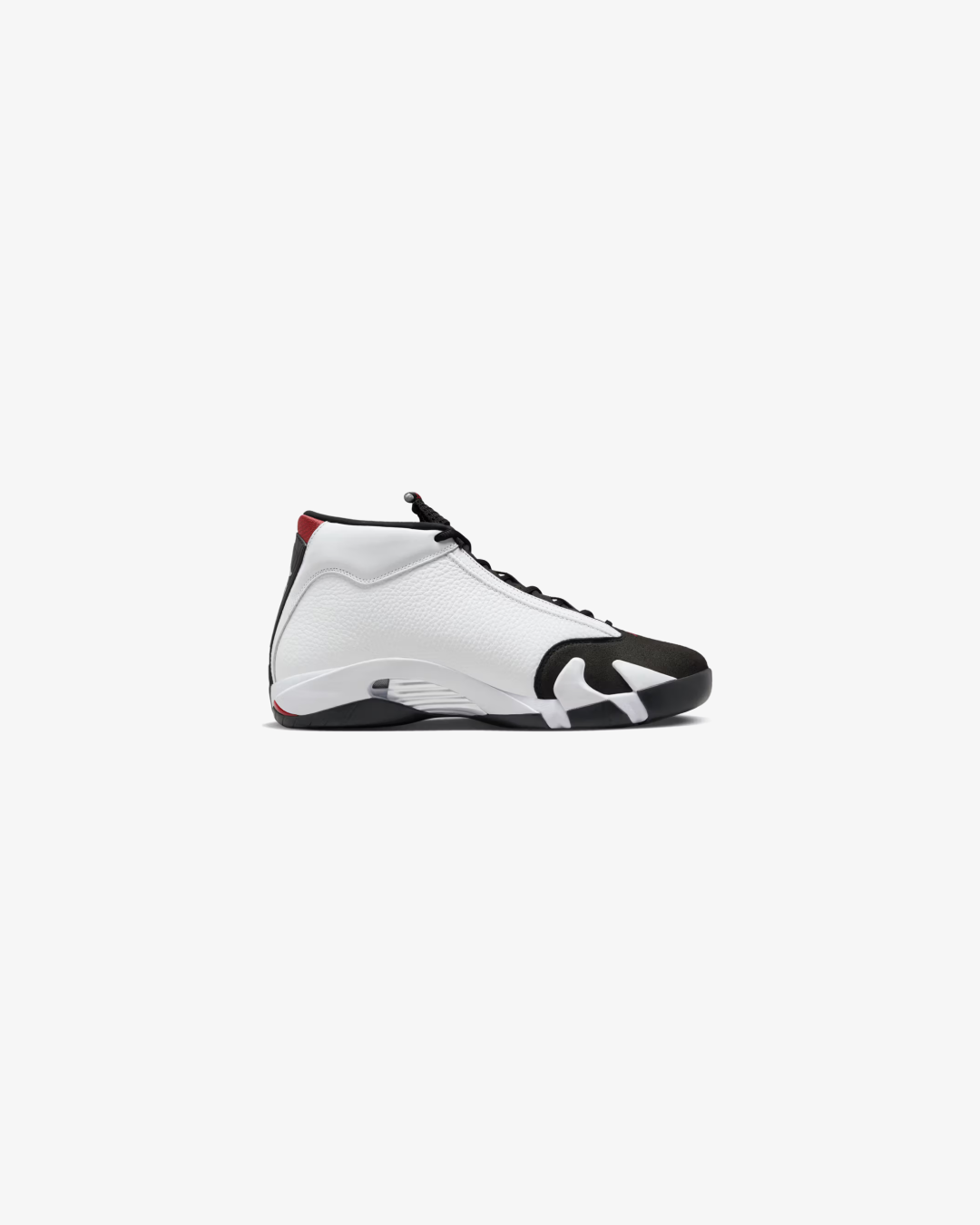 Details include small red accents on the Jumpman logo and the tongue, while the Ferrari-inspired Jumpman emblem on the side adds a touch of premium appeal. With its comfortable cushioning and bold design, the Air Jordan 14 "Black Toe" is an iconic choice for basketball fans and sneaker enthusiasts who appreciate both style and performance.