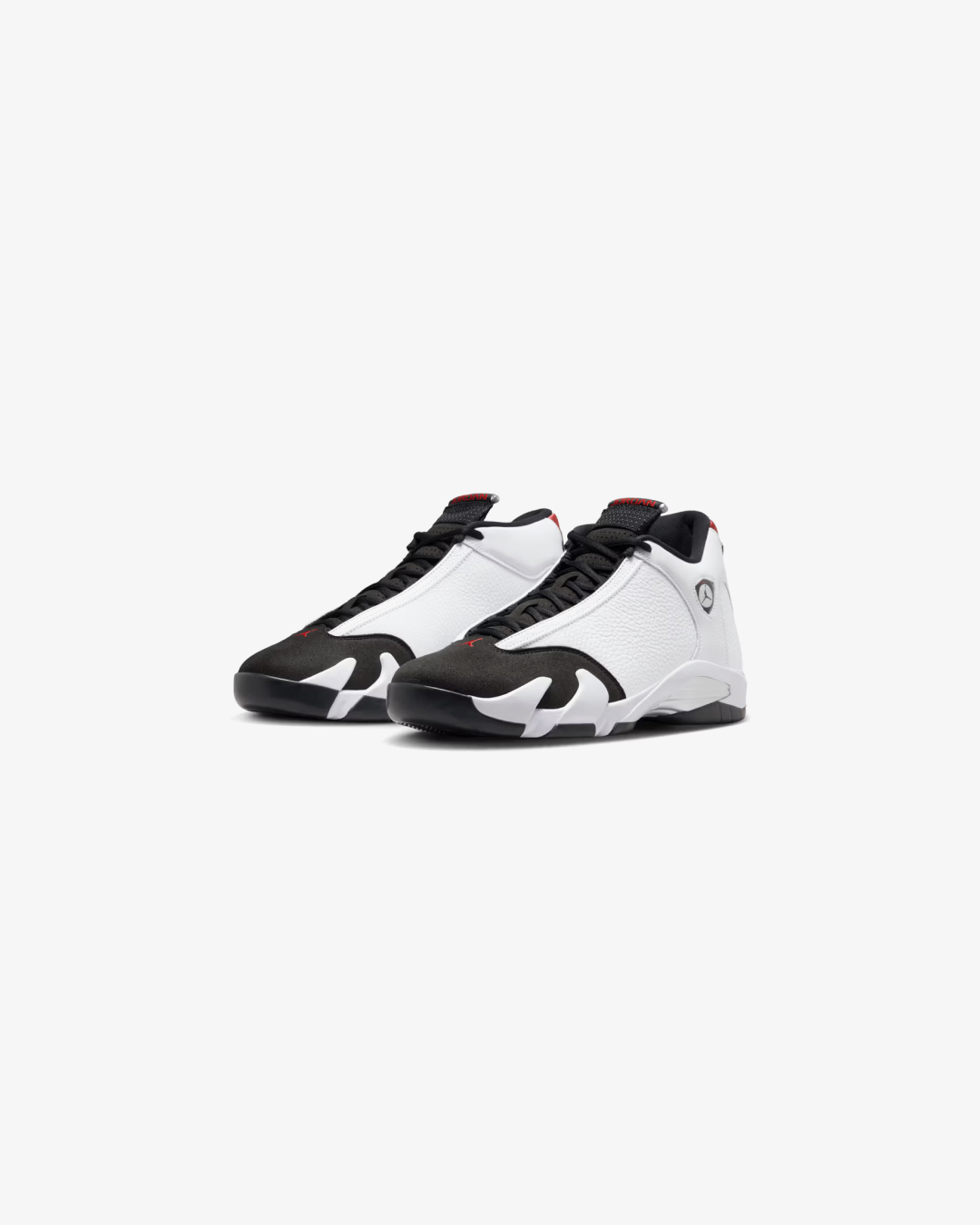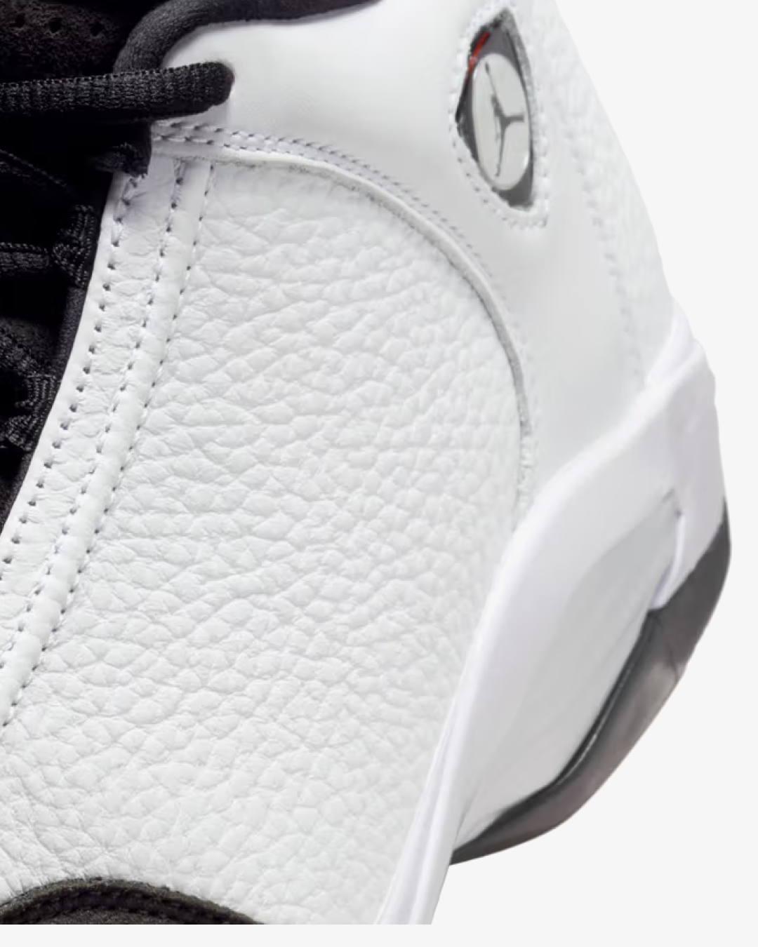 The Air Jordan 14 "Black Toe" sneakers are a classic, originally released in 1998 and inspired by Michael Jordan’s love for luxury sports cars. The "Black Toe" colorway is sleek and stylish, featuring a white leather upper contrasted by a black suede toe box, which gives the shoe its signature "Black Toe" name.