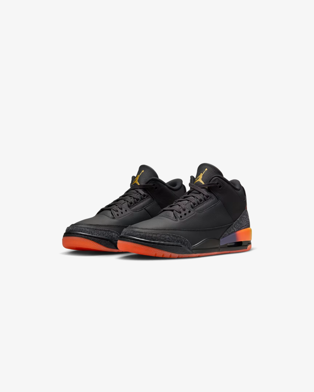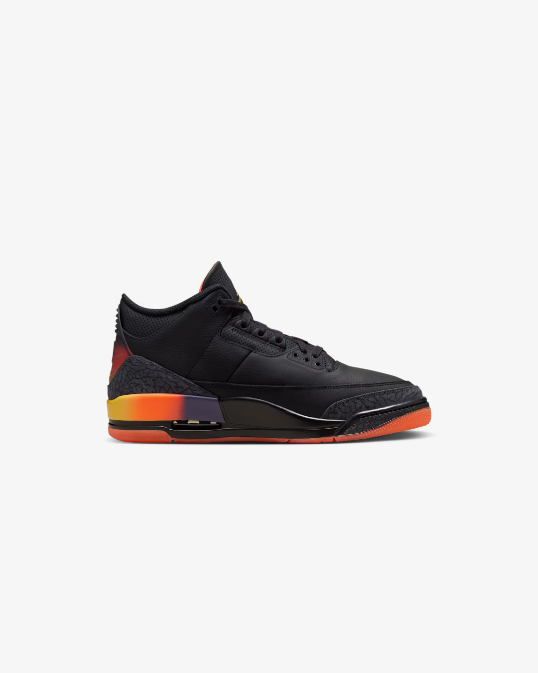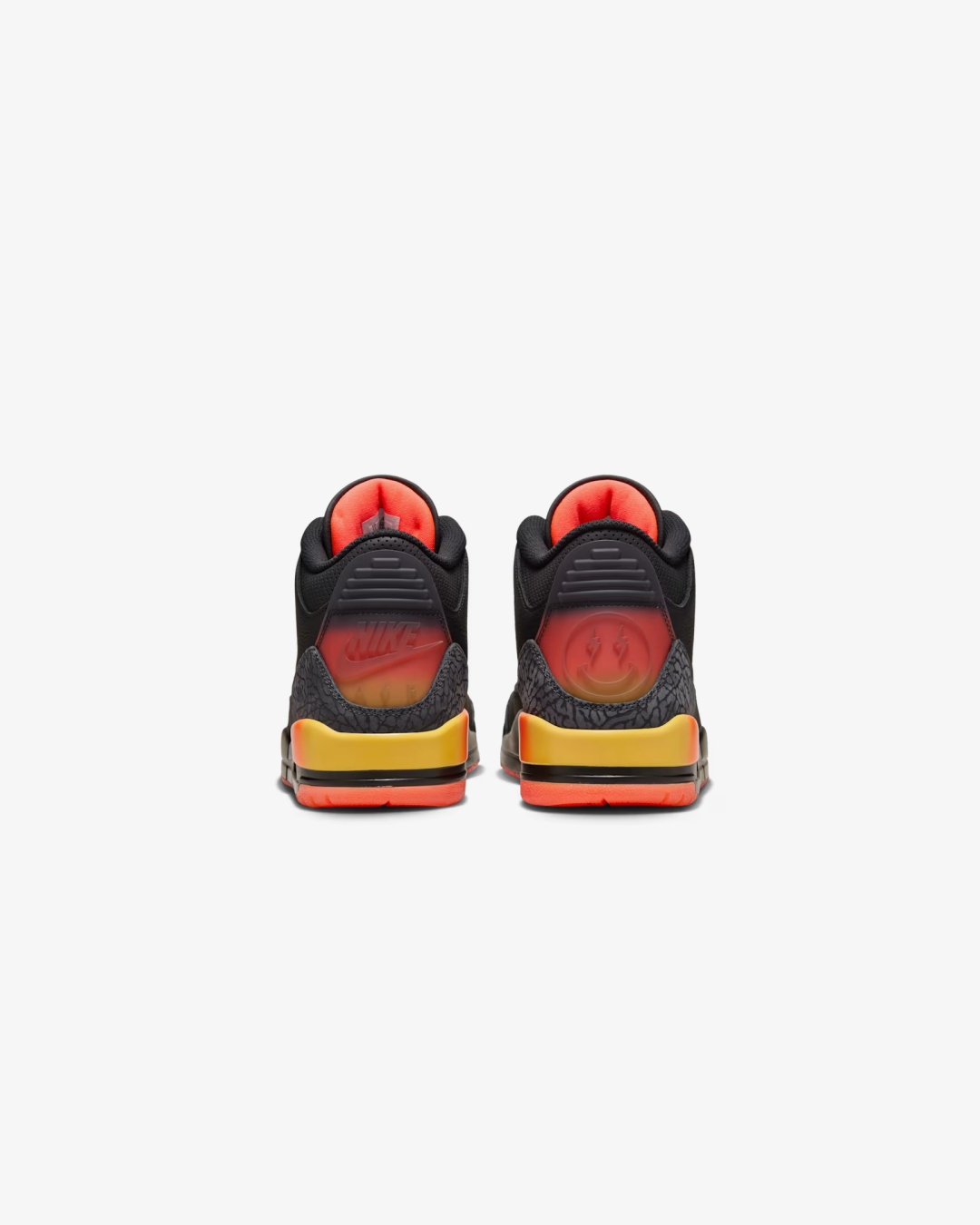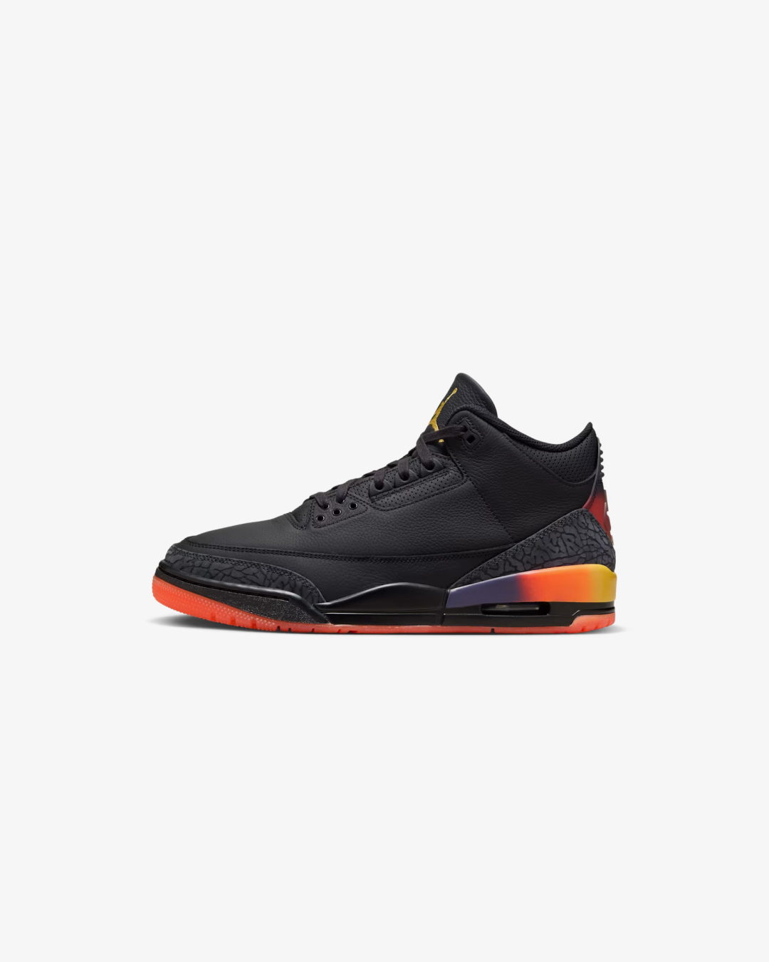 This Air Jordan 3 x J Balvin “Rio” is J Balvin’s fourth collaboration with Jordan Brand and arrives as a tribute to his son, Rio. The sneaker combines a smooth black leather base with gray elephant-print overlays, while the midsole serves a vibrant gradient of sunset hues—from Solar Flare to Total Crimson Abyss—echoing the sunsets over Medellín that inspired its design. Translucent heel tabs feature Nike Air on one shoe and J Balvin’s signature smiley face on the other. Complete with visible Air cushioning, a gold Jumpman on the tongue, special packaging, and a keychain engraved with the message: “A sunset always reminds me, a new day full of opportunity is coming".