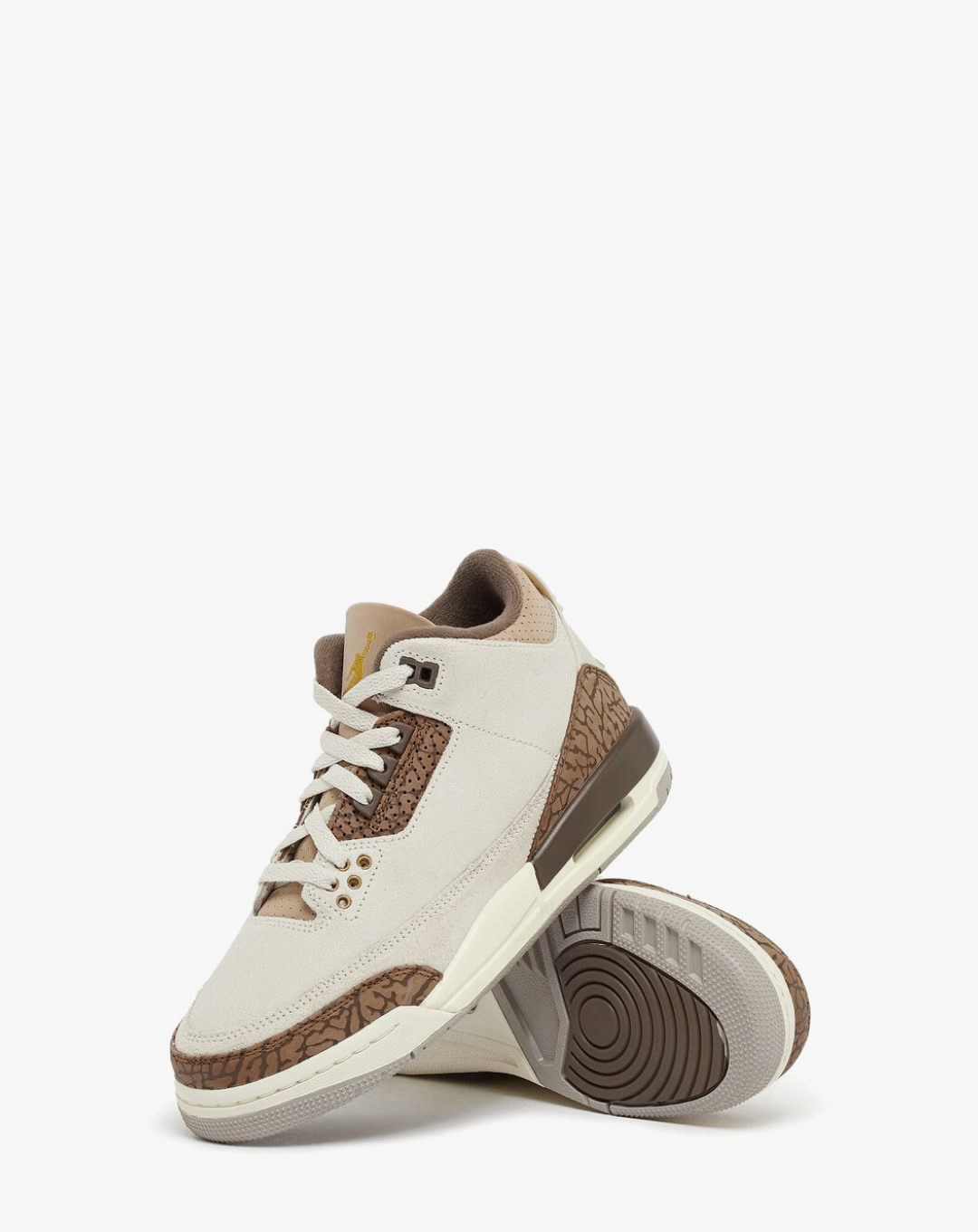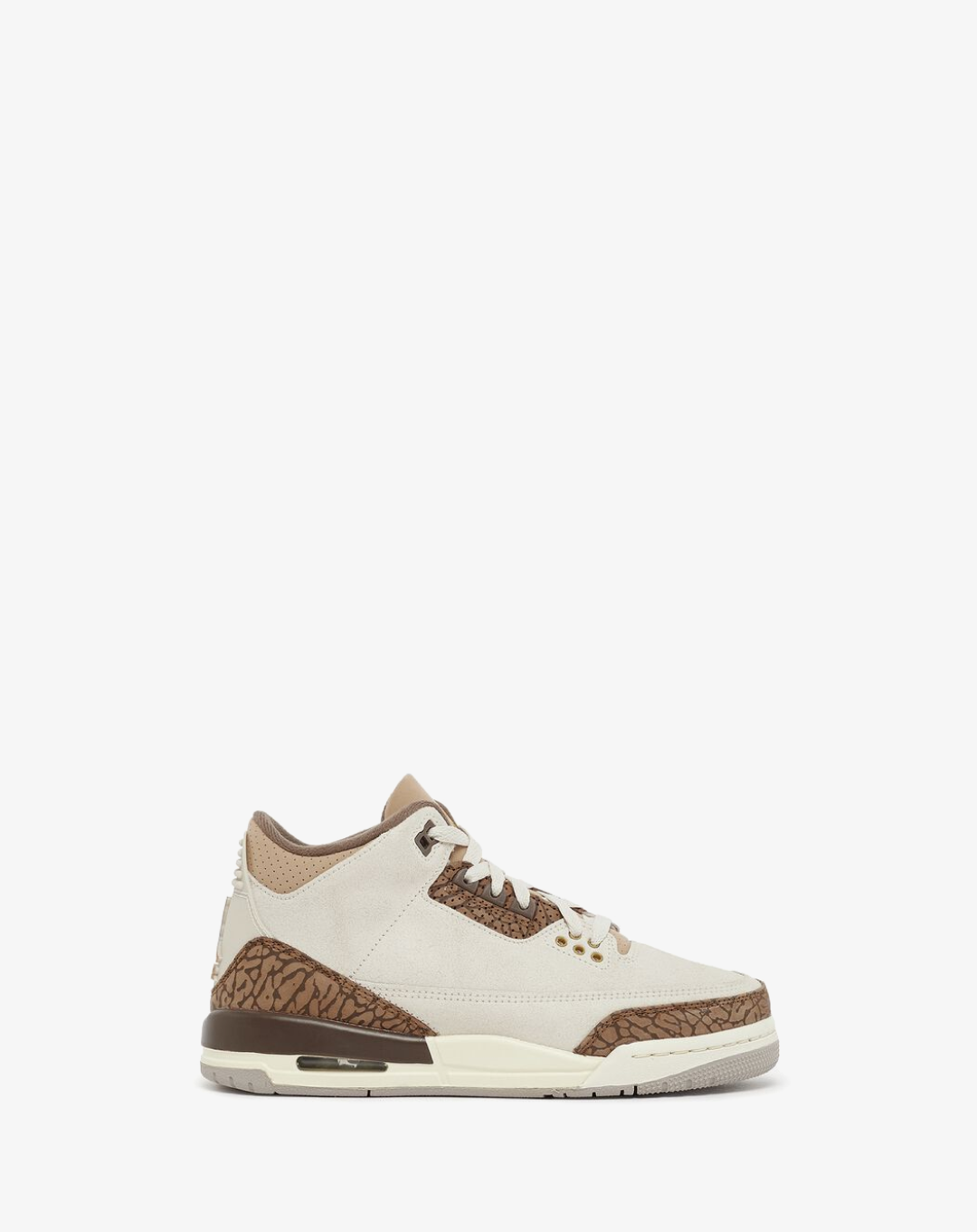 The Air Jordan 3 Retro "Palomino" brings a refined, earthy twist to the classic AJ3 silhouette, blending luxury aesthetics with retro basketball heritage. Featuring a premium suede upper in warm brown tones, this edition exudes an upscale, vintage-inspired appeal. Iconic elephant print overlays on the toe and heel add texture, while metallic gold Jumpman branding on the tongue and heel tab elevates the look with a subtle touch of shine.