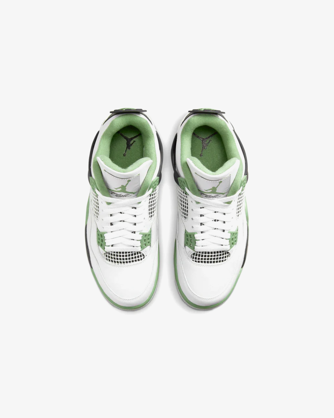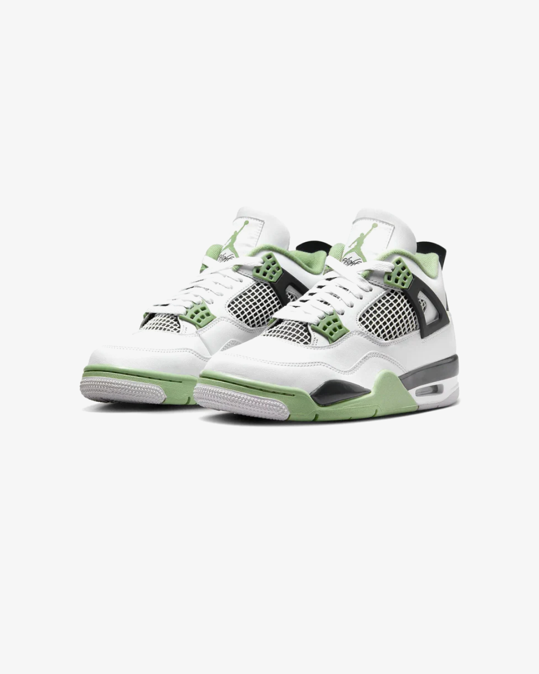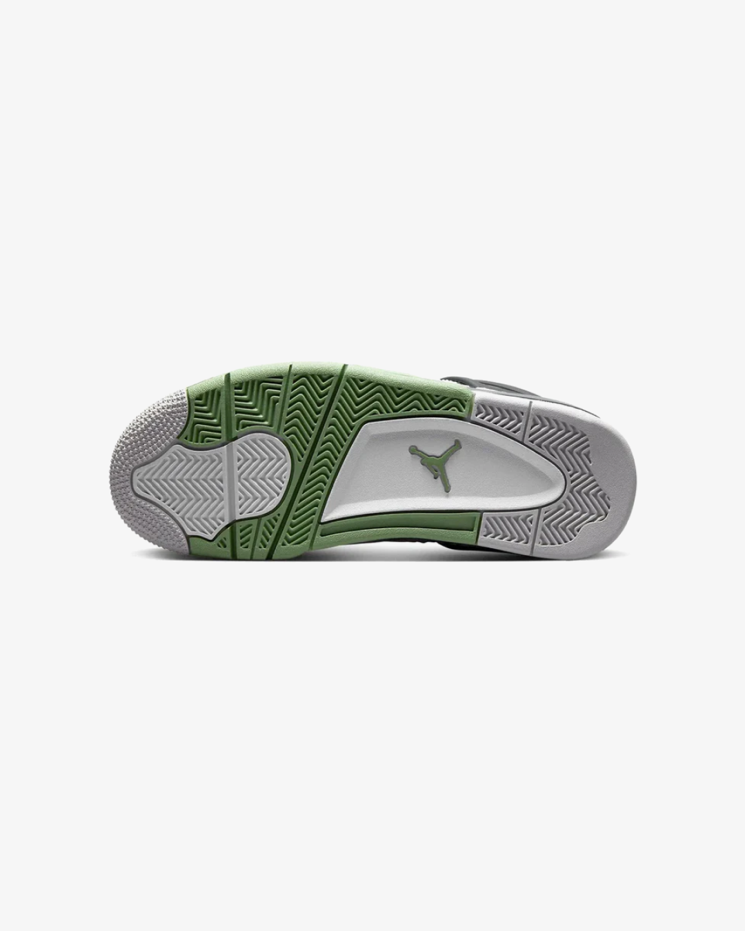 The Air Jordan 4 Retro High 'Seafoam / Oil Green' offers a fresh yet timeless take on the iconic AJ4 silhouette, blending classic design elements with a subtle pop of color. Featuring a smooth white leather upper, the sneaker is accented with Oil Green details on the eyelets, tongue branding, and midsole, giving it a clean yet striking aesthetic. The signature mesh panels and supportive TPU wings stay true to the original 1989 design, while the Air-Sole cushioning in the heel and forefoot ensures all-day comfort. A black outsole and midsole contrast add depth and durability to the sneaker.
