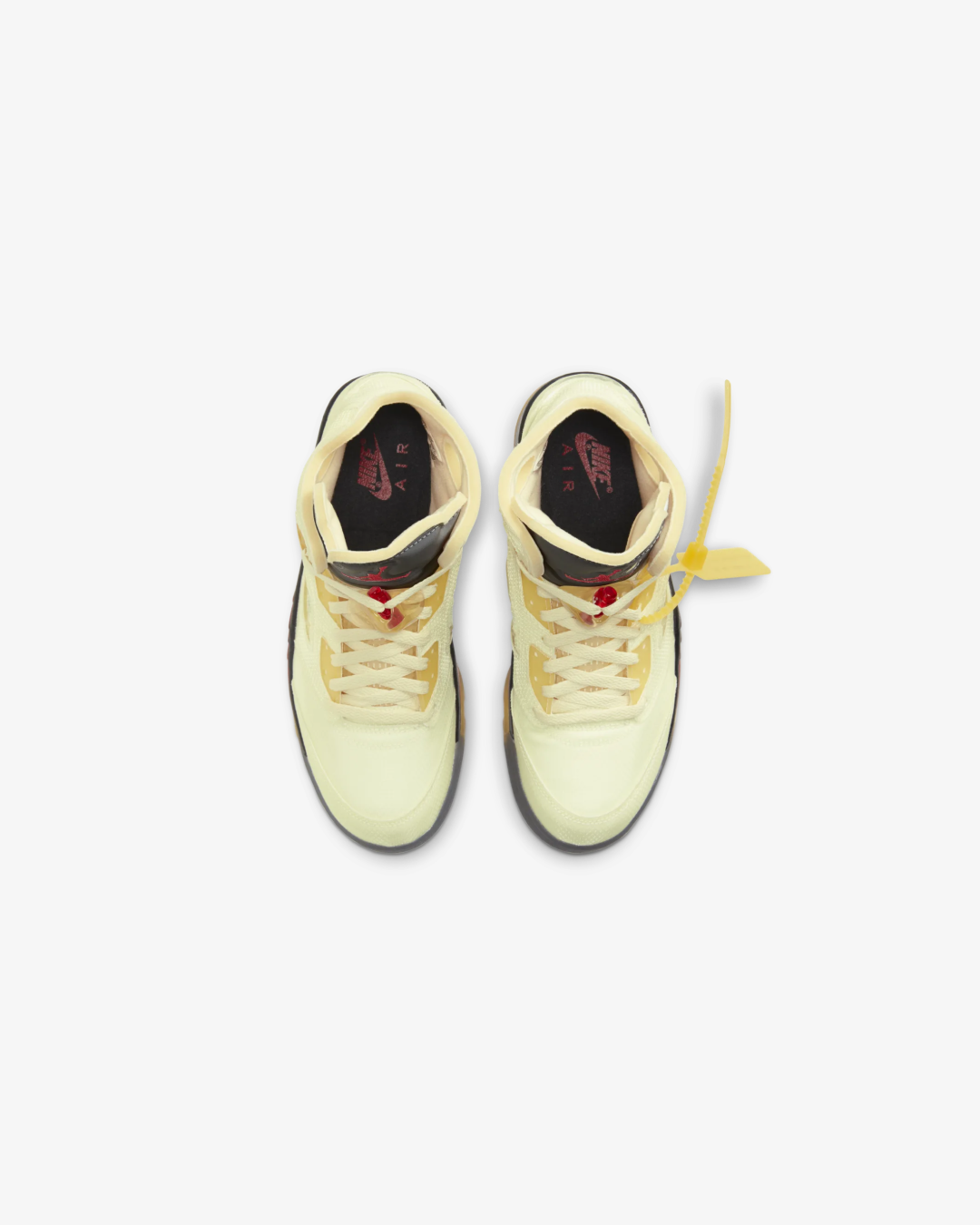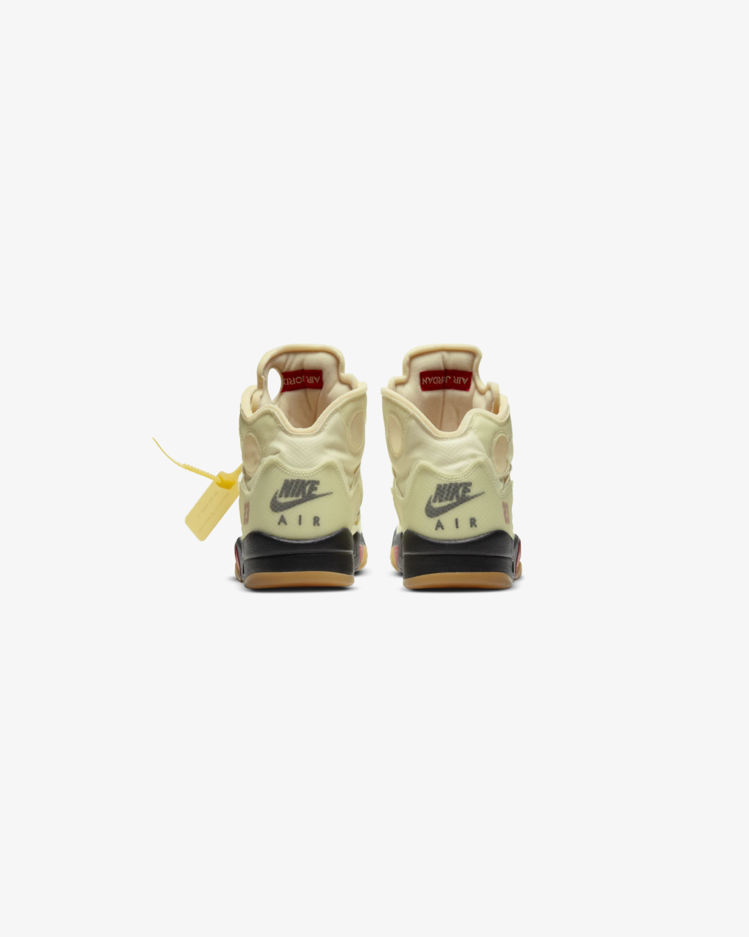 The Air Jordan 5 Retro Off-White 'Sail' Sneakers are a collaboration between Nike and Off-White, designed by Virgil Abloh. These sneakers feature a unique "Sail" colorway with a deconstructed aesthetic that has become synonymous with Off-White. The semi-translucent textile upper, paired with Off-White's signature details like exposed foam and bold branding, gives these shoes a distinct, streetwear-inspired look.