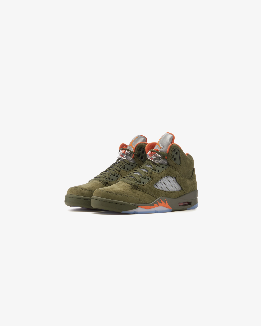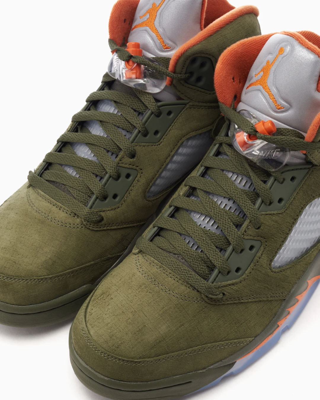 The Air Jordan 5 Retro “Olive” brings a fresh yet classic twist to one of the most iconic silhouettes in the Jordan lineup. Featuring a premium suede upper in a rich olive green, these sneakers are complemented by vibrant orange accents on the midsole and lace locks, creating a striking contrast that adds a pop of color to the refined design.