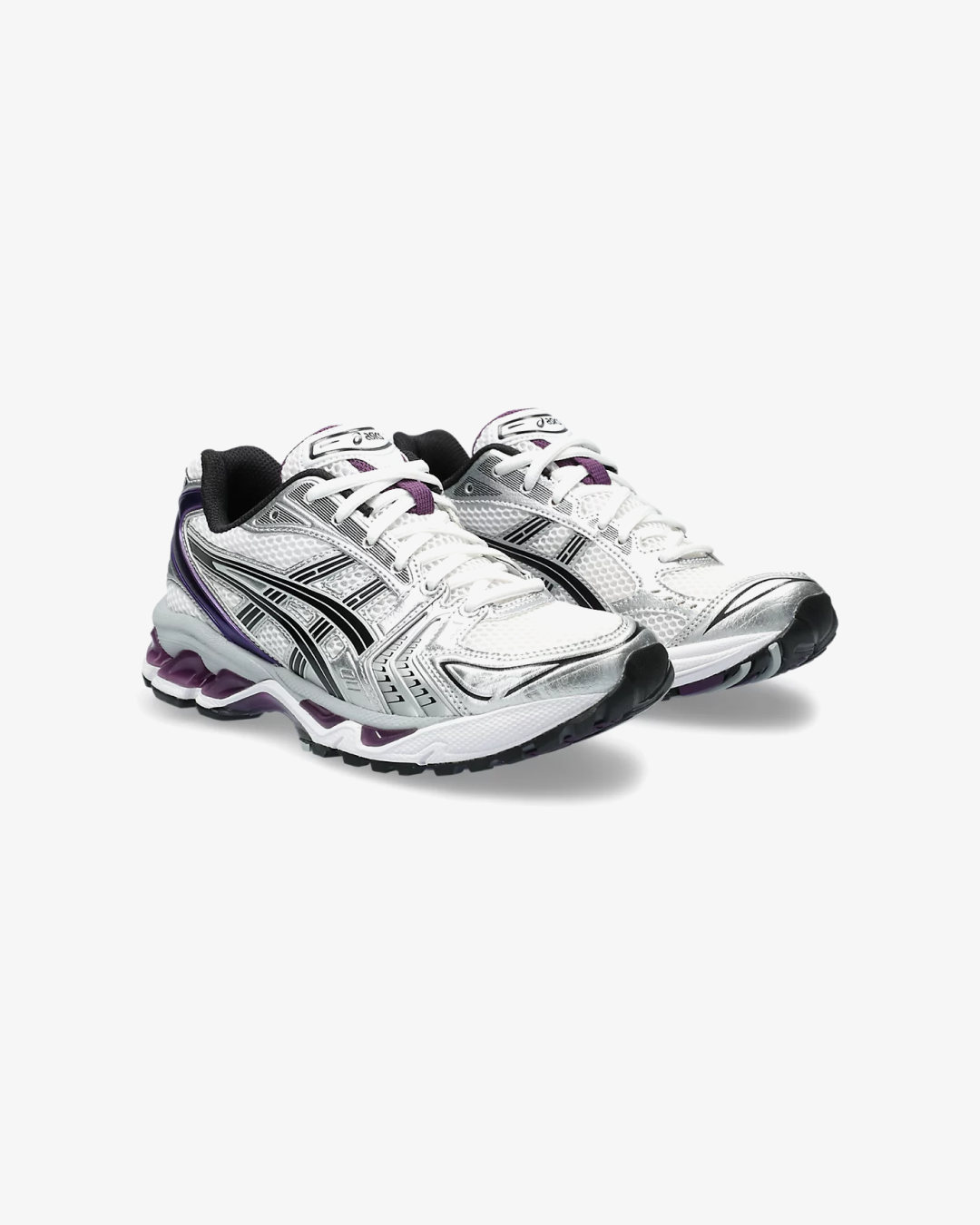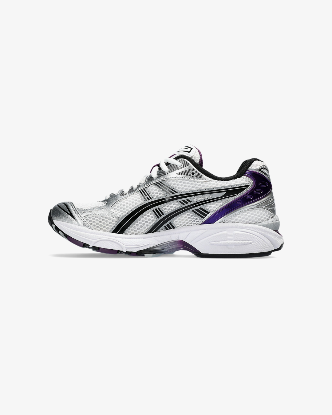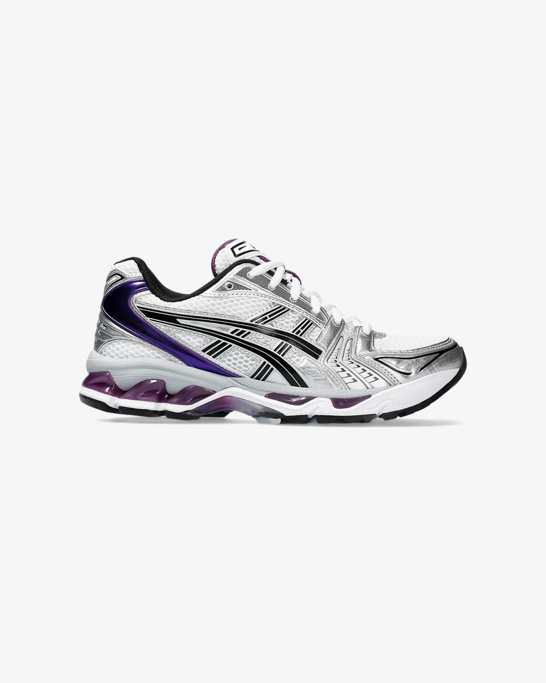 The ASICS GEL-Kayano 14 “White/Dark Grape” is a women's-exclusive release that reimagines the classic 2000s runner with a contemporary twist. This iteration features a clean white mesh base, complemented by metallic silver overlays and subtle black accents. The standout "Dark Grape" hue adds a vibrant touch, appearing on the heel, tongue lining, lace harness, and the exposed GEL cushioning in the midsole. These elements create a layered, futuristic aesthetic that pays homage to the sneaker's heritage.