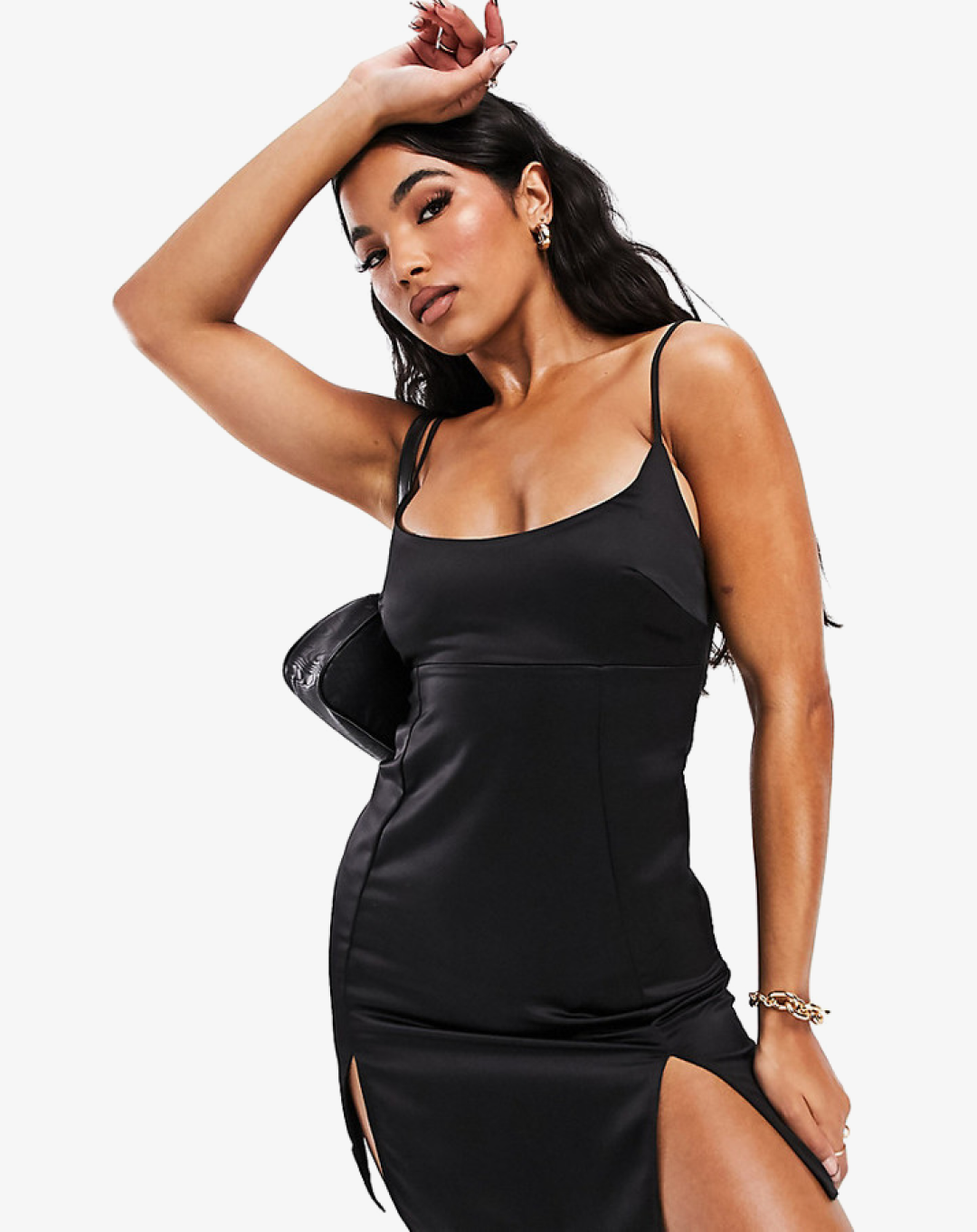 Pair this stunning black satin dress with high heels and bold accessories for a chic evening look or tone it down with a cropped jacket and boots for a more casual approach.