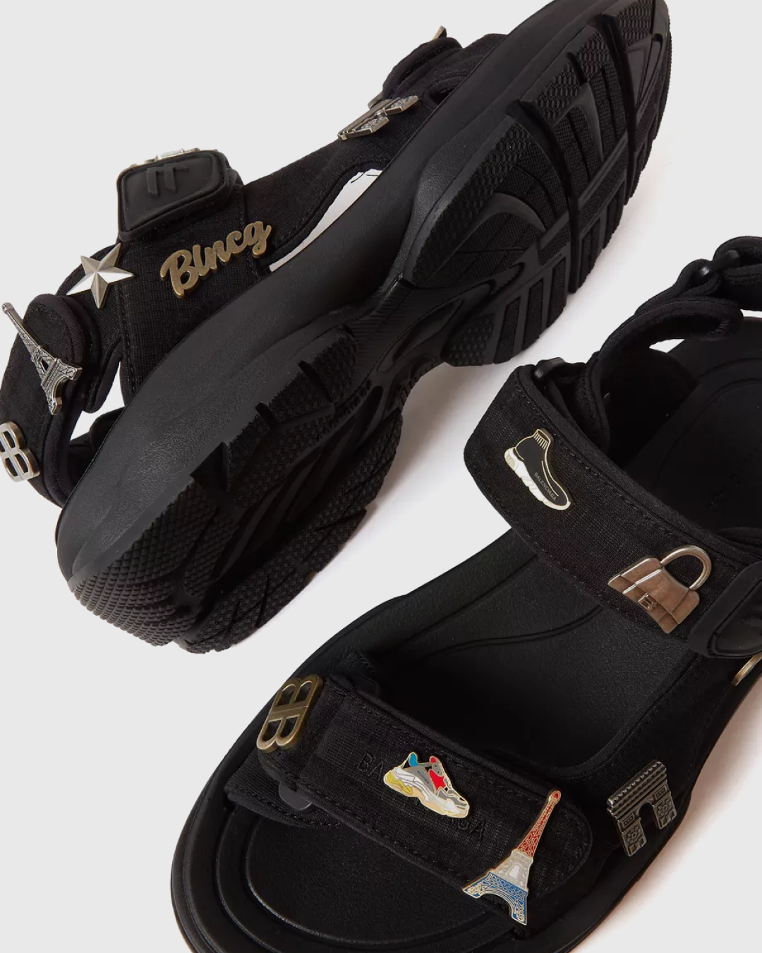 Taking its wearer on a trip to the Balenciaga's headquarters, the design's velcro straps are accented with pins of iconic Parisian sights as well as the label's mainstays.