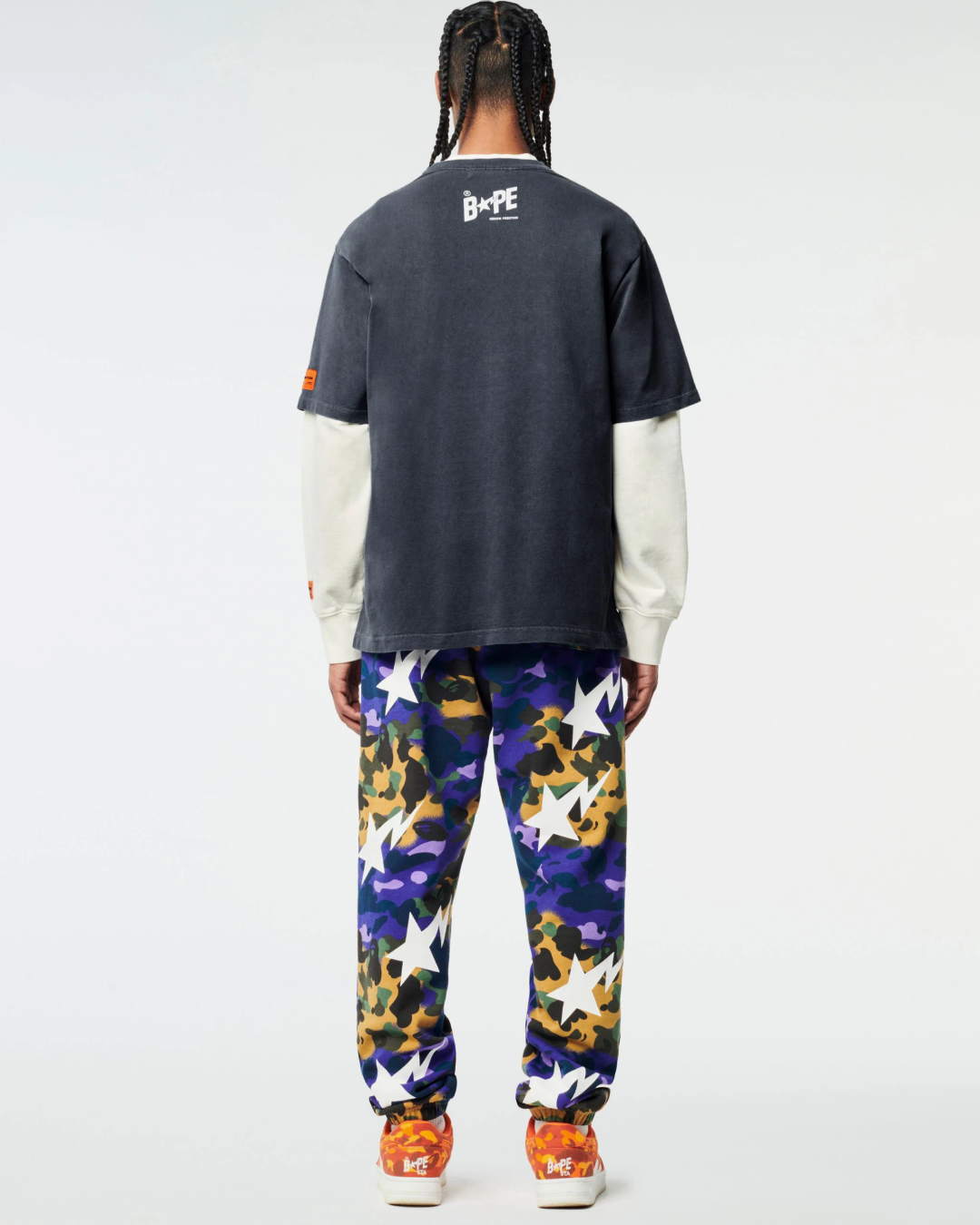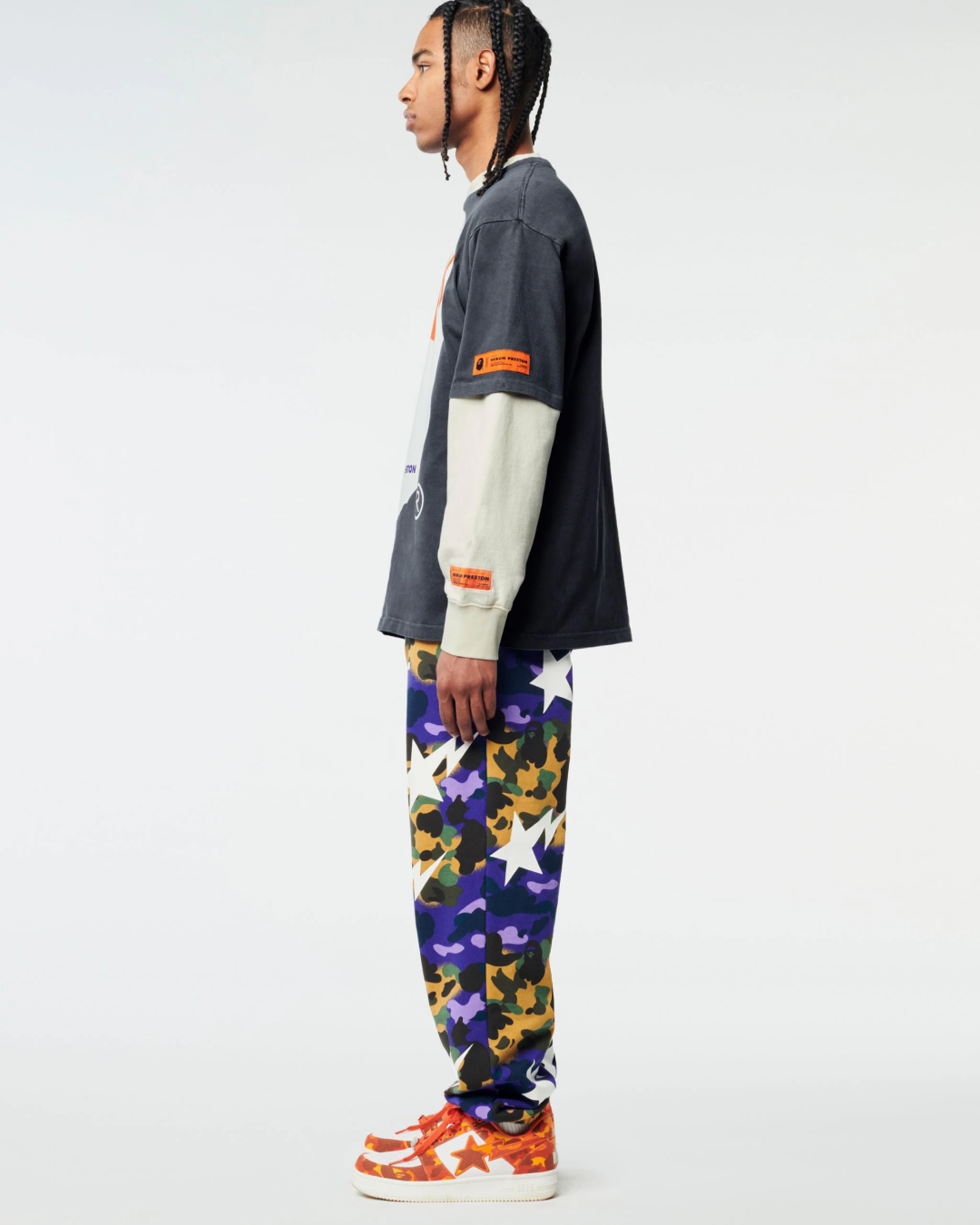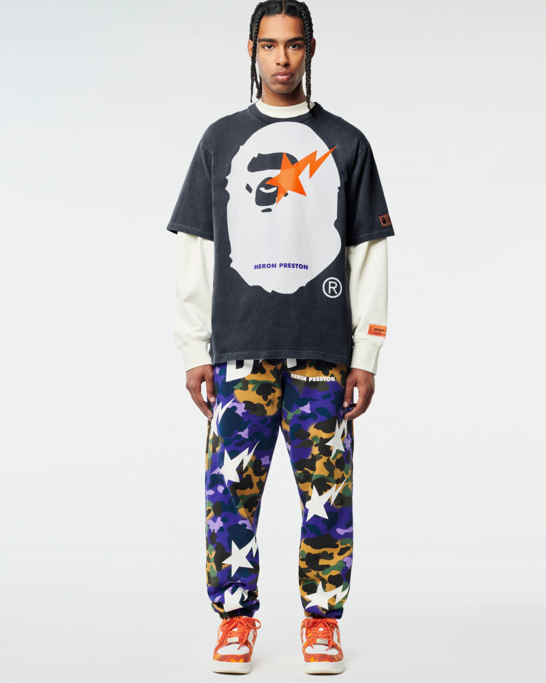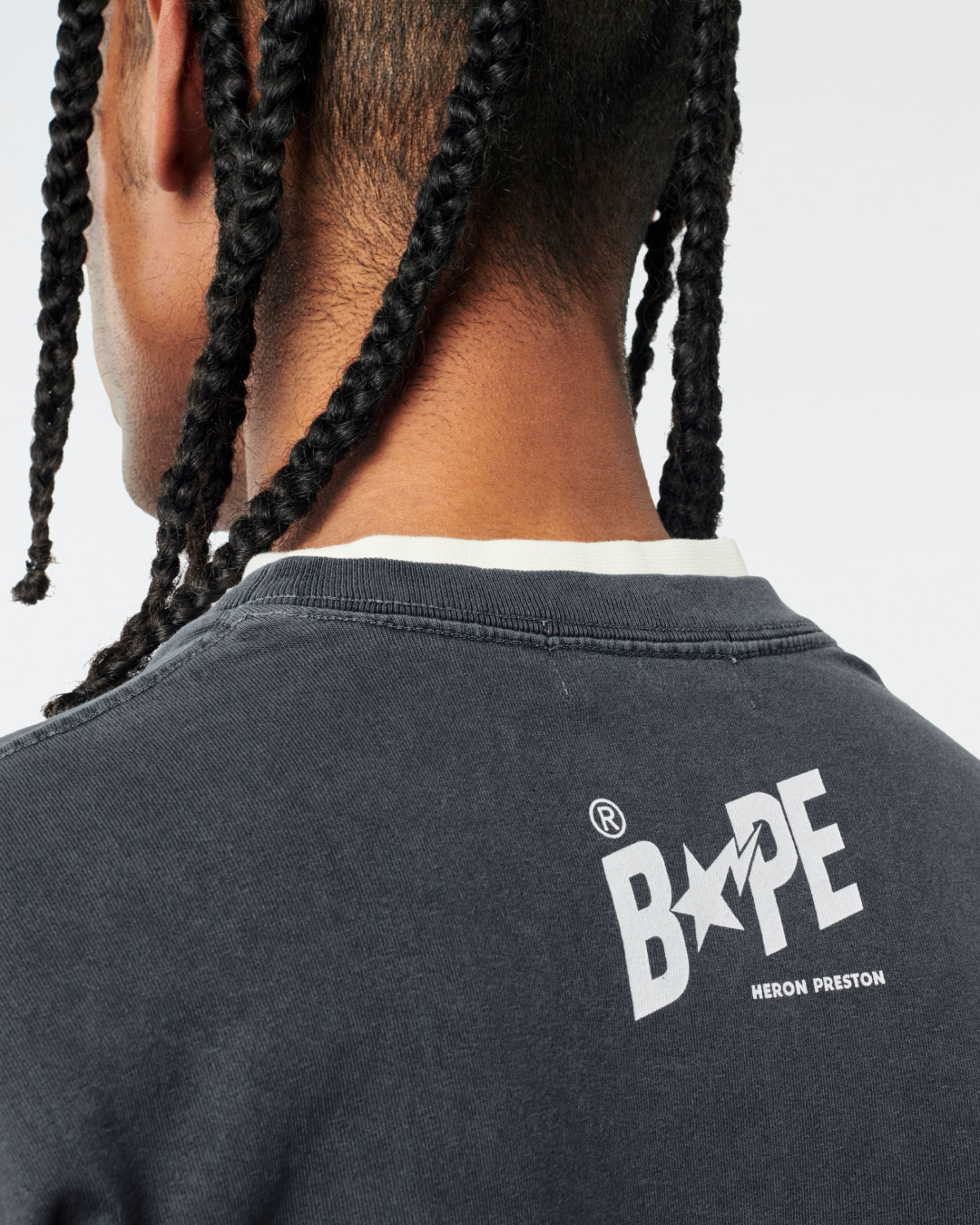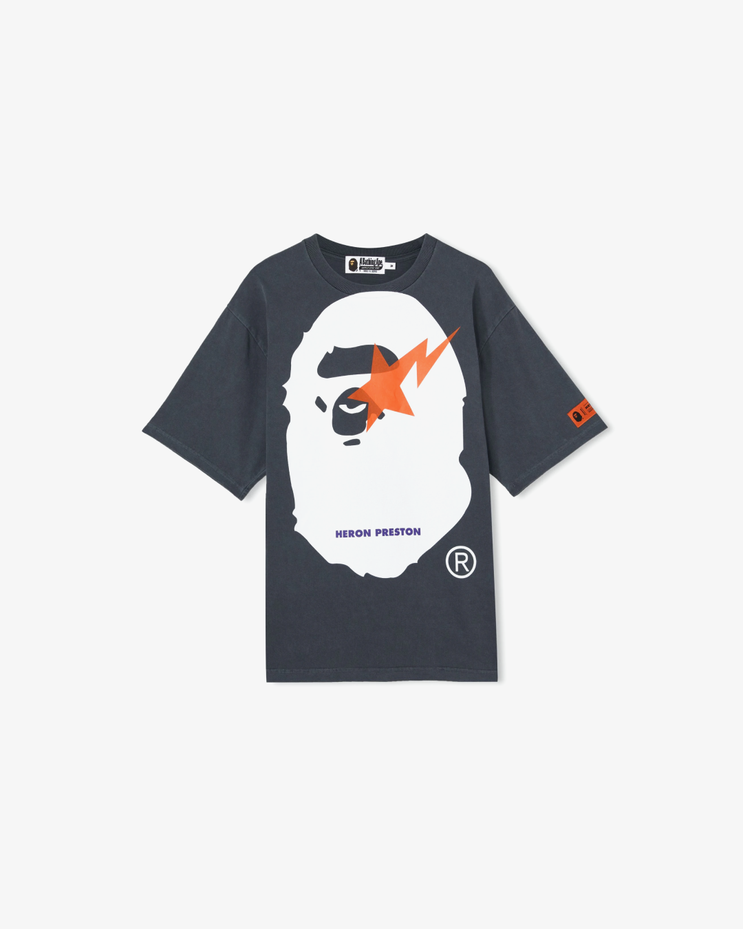 The BAPE x Heron Preston T-Shirt is a collaboration that merges the iconic streetwear elements of A Bathing Ape (BAPE) with the utilitarian, high-fashion aesthetics of Heron Preston. This T-shirt is likely to feature bold graphics, including BAPE’s signature camo patterns or iconic Ape Head logo, combined with Heron Preston’s industrial-inspired design touches, such as bold typography, patches, or reflective accents.  The T-shirt will typically be made from premium materials, offering a comfortable fit, with limited-edition design features that reflect both brands' distinct identities. Expect a modern streetwear piece that stands out through its creative fusion of two influential fashion forces. Ideal for pairing with sneakers, cargo pants, or other statement pieces.