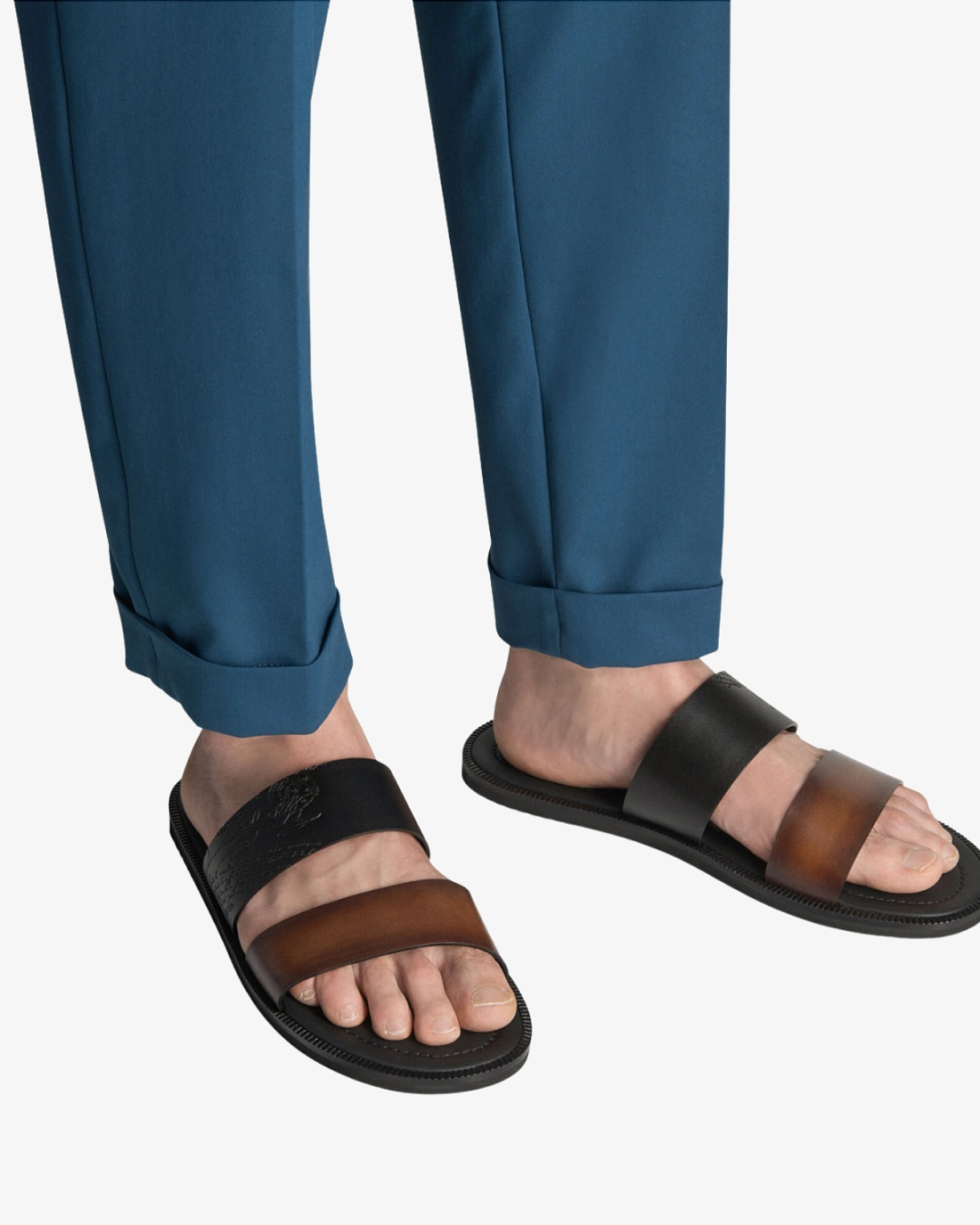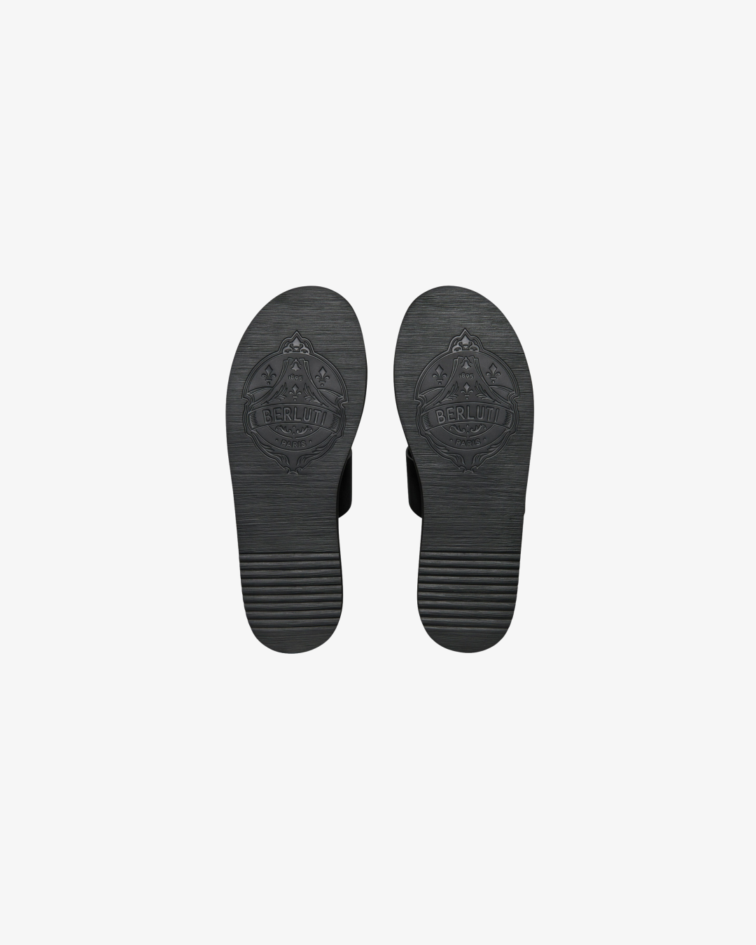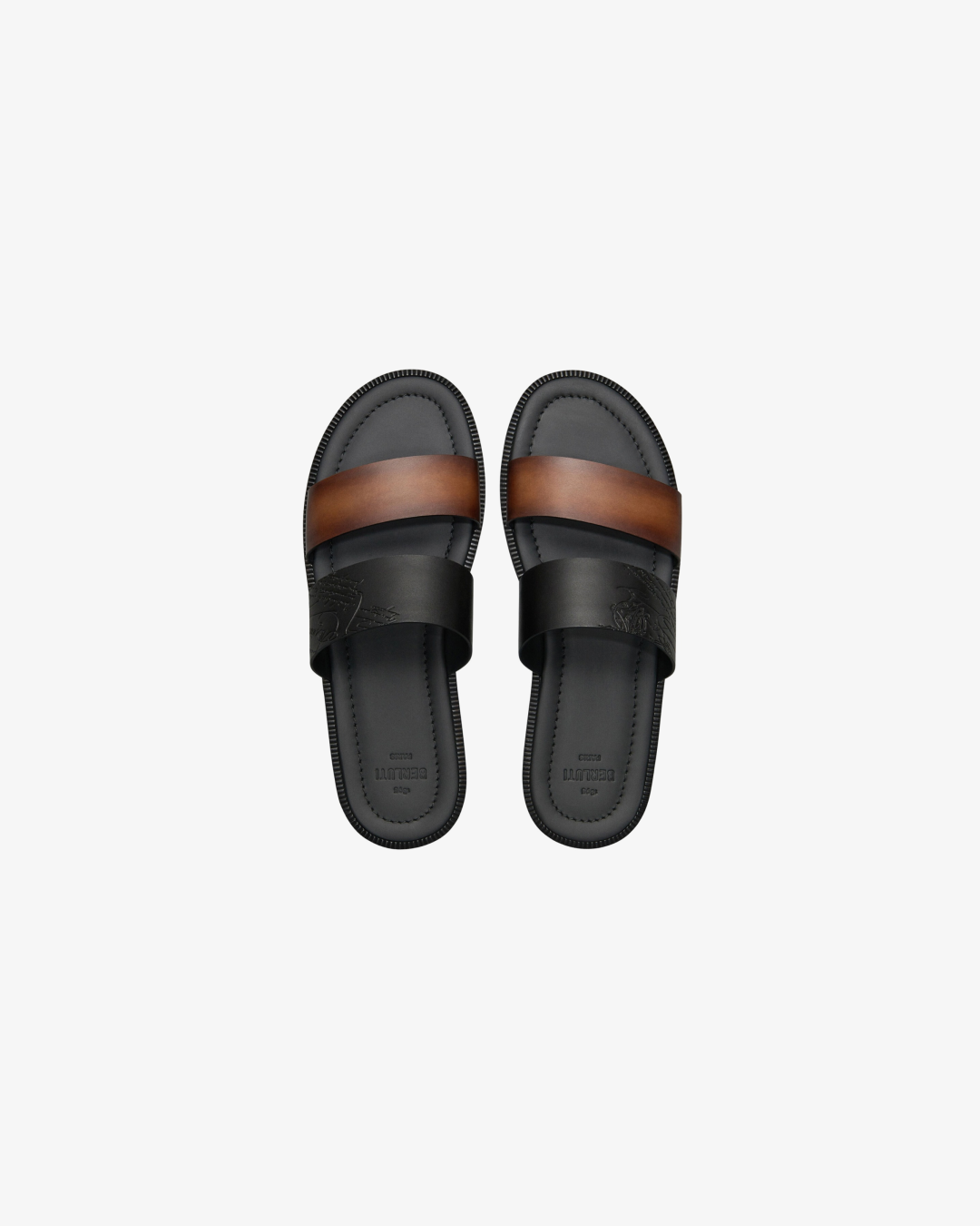 The standout feature of these sandals is the debossed Berluti logo on the strap, adding a subtle yet sophisticated touch of branding. The wide leather straps are designed for a comfortable fit, while the open-toe silhouette ensures breathability and ease during warm weather. The sandals also feature a leather-lined footbed, offering a luxurious feel with every step, and a rubber outsole for added durability and grip.