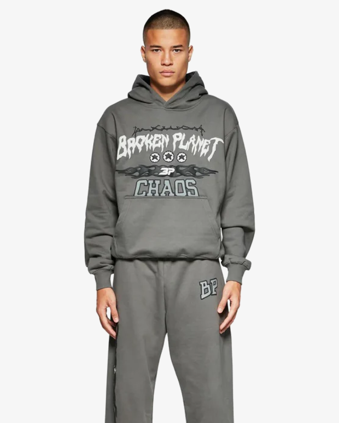 The Broken Planet Chaos Tracksuit is a standout piece from the streetwear brand, known for its bold, edgy designs and sustainable approach. This hoodie typically features an oversized fit, perfect for layering, and is crafted from high-quality, organic cotton for both comfort and durability. The design often includes striking graphic elements or text, with "Chaos" being a prominent theme, reflecting the brand's rebellious and unconventional aesthetic. Ideal for casual wear, this hoodie combines comfort with an urban street style, making it a must-have for those who appreciate unique, statement clothing pieces.