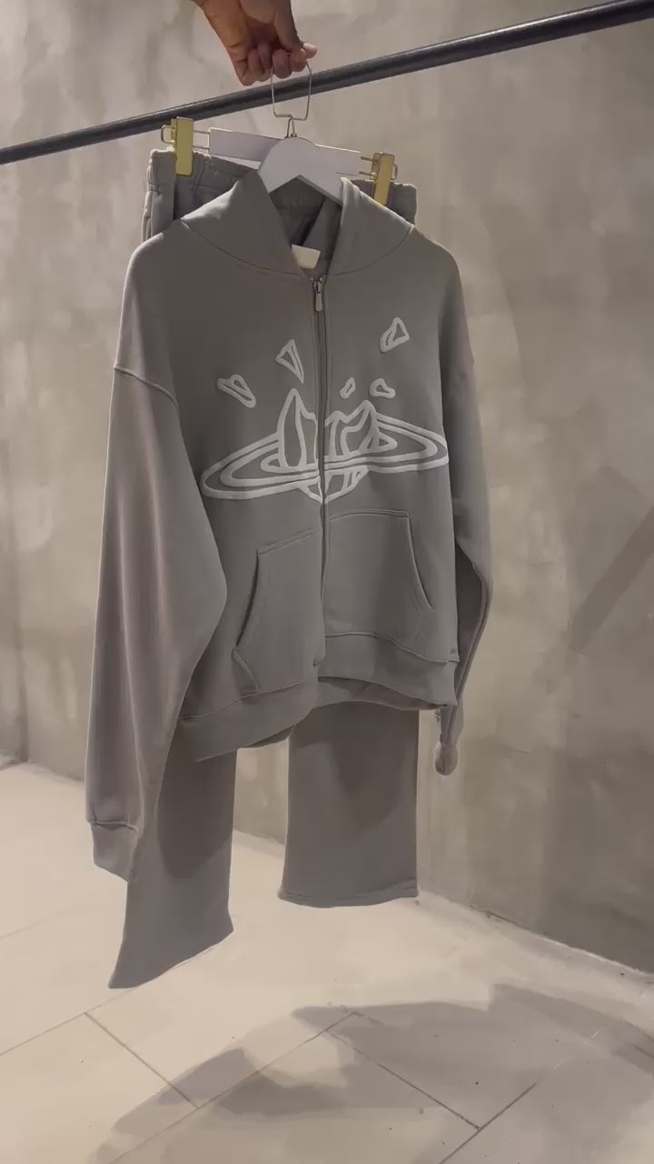 This tracksuit features a soft, heather grey fabric that offers a relaxed and cozy fit, making it ideal for lounging or on-the-go wear. The set includes a hoodie with an adjustable drawstring and matching joggers with an elastic waistband, both designed with subtle branding and minimalist detailing for a clean, modern look.