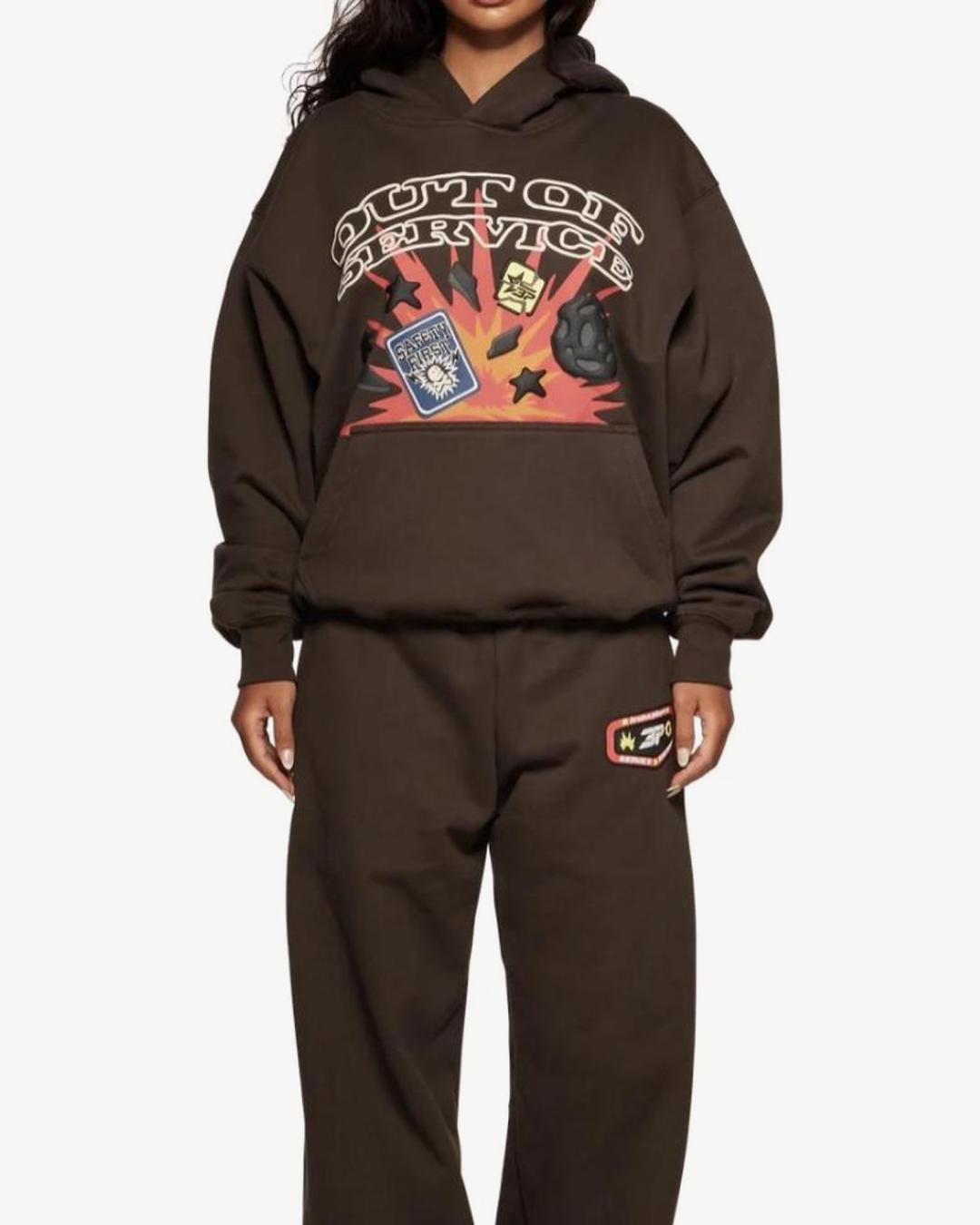 The tracksuit's eye-catching design and attention to detail make it a standout piece, perfect for those who appreciate fashion that breaks the mold. Whether you're lounging or hitting the streets, the Broken Planet "Out of Service" Tracksuit ensures you do so in style.