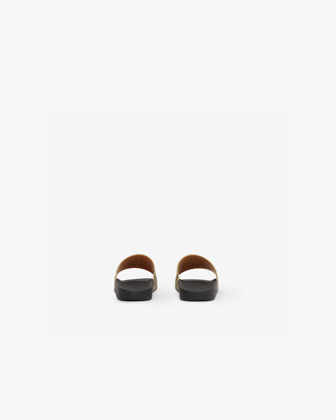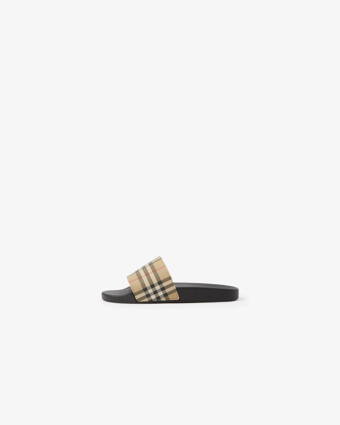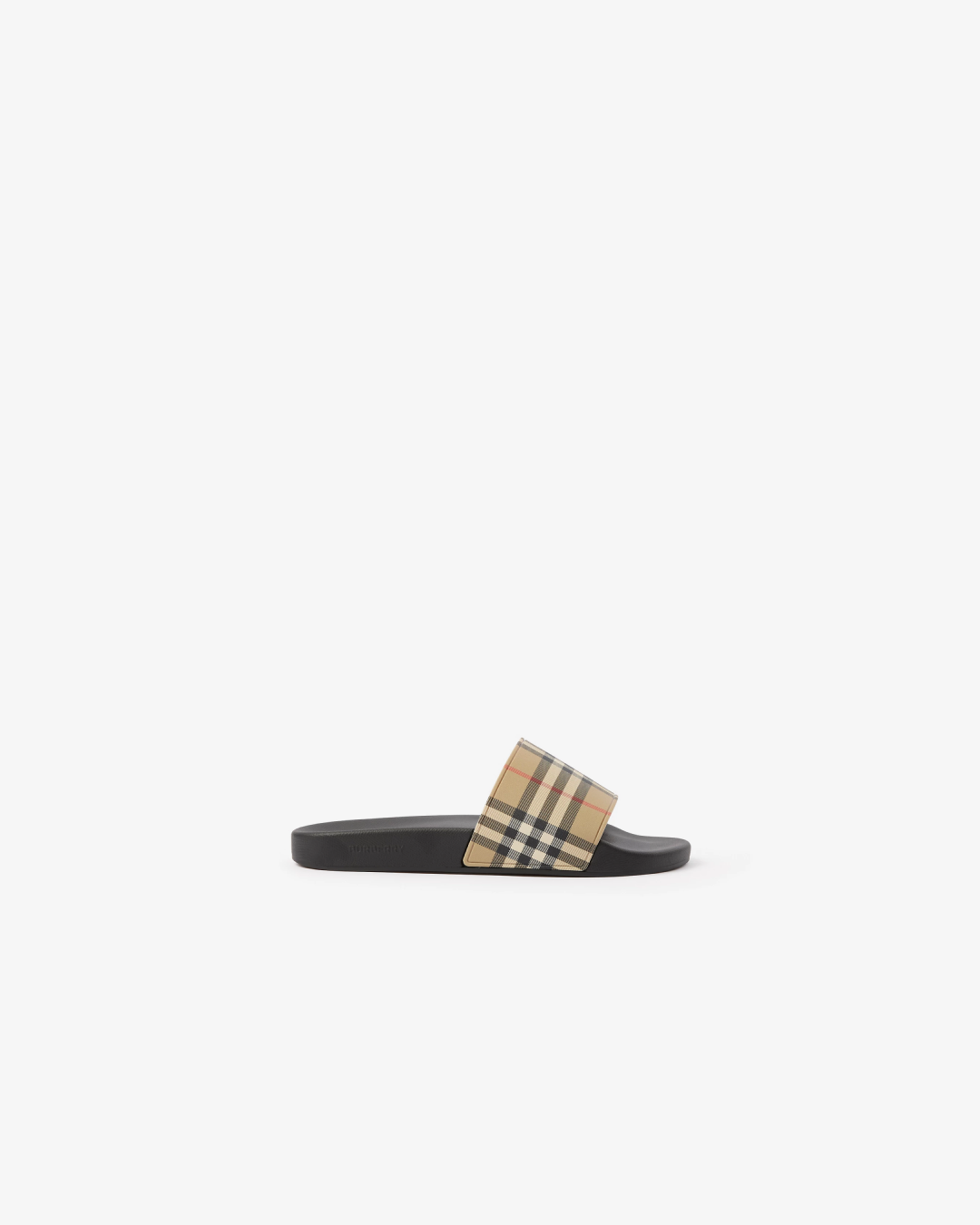 The Burberry Check Dive Slides are a luxurious reinterpretation of classic pool slides, showcasing the brand’s iconic heritage in a sleek design. Crafted from durable thermoplastic polyurethane, the uppers are printed with the signature Burberry Check pattern, while the contoured insole features the equestrian Knight emblem subtly molded beneath your foot for a discreet touch of elegance