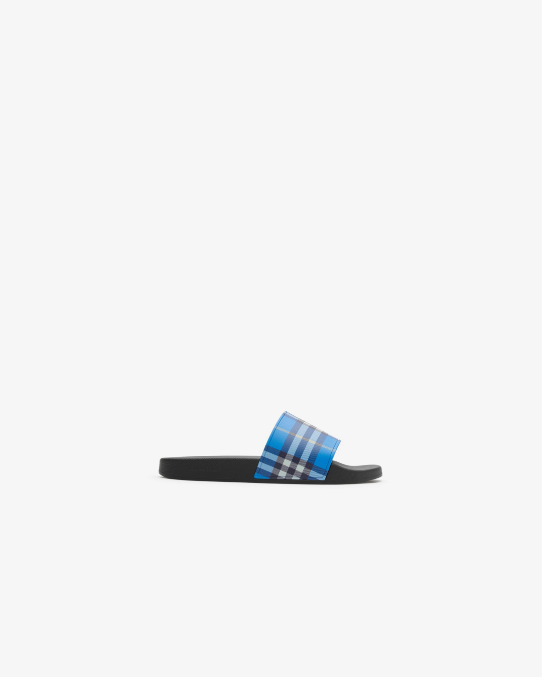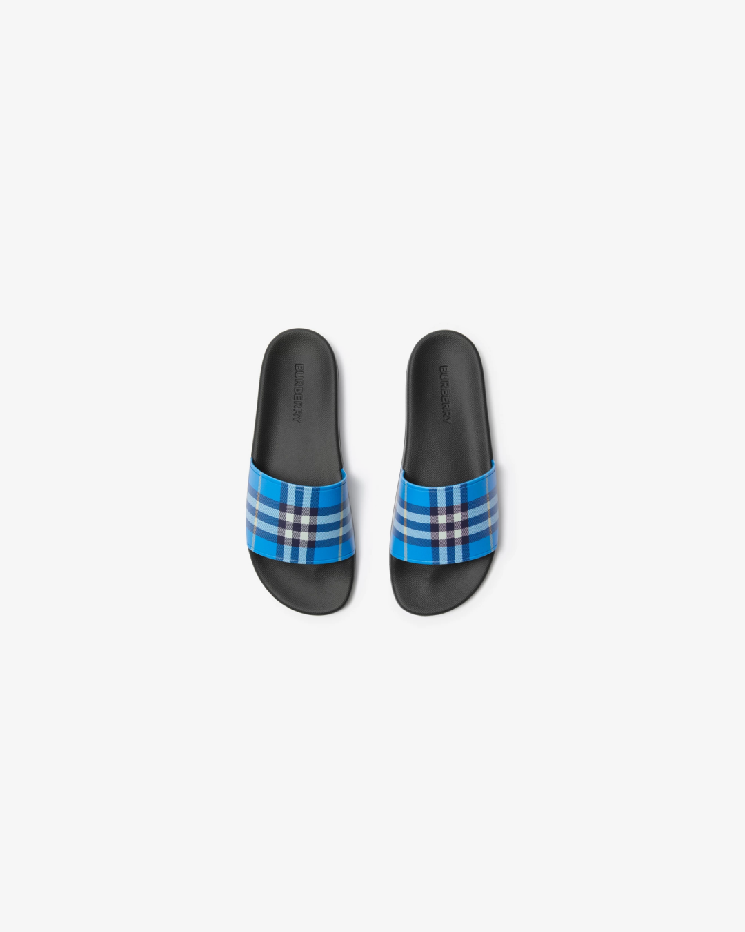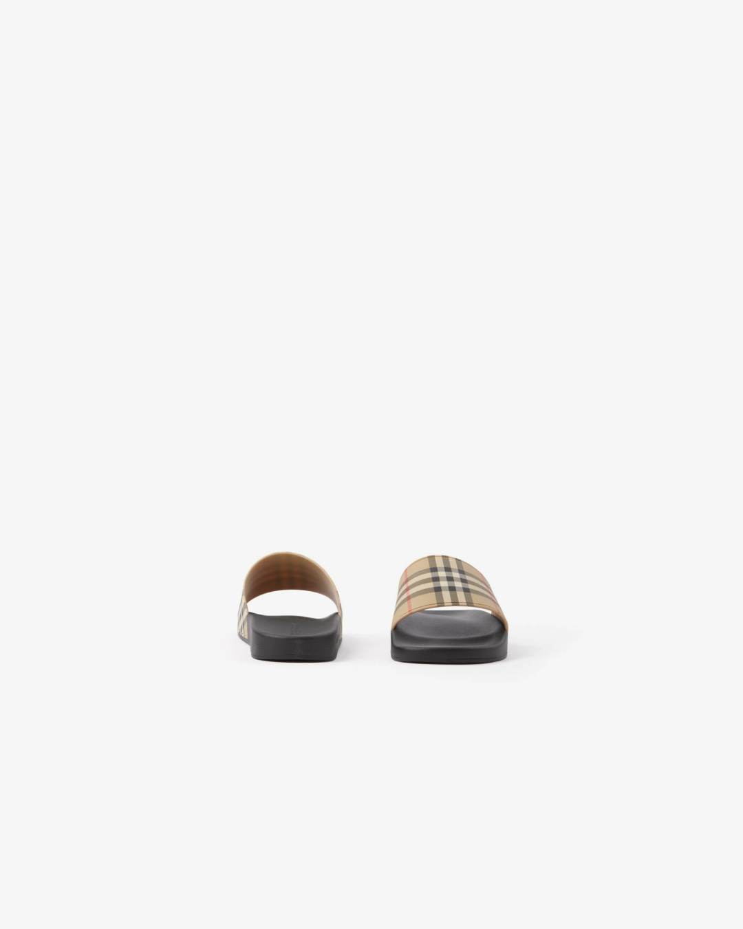 The Burberry Check Dive Slides are a luxurious reinterpretation of classic pool slides, showcasing the brand’s iconic heritage in a sleek design. Crafted from durable thermoplastic polyurethane, the uppers are printed with the signature Burberry Check pattern, while the contoured insole features the equestrian Knight emblem subtly molded beneath your foot for a discreet touch of elegance