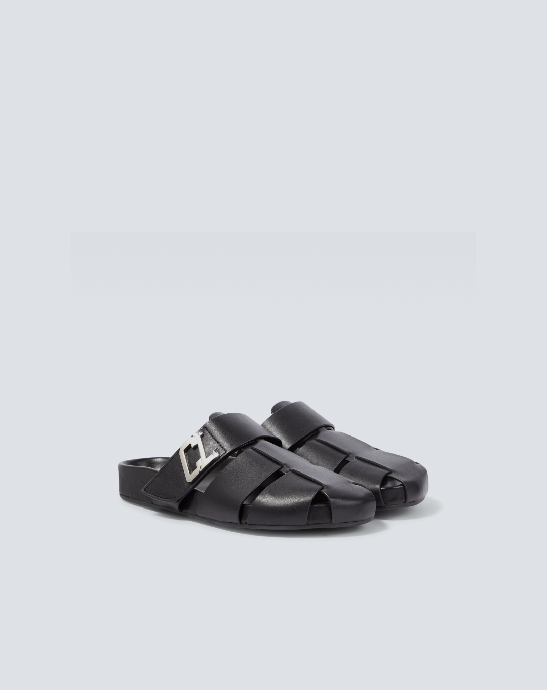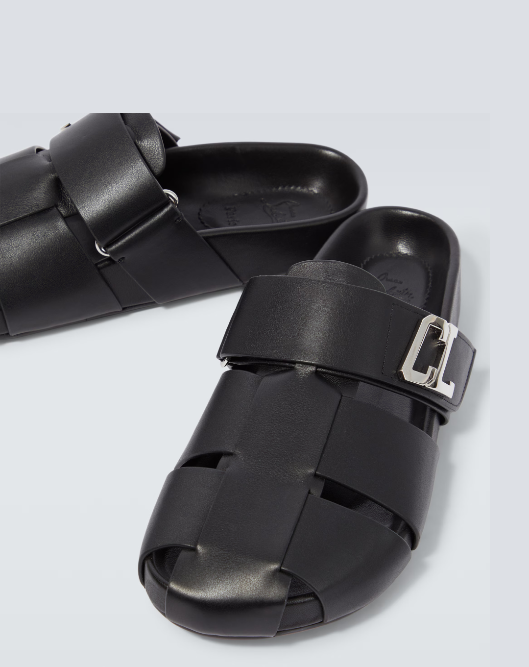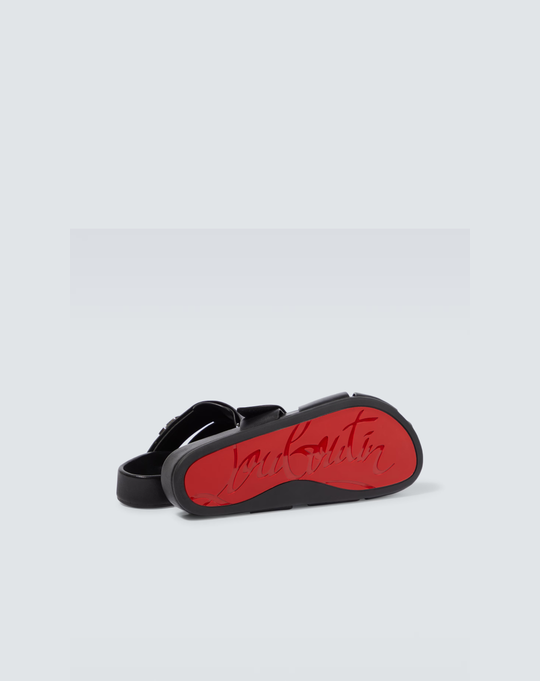 The Christian Louboutin Abubizz Leather Slippers offer a luxurious and contemporary take on casual footwear. Crafted from smooth black calf leather, these sleek mules are designed on the Maison’s Bizz last, providing a lightweight sole that molds comfortably to your foot while offering subtle height and superior cushioning. The design features three wide leather straps, with the top strap showcasing a hook-and-loop closure adorned with a CL monogram, delivering both style and functionality. The iconic red sole adds a signature touch, ensuring these slippers stand out in any setting.