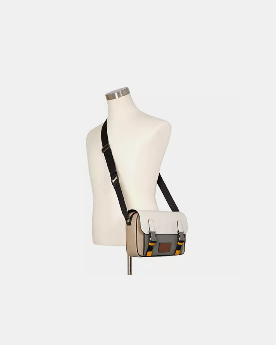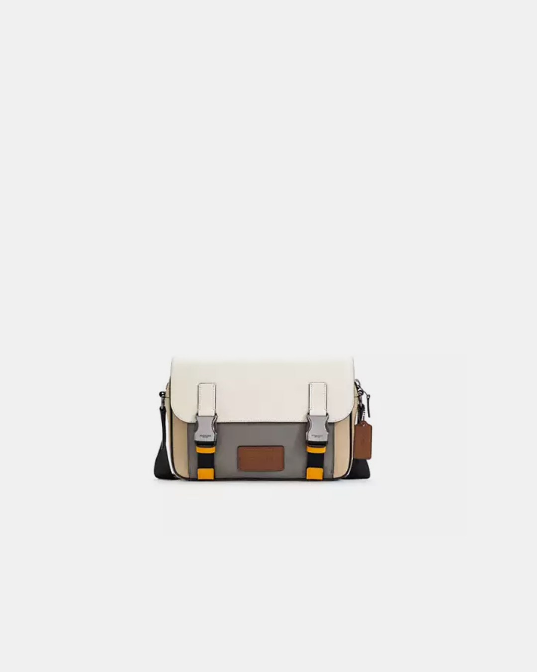 The COACH Track Crossbody Bag in Colorblock is a sleek and functional everyday essential, reimagined with a bold mix of colors for extra edge. Crafted from refined pebble leather and smooth glovetanned leather, this bag features modern colorblocking that adds visual depth to its compact, structured silhouette. Designed for versatility, it includes an adjustable webbed strap, an exterior zip pocket for quick access, and an organized interior that fits your phone, wallet, keys, and more. Finished with subtle Coach branding, this piece balances sporty utility with downtown polish.