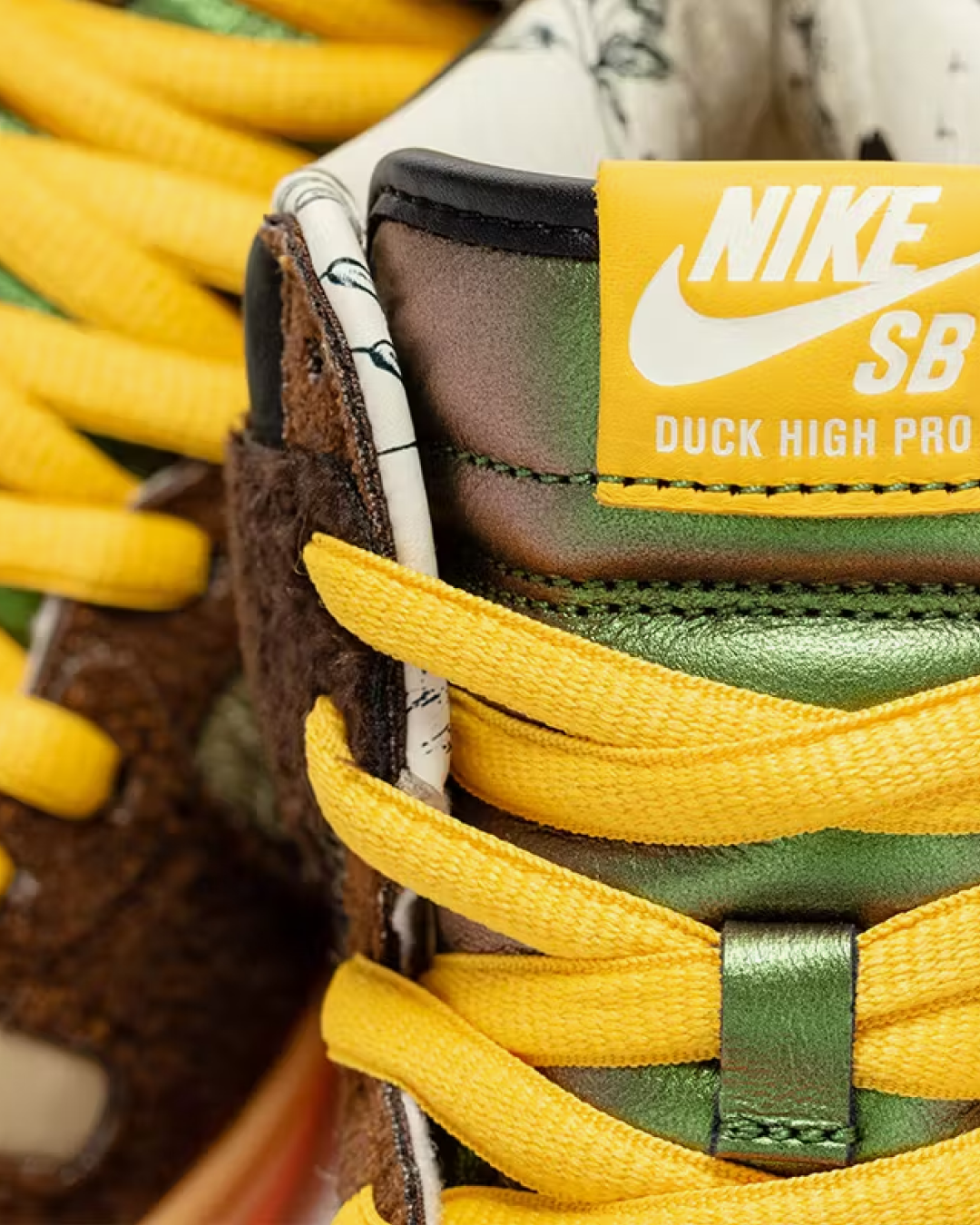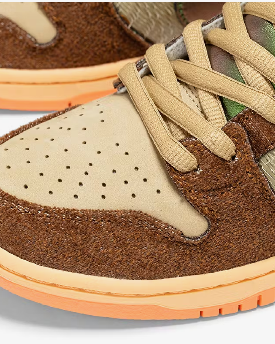 The upper combines iridescent materials, suede, and leather in earthy tones, creating a playful yet sophisticated look. Inside, the plush lining ensures comfort, while the iconic SB Dunk High silhouette offers durability and support. Complete with custom insoles and special packaging, the 'Turdunken' sneakers are a must-have for collectors and sneaker enthusiasts who appreciate a blend of fun and fashion.