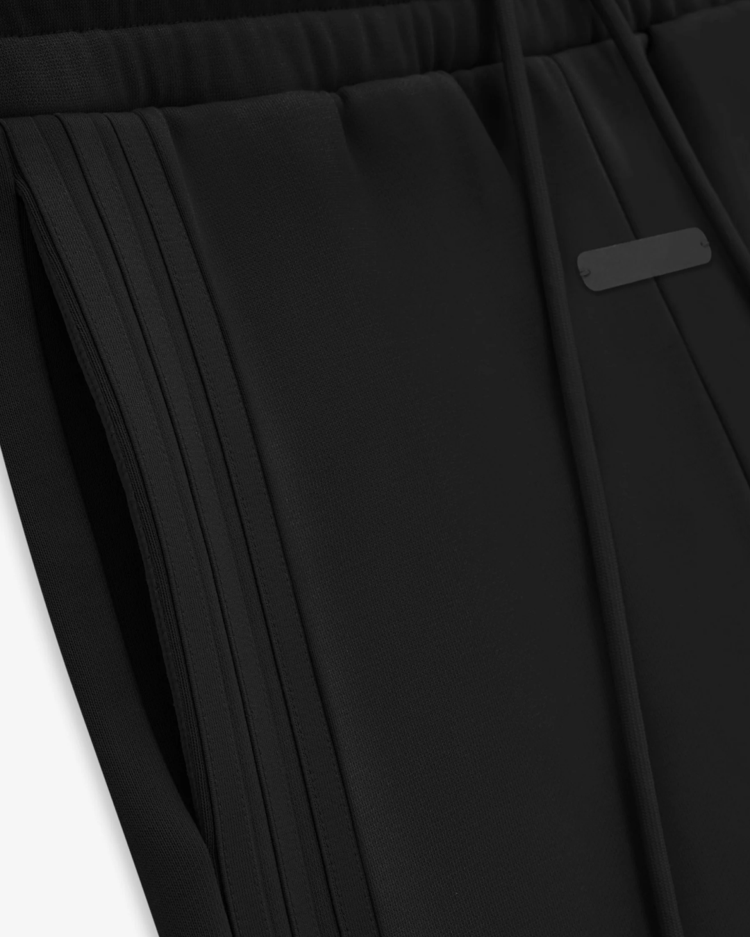 Functional details include an elastic waistband with drawcord, side seam pockets with perforated 4-way stretch lining, and a bottom hem with elastic binding. Branding is defined by an adidas logo on the leg and a sueded black bar label on the center front.