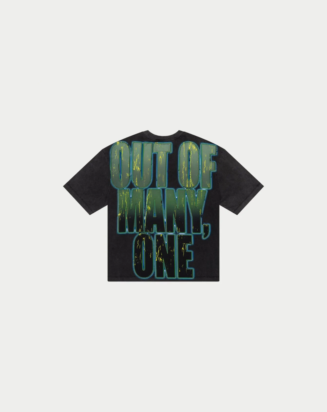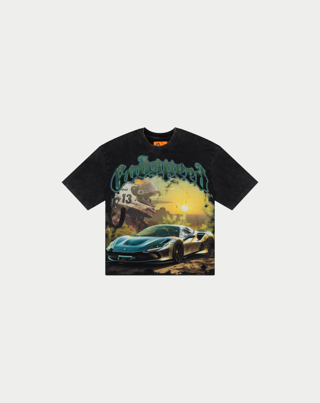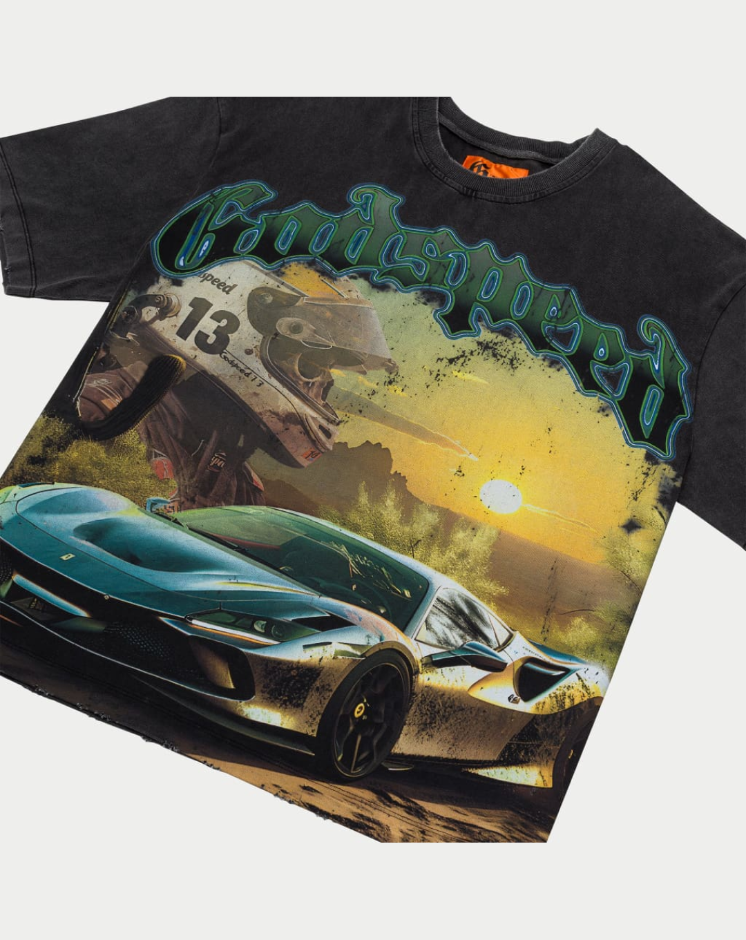 The front features a striking GODSPEED graphic, designed with intricate detailing and high-contrast colors that command attention. The artwork blends futuristic elements with vintage-inspired typography, creating a visually captivating design. A ribbed crewneck ensures durability, while the double-stitched seams add to the tee’s long-lasting quality.