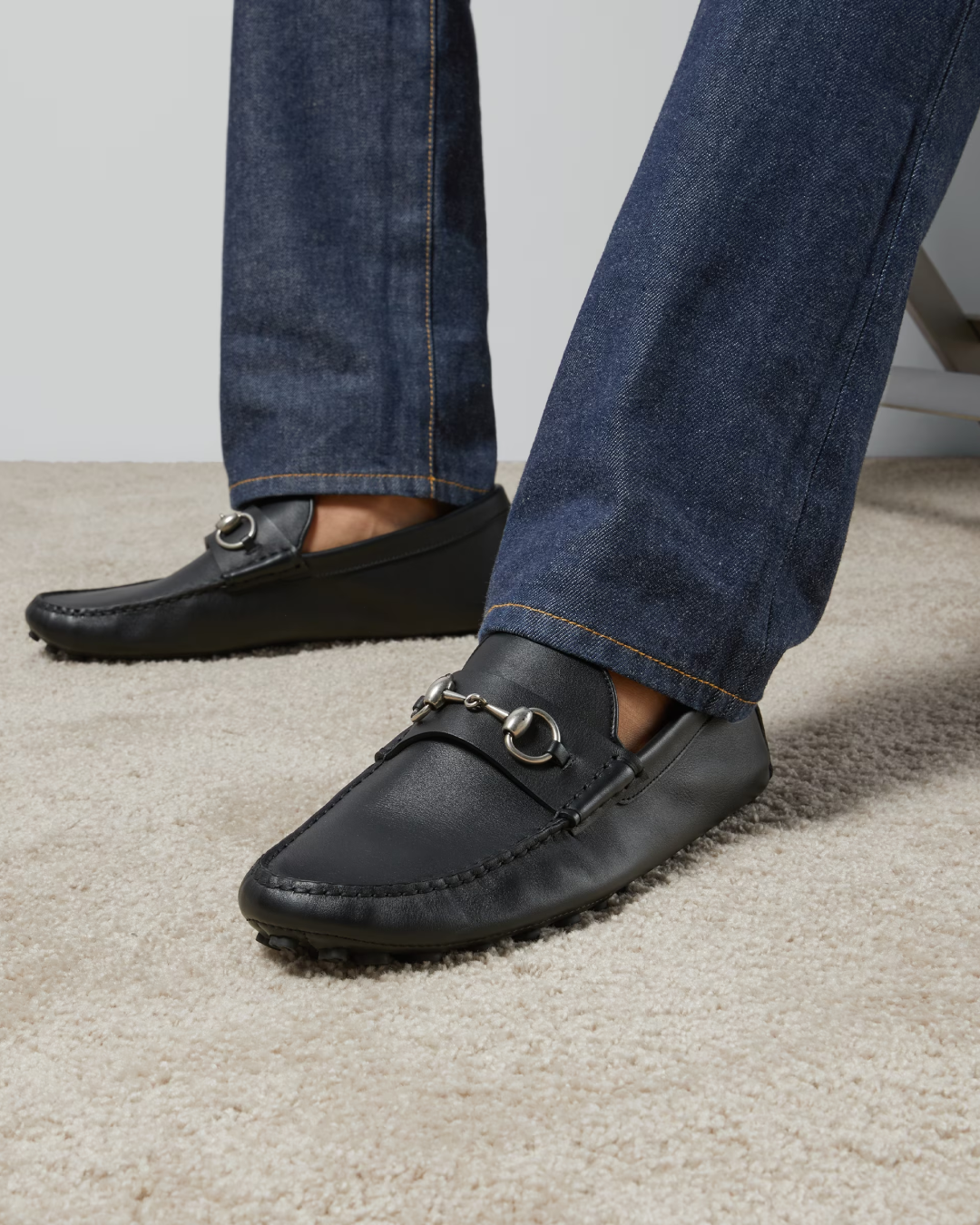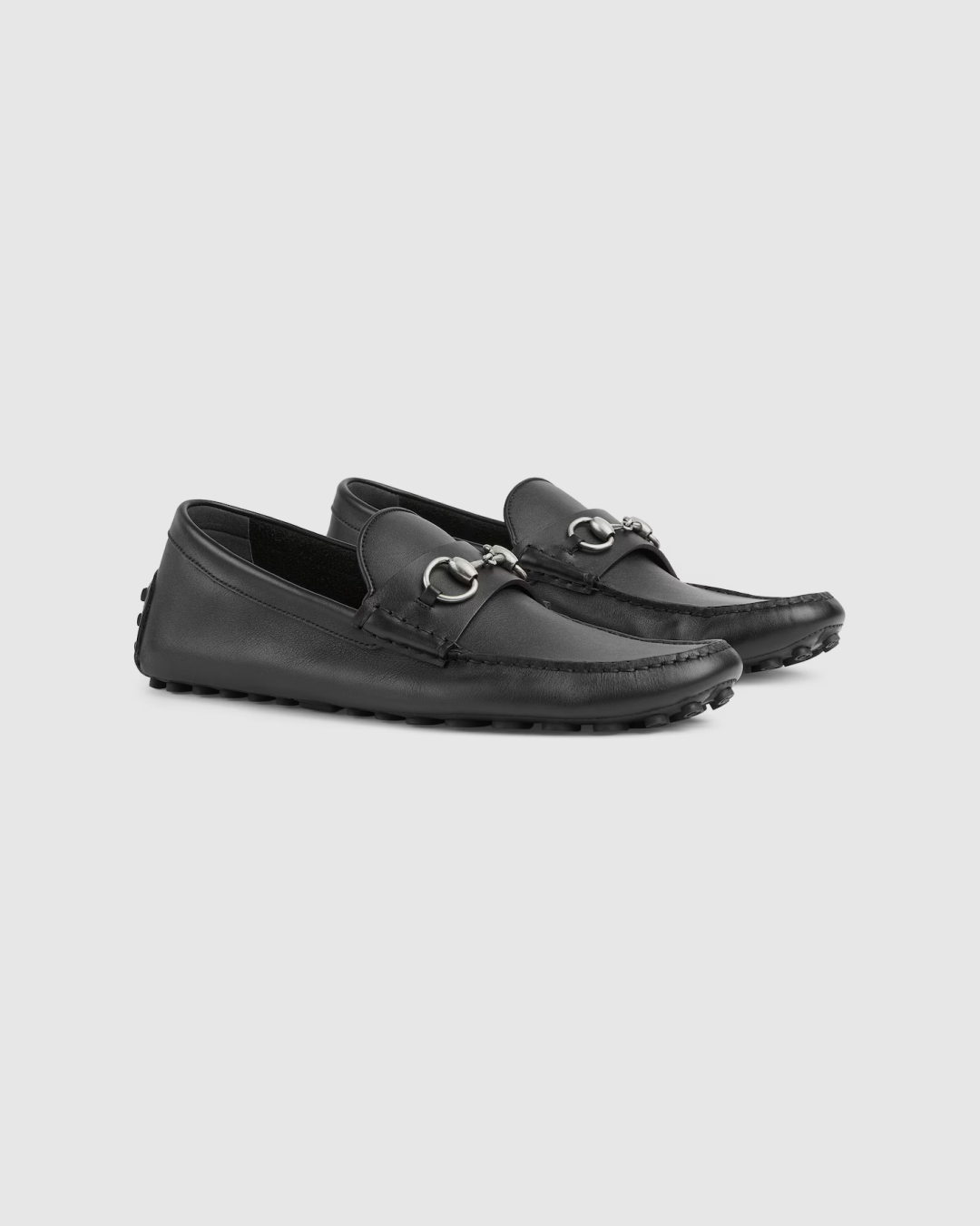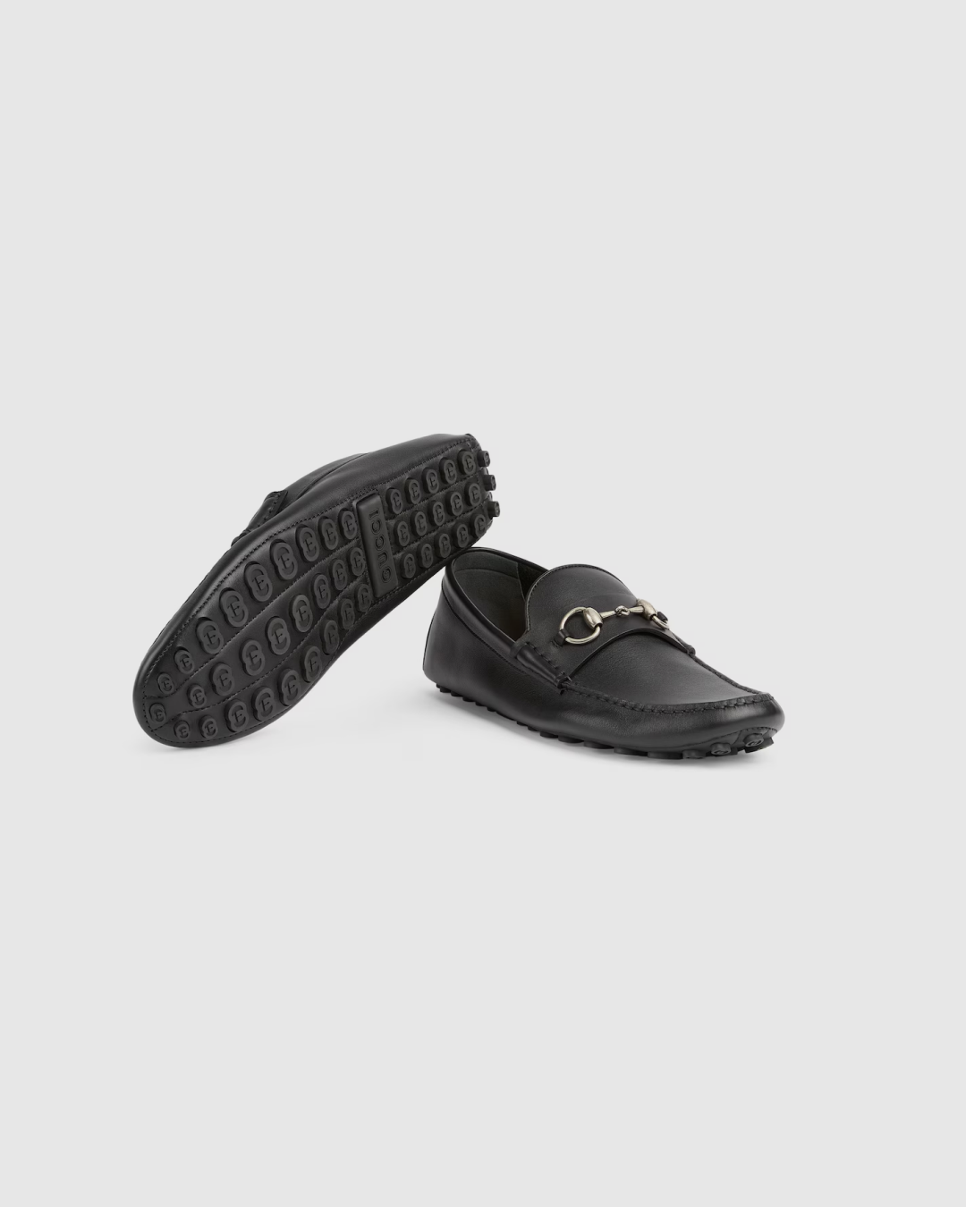 This pair of drivers pays homage to the House's equestrian heritage, with the iconic Horse-bit symbol taking center stage. Crafted from luxurious black leather, these men's shoes feature silver-toned hardware and a pebbled rubber sole for added comfort.