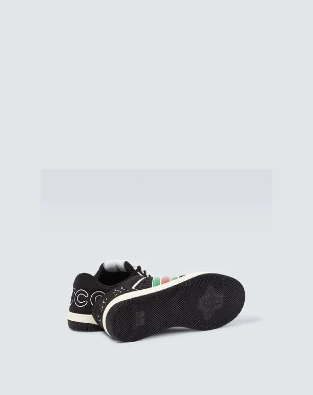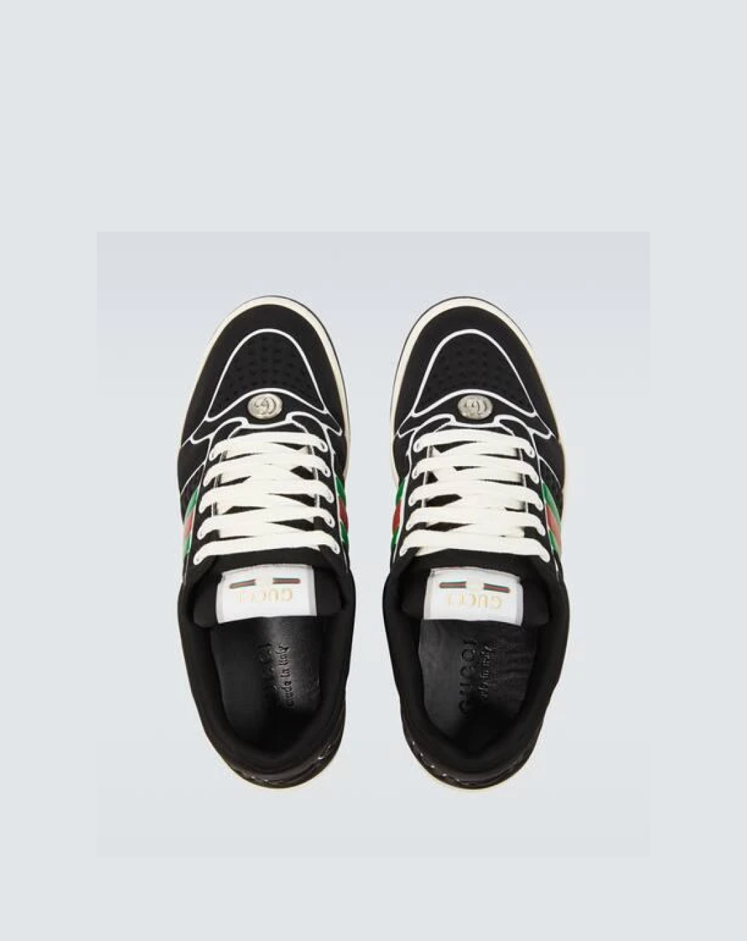 The design is defined by Gucci’s signature green and red Web stripe along the sides, adding a bold contrast against the dark upper. A tonal GG motif subtly enhances the sneaker’s heritage appeal, while the lightly scuffed detailing on the midsole reinforces its vintage character. The interior is lined with soft terry cloth for a comfortable, breathable fit, and the rubber sole provides excellent grip and durability.
