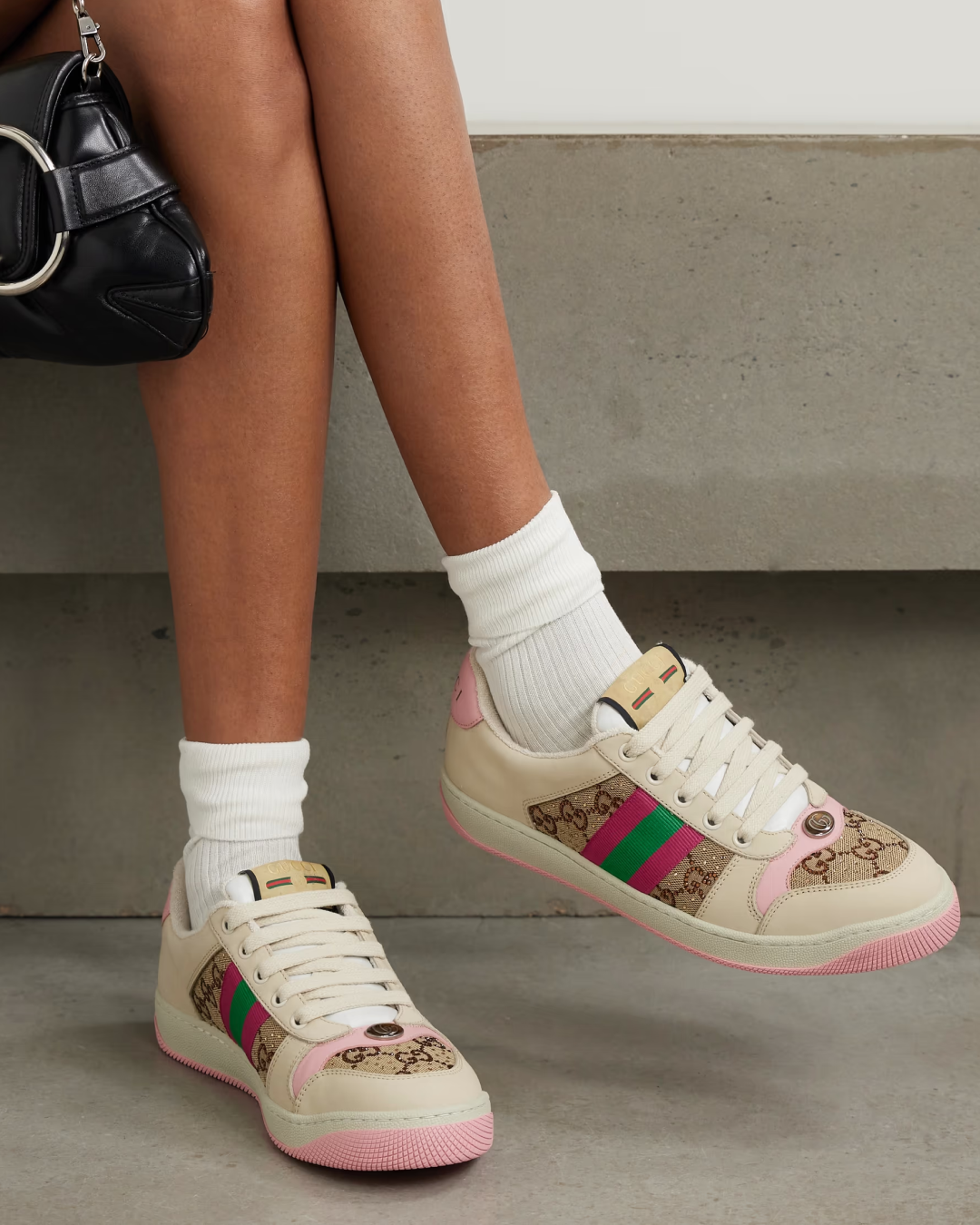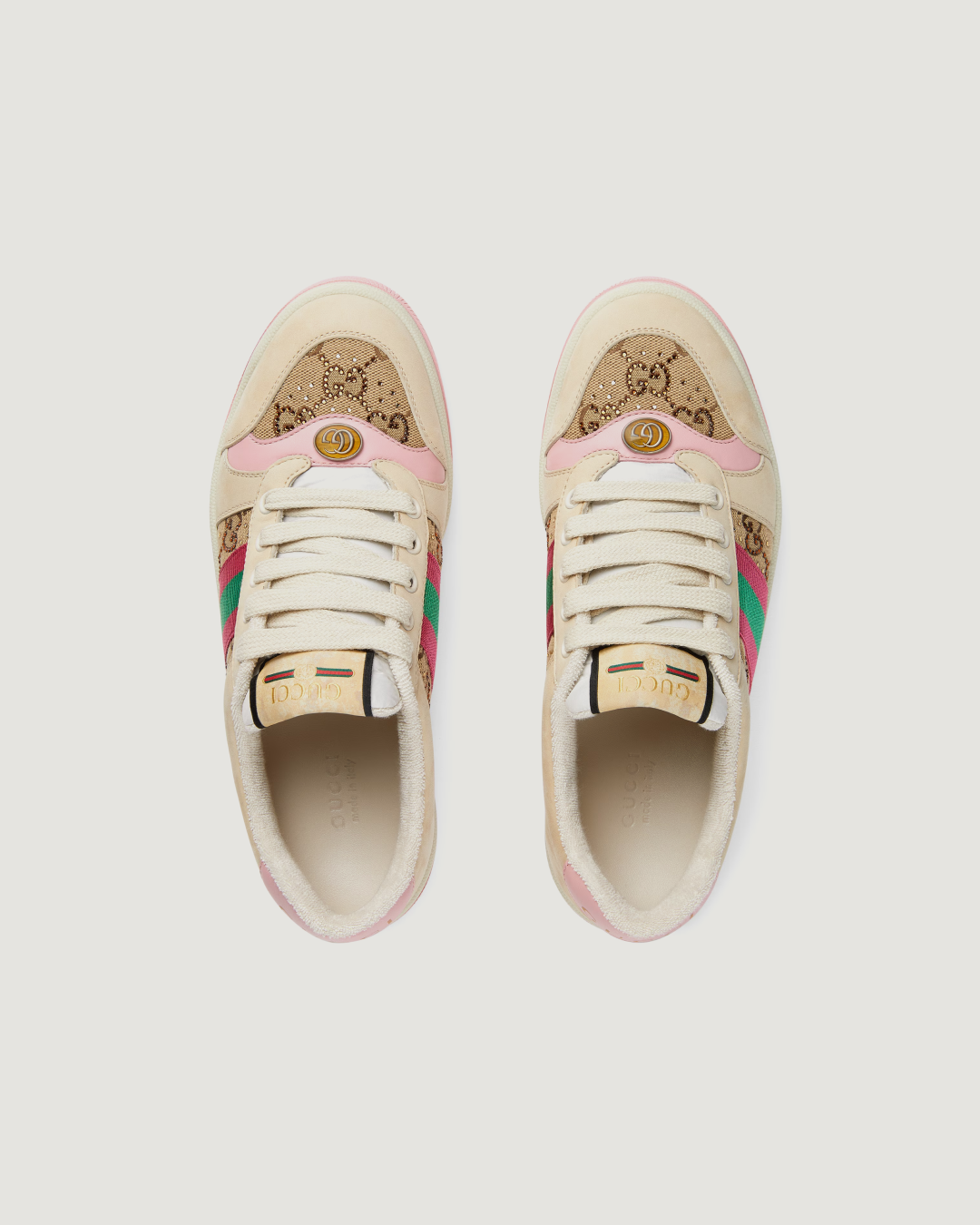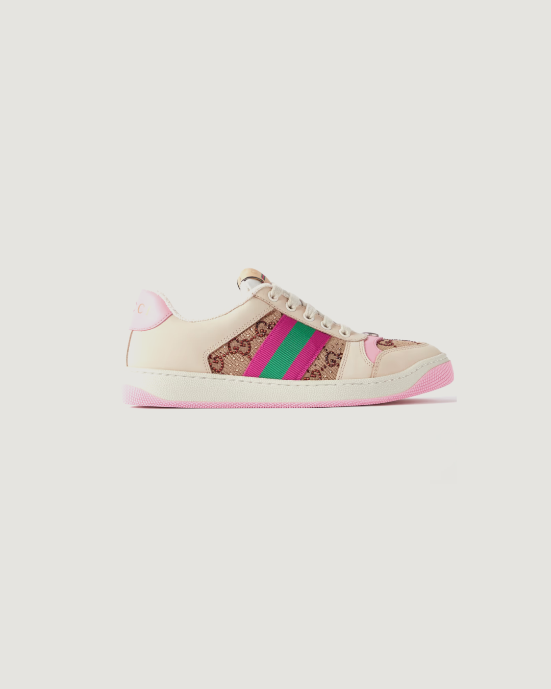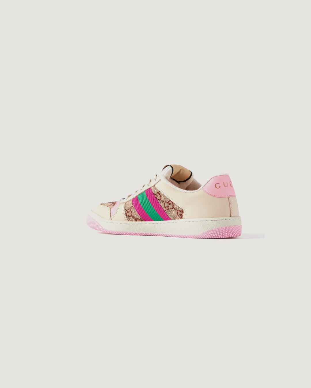The distressed detailing on the midsole gives it a vintage vibe, while the comfortable fit ensures all-day wearability. Perfect for those who appreciate a mix of elegance and edge, the Gucci Screener GG 'Pink' Sneaker is a statement piece that brings high fashion to everyday footwear.