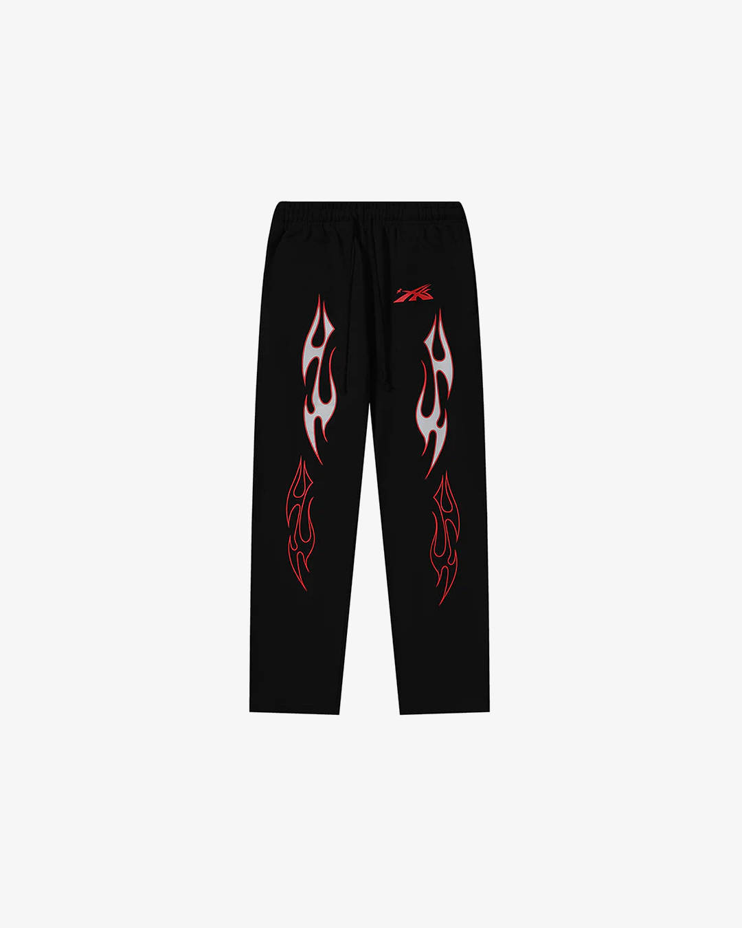 The jacket features a high collar and full zip front, adorned with flame-inspired accents along the sleeves that add an eye-catching, dynamic look. The matching pants are fitted with an elasticated waistband and adjustable drawstring for a comfortable fit, with tapered legs that end in fitted cuffs, ideal for a streamlined silhouette.