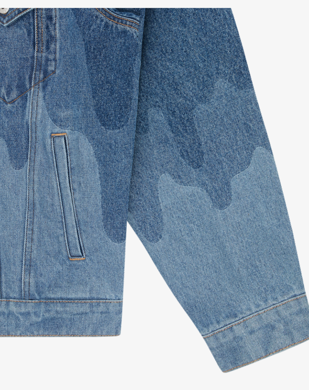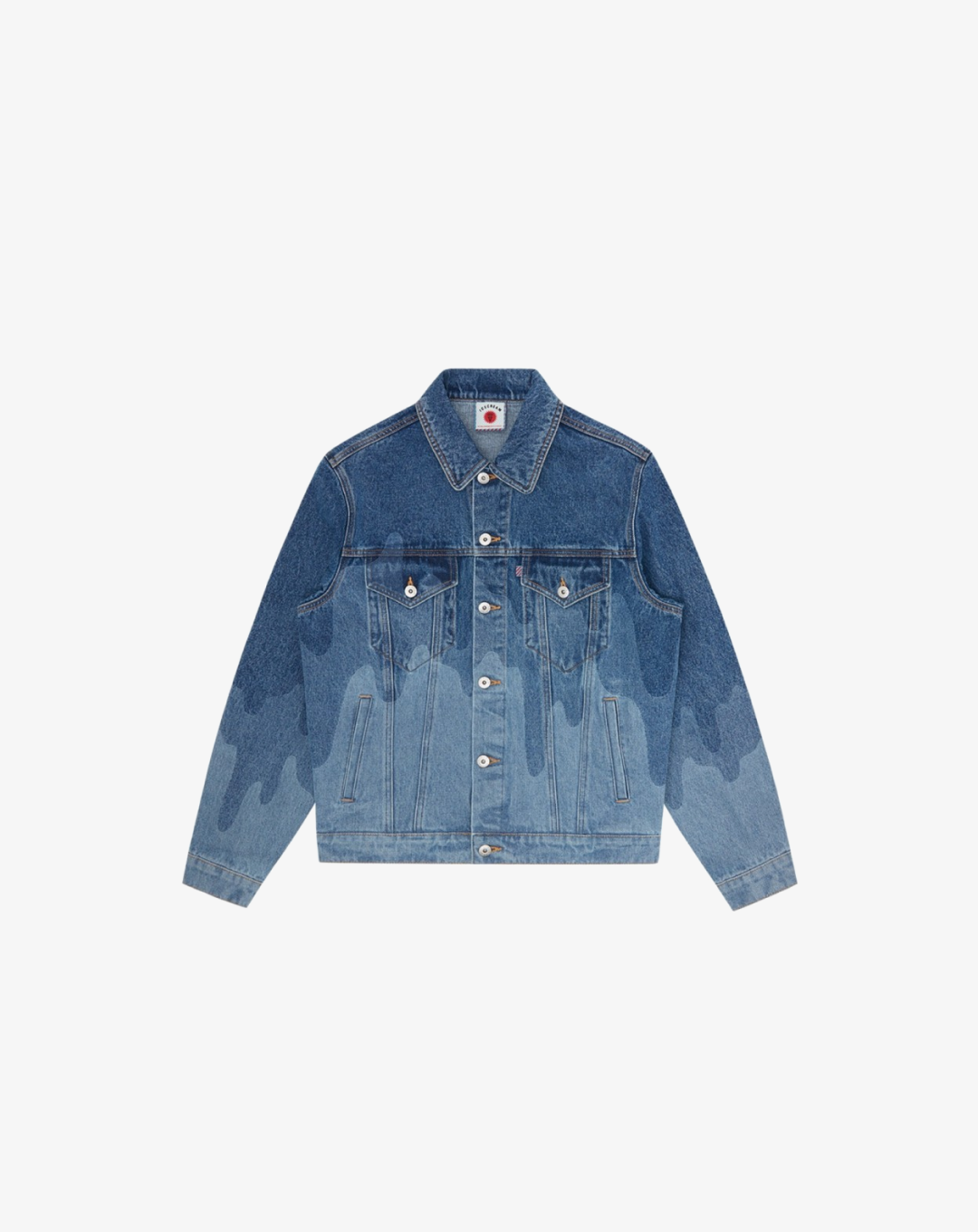 Crafted from premium denim, the jacket offers a structured fit with durable stitching for long-lasting wear. The standout lazer drip detailing flows across the front, back, and sleeves, adding a unique texture that elevates the classic denim silhouette. Functional elements include buttoned chest pockets, side welt pockets, and adjustable waist tabs for a customizable fit.