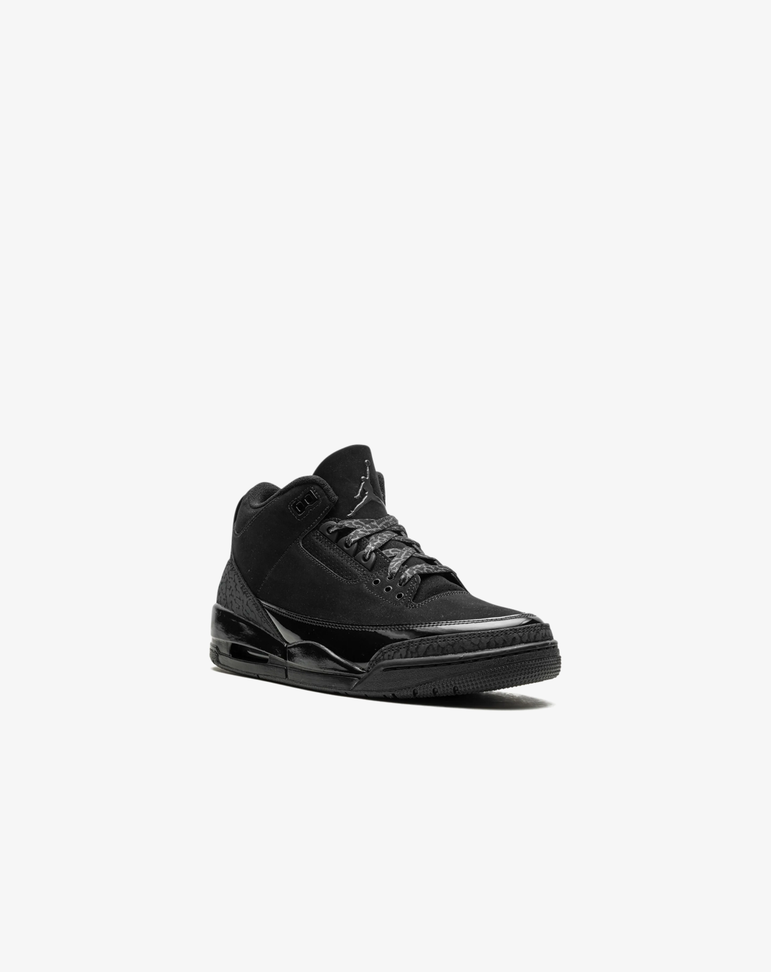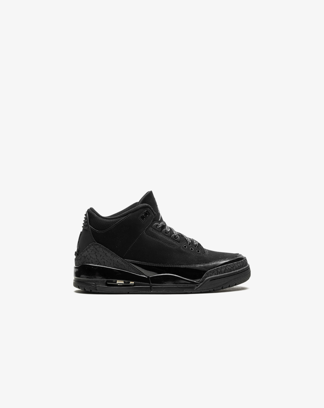 The Air Jordan 3 "Black Cat" 2025 reintroduces a fan-favorite colorway with a modern twist, inspired by Michael Jordan’s iconic "Black Cat" persona. This edition features a sleek black nubuck upper paired with dark charcoal elephant print overlays, delivering a stealthy, monochromatic look. A glossy patent leather mudguard adds a subtle shine, while chrome accents on the Jumpman logo provide a touch of contrast. The design is finished with a black midsole and a smoke-grey outsole, combining heritage style with contemporary flair.