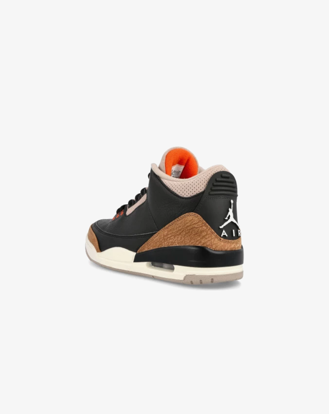 The Air Jordan 3 Retro "Desert Elephant" offers a sophisticated twist on the iconic 1988 silhouette, blending heritage design with premium materials. This edition features a black leather upper with textured Desert Elephant print overlays on the heel and toe, a subtle nod to the original elephant print design. Aged accents on the midsole and eyelets add a vintage feel, while the rust-colored suede tongue and collar lining provide a touch of warmth and contrast. With a visible Air-Sole unit for cushioning and a durable rubber outsole, these sneakers deliver both style and all-day comfort.