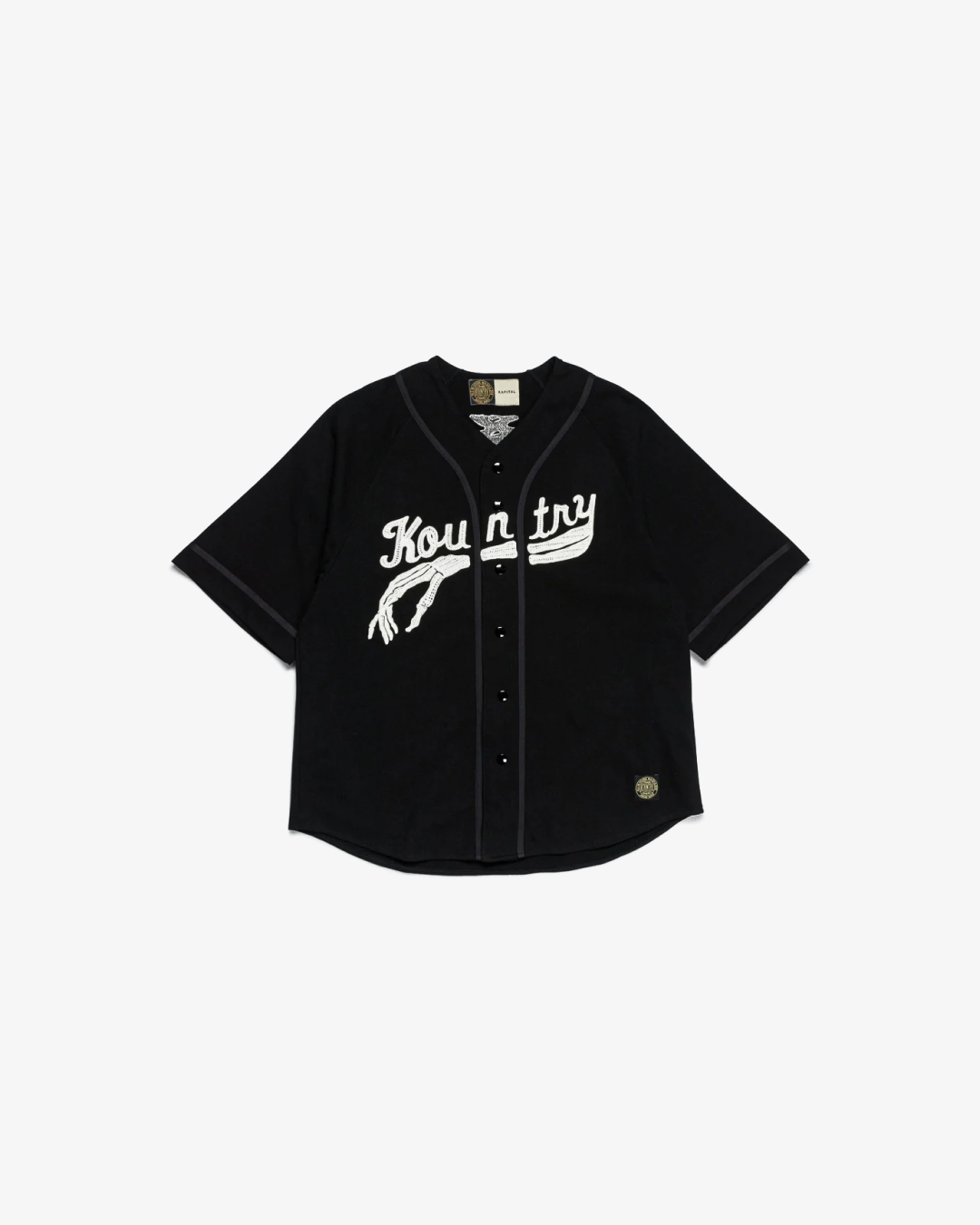The Kapital Kountry Bone Baseball Shirt merges traditional sportswear aesthetics with creative, unconventional design, making it a standout piece for those who appreciate fashion with character and a worn-in look