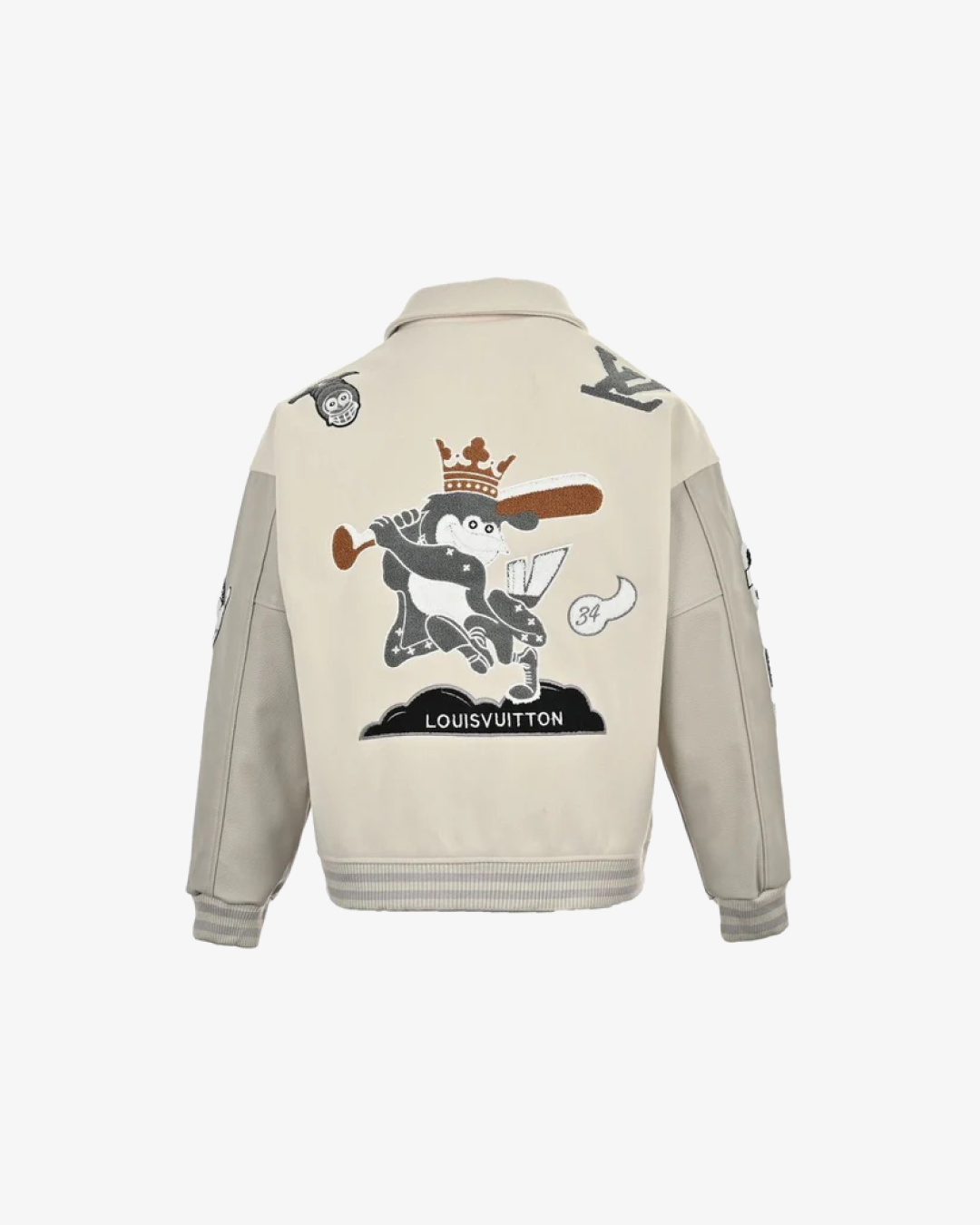 The Louis Vuitton Baseball Varsity Jacket is a luxurious twist on the classic varsity style, seamlessly blending streetwear aesthetics with high fashion craftsmanship. Crafted from premium materials, this jacket features wool-blend fabric for the body, offering warmth and durability, while the leather sleeves provide a sleek contrast and refined edge.