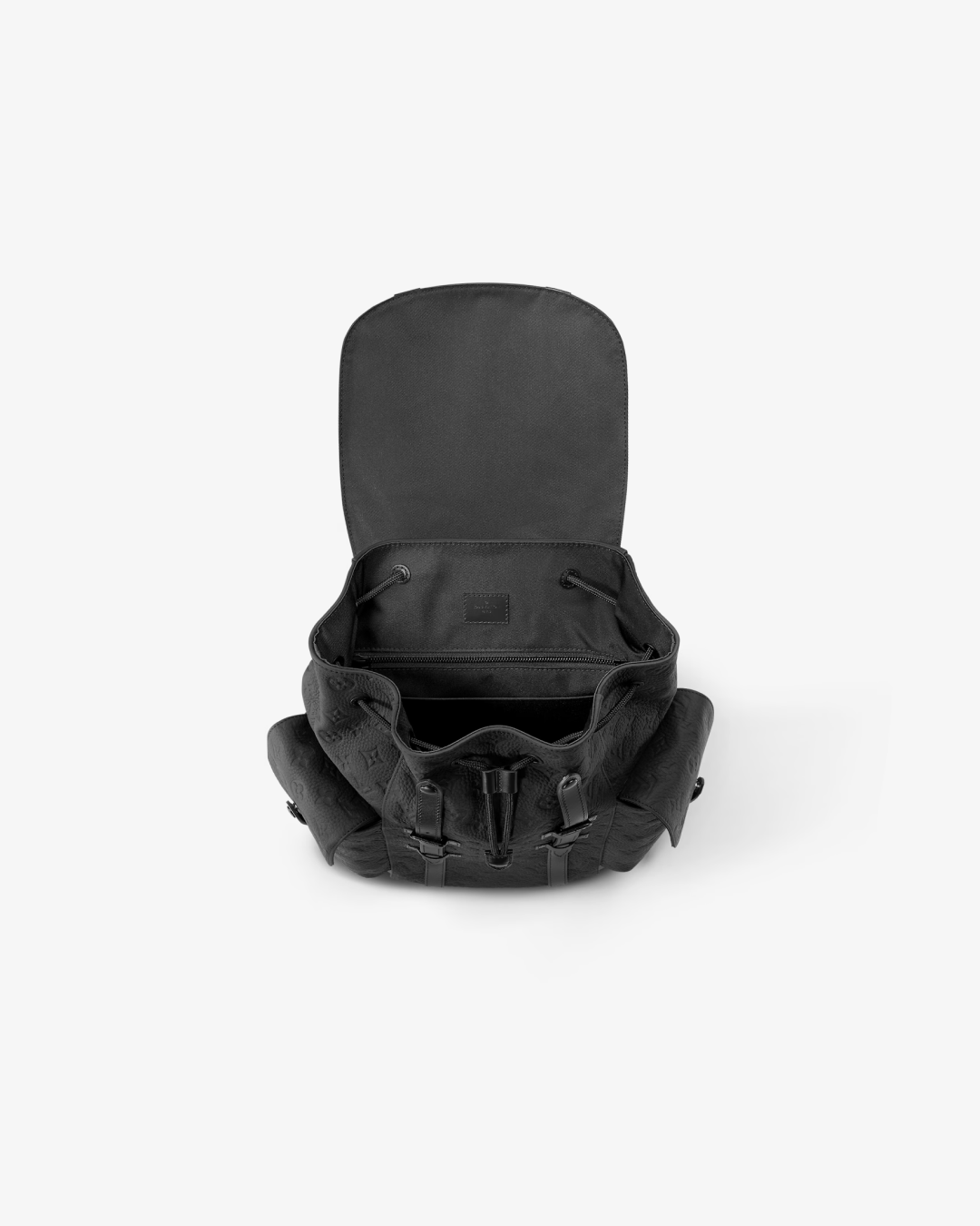 The Christopher Backpack features a spacious interior with a drawstring closure and a flap top secured by matte black buckle straps, providing both style and security for your belongings.