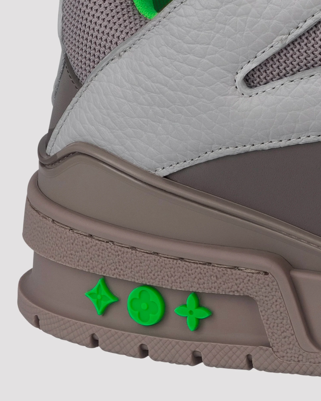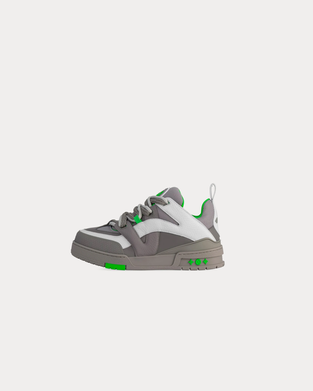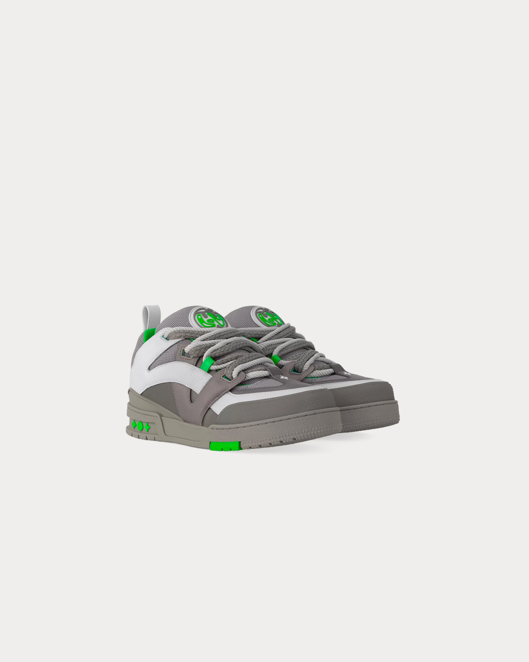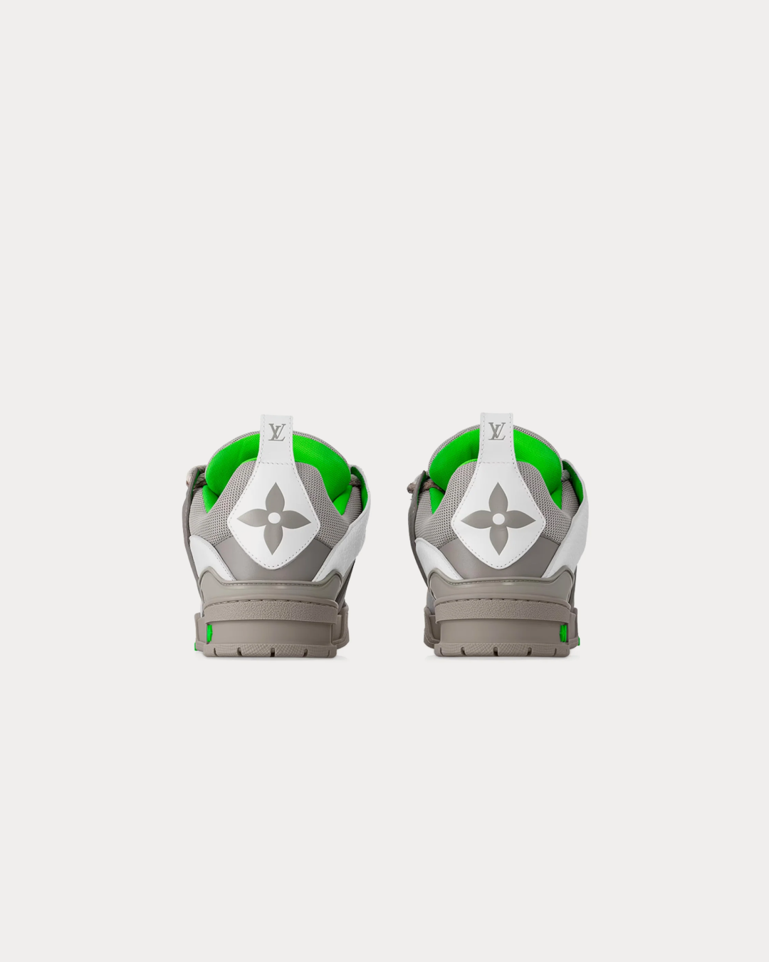 The men’s LV LV Skate low top sneakers in grey are crafted from grained calf leather & technical mesh and feature LV initials on the tongue, two tone laces, interlaced LV on the side, Monogram Flowers on the back and outsole, and LV Initials back loop.