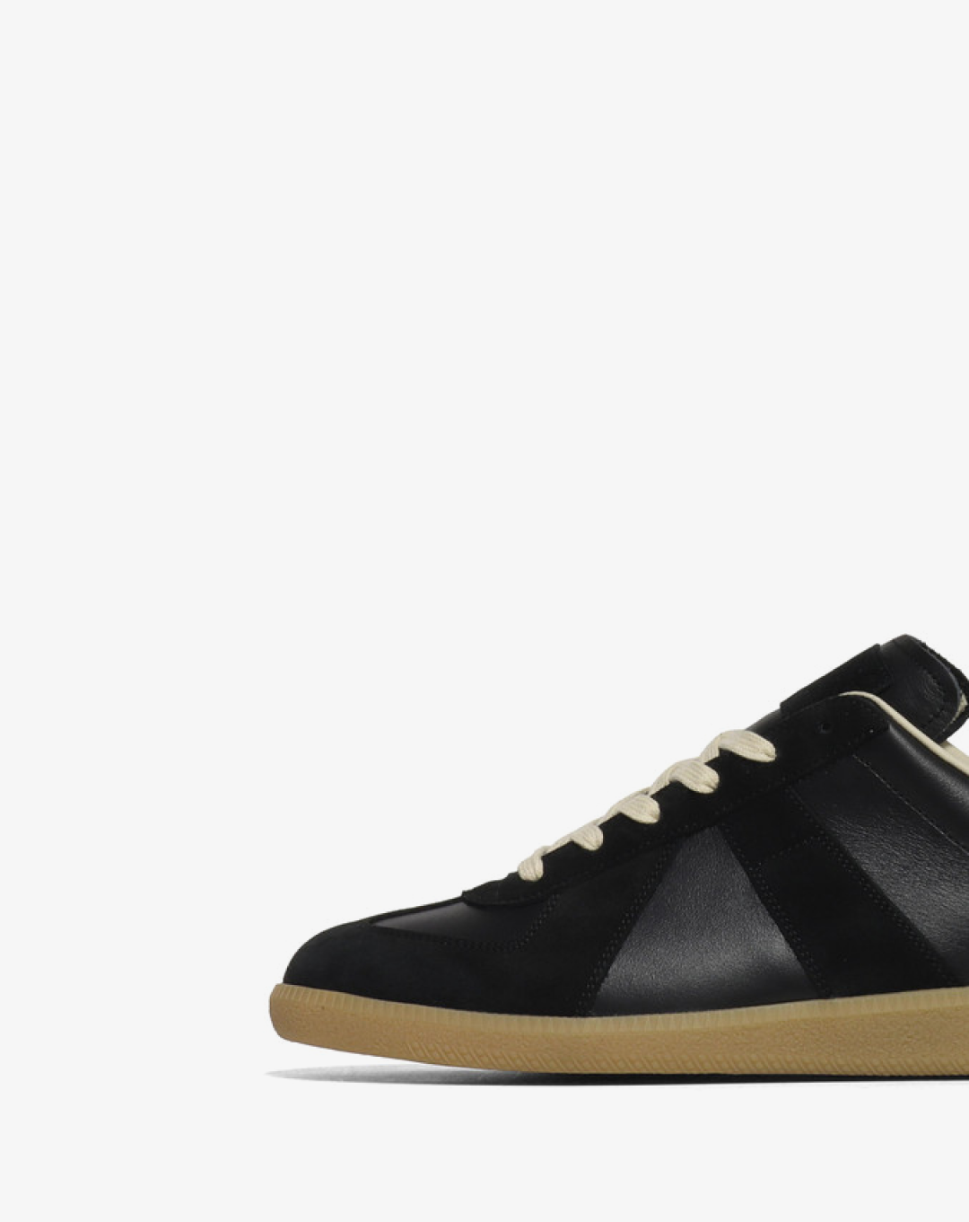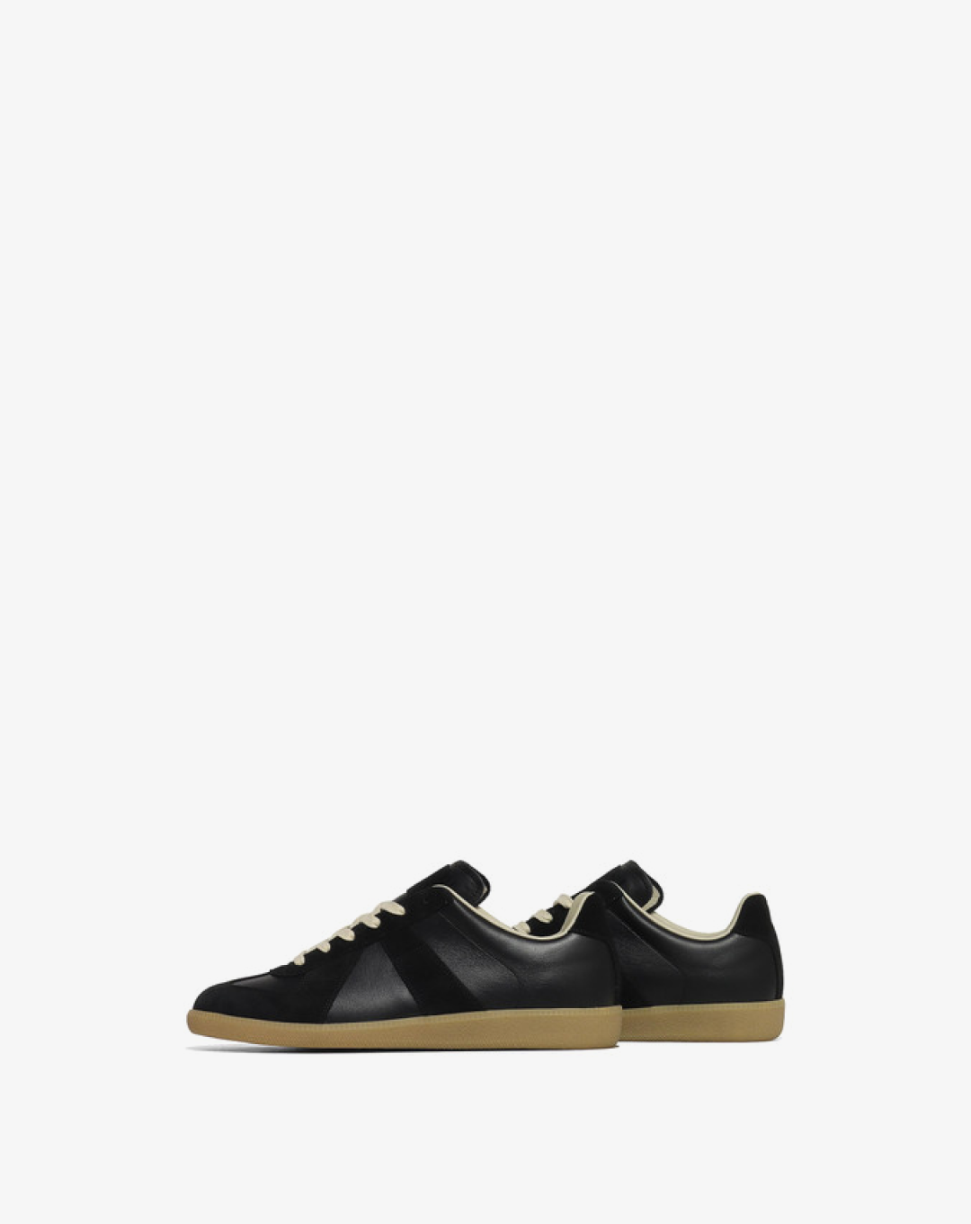 The Maison Margiela Replica Sneakers are a timeless reinterpretation of the classic German Army Trainer (GAT), blending minimalist design with luxurious craftsmanship. Made in Italy, these sneakers feature a premium leather and suede upper, offering a soft, supple feel with a sleek, low-profile silhouette. The iconic gum sole provides durability and comfort, while subtle Maison Margiela branding on the tongue and the signature stitch detail at the heel adds a discreet yet recognizable touch. Each pair is crafted to deliver understated elegance with a vintage-inspired aesthetic.