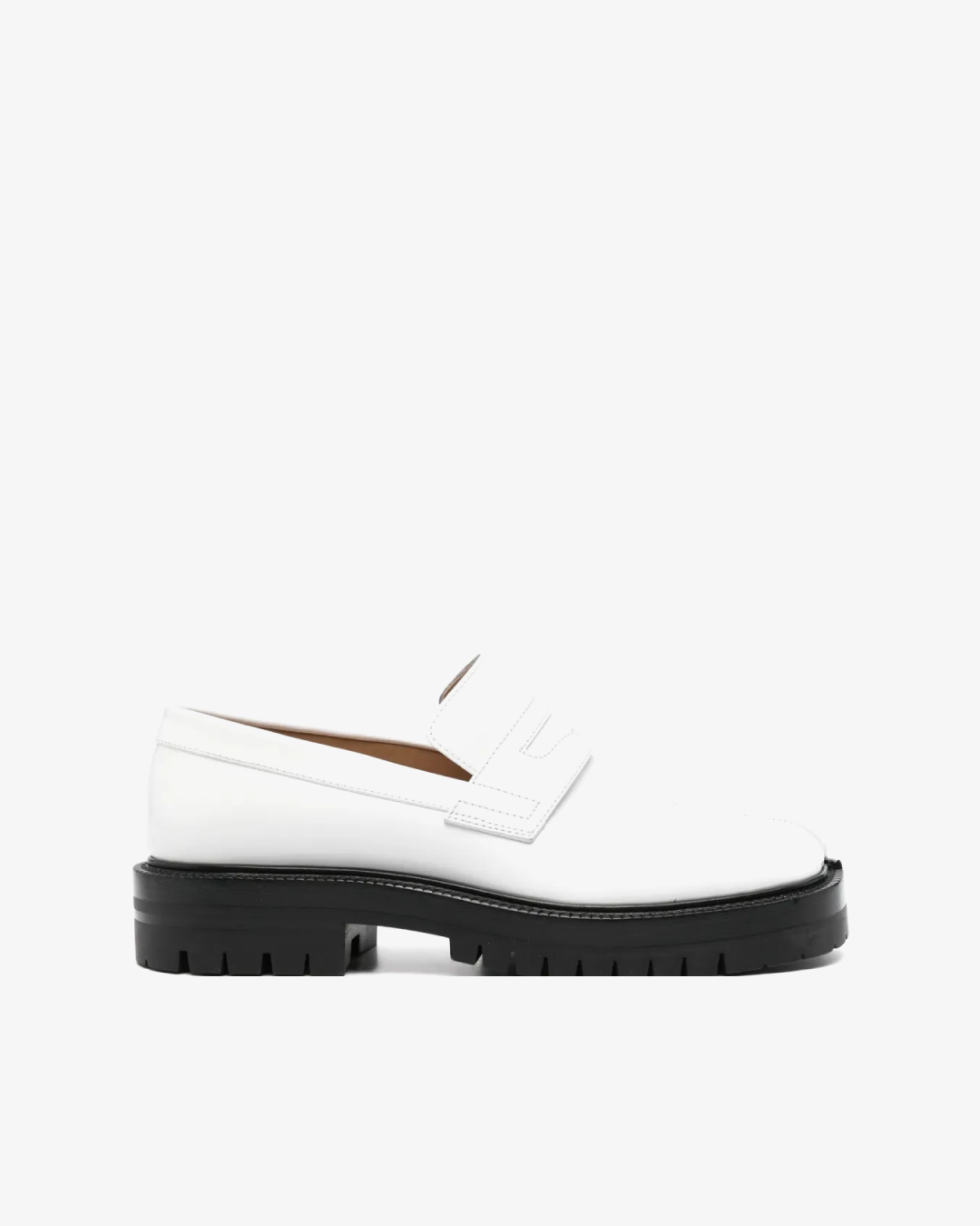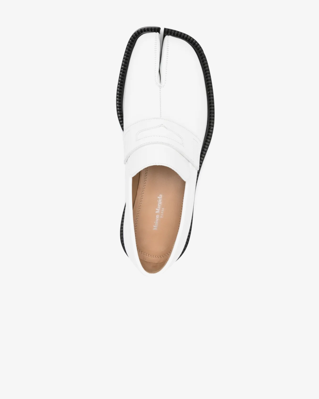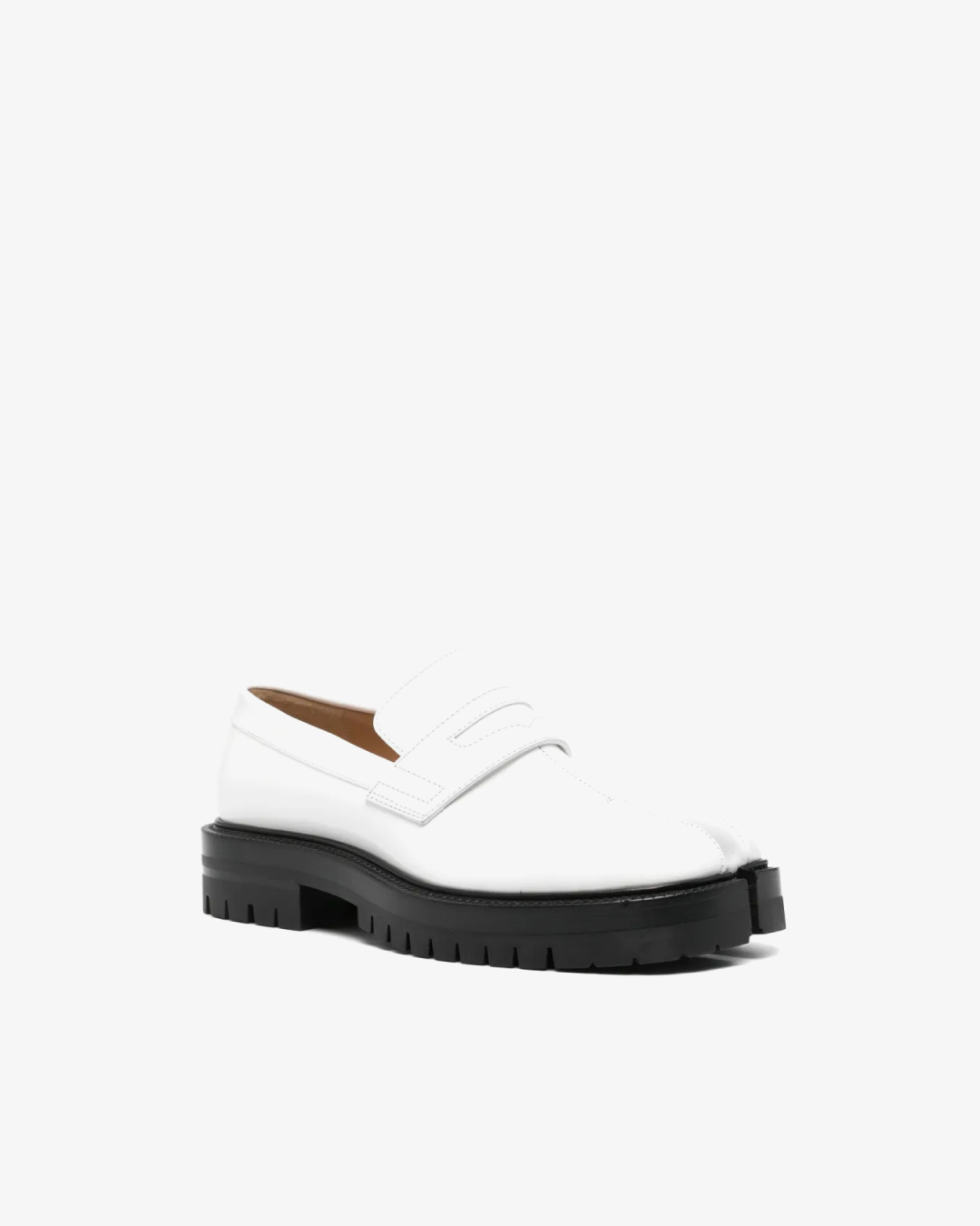 The Maison Margiela Tabi 'White' Leather Loafers are a bold reimagining of classic footwear, combining heritage craftsmanship with avant-garde design. Made from smooth premium white leather, these loafers showcase the house’s iconic split-toe silhouette, a detail that challenges convention while exuding refined elegance. Minimalist yet instantly recognizable, they embody the brand’s philosophy of subtle disruption in luxury fashion.
