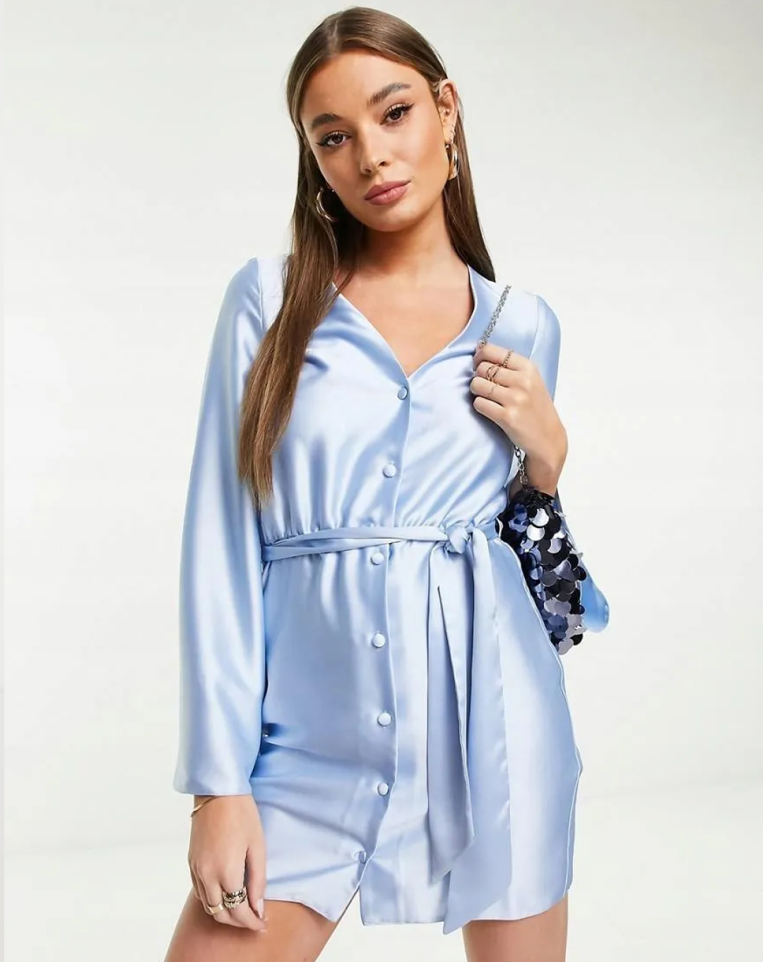 This shirt dress features a classic button-through front, giving it a refined yet relaxed silhouette. The collared neckline and long sleeves bring structure to the design, while the satin material provides a soft, flowing drape for a flattering fit. The mini length adds a touch of playfulness, and its versatile design allows it to be dressed up with heels or kept casual with flats or sneakers.