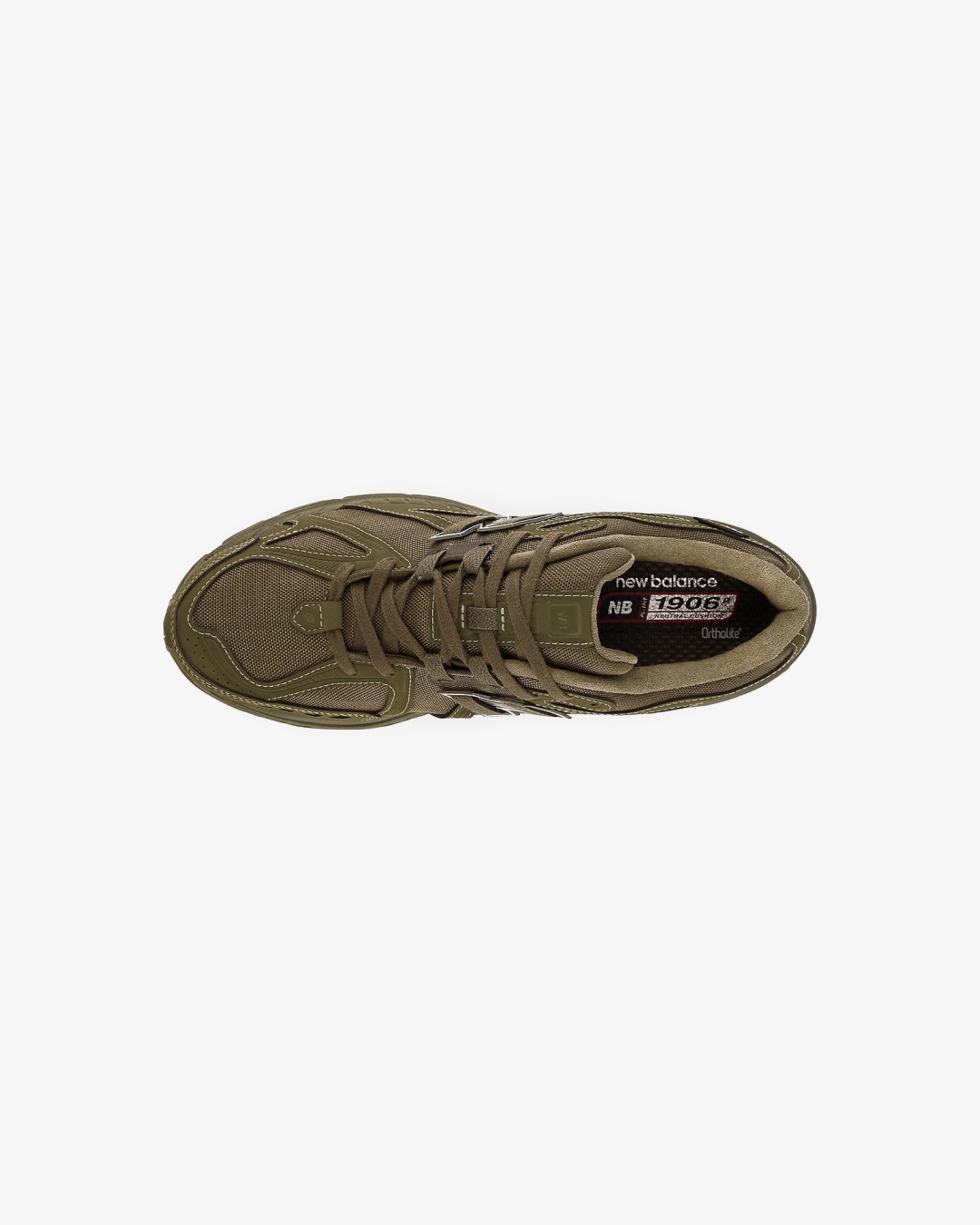 The titular hue predominantly features throughout the silhouette’s mesh, leather, and Cordura construction, while NLOCK logos on the profiles and an aged ABZORB midsole further elevate this offering. Lastly, the pair is finished off with 1906R branding on the lateral heel with Cordura tags, and a matching olive outsole.