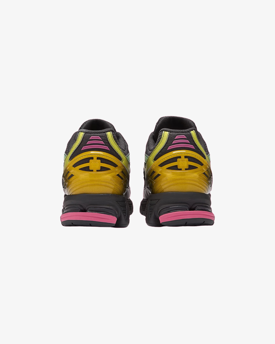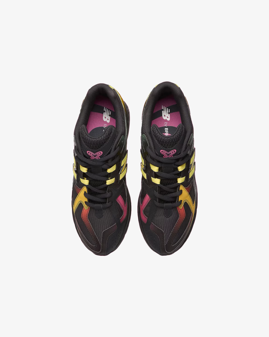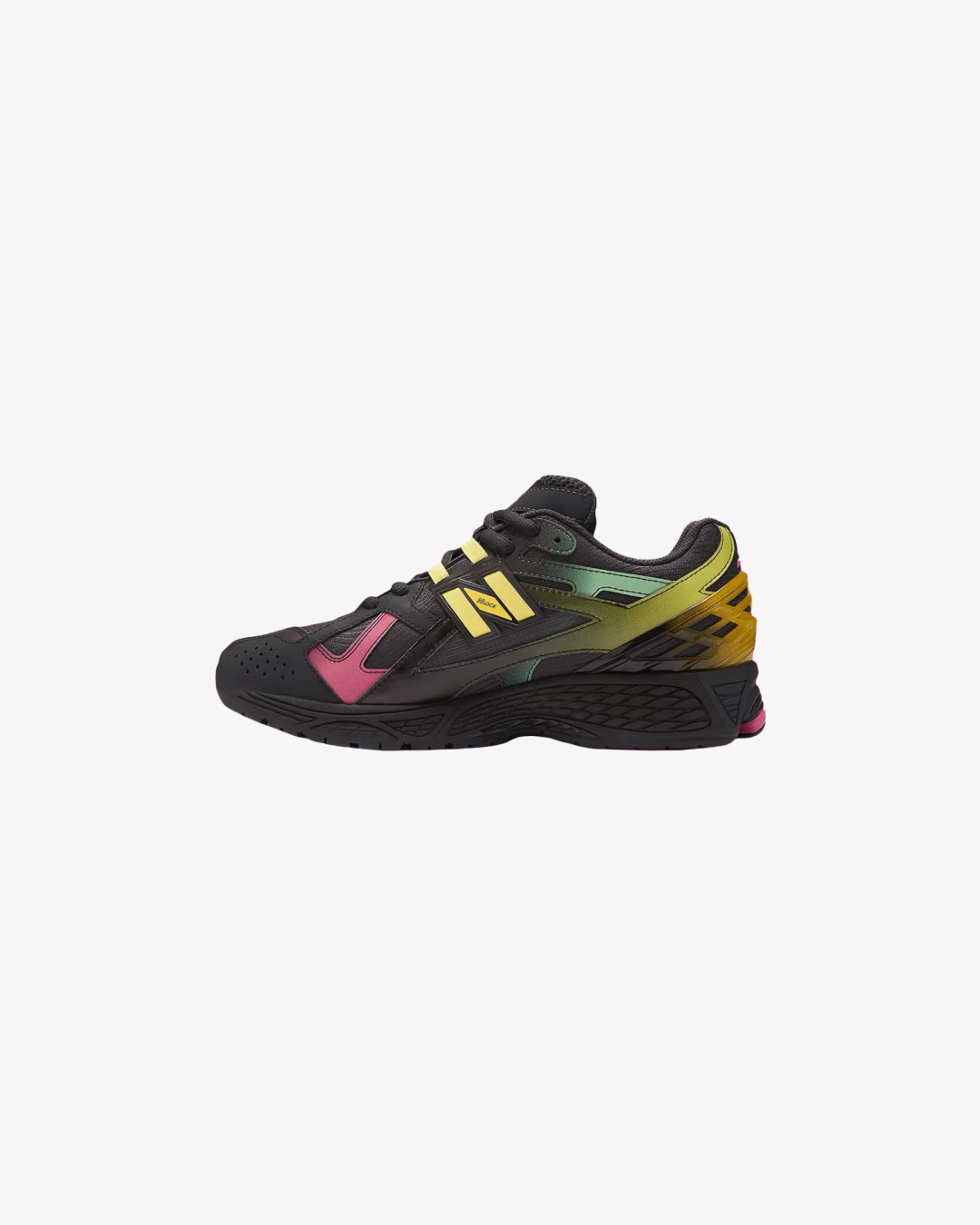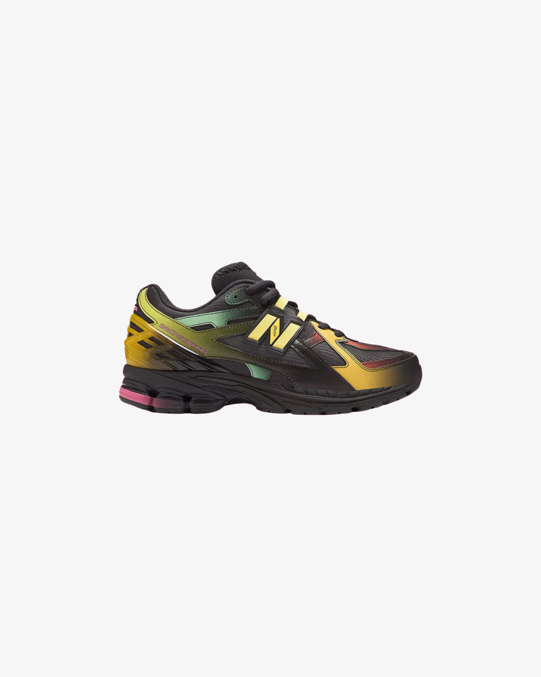 Crafted with breathable black mesh and layered with synthetic overlays in iridescent hues—greens, yellows, and pinks—these sneakers are a walking canvas of contrast and energy. Bricks & Wood branding hits the heel, while a butterfly motif on the tongue adds a subtle nod to the theme. Underfoot, New Balance’s ABZORB SBS cushioning delivers reliable comfort and shock absorption, making this pair a perfect fusion of function and story.