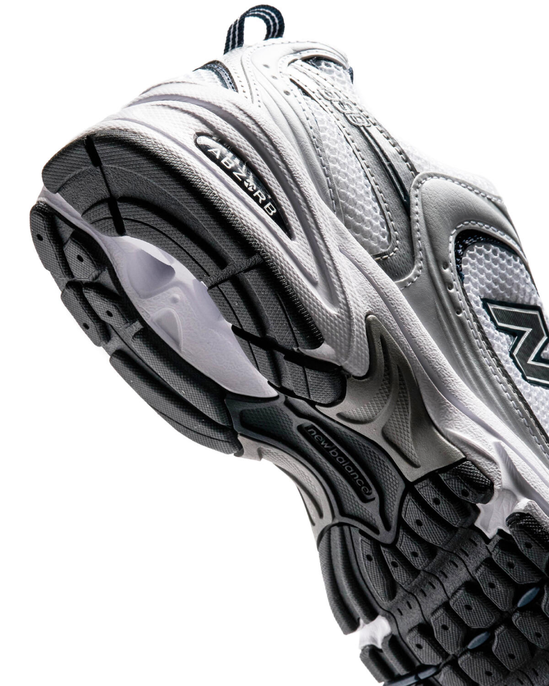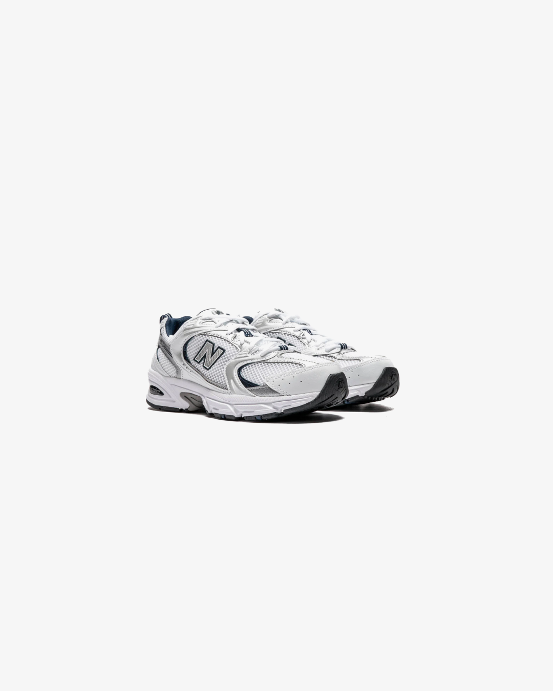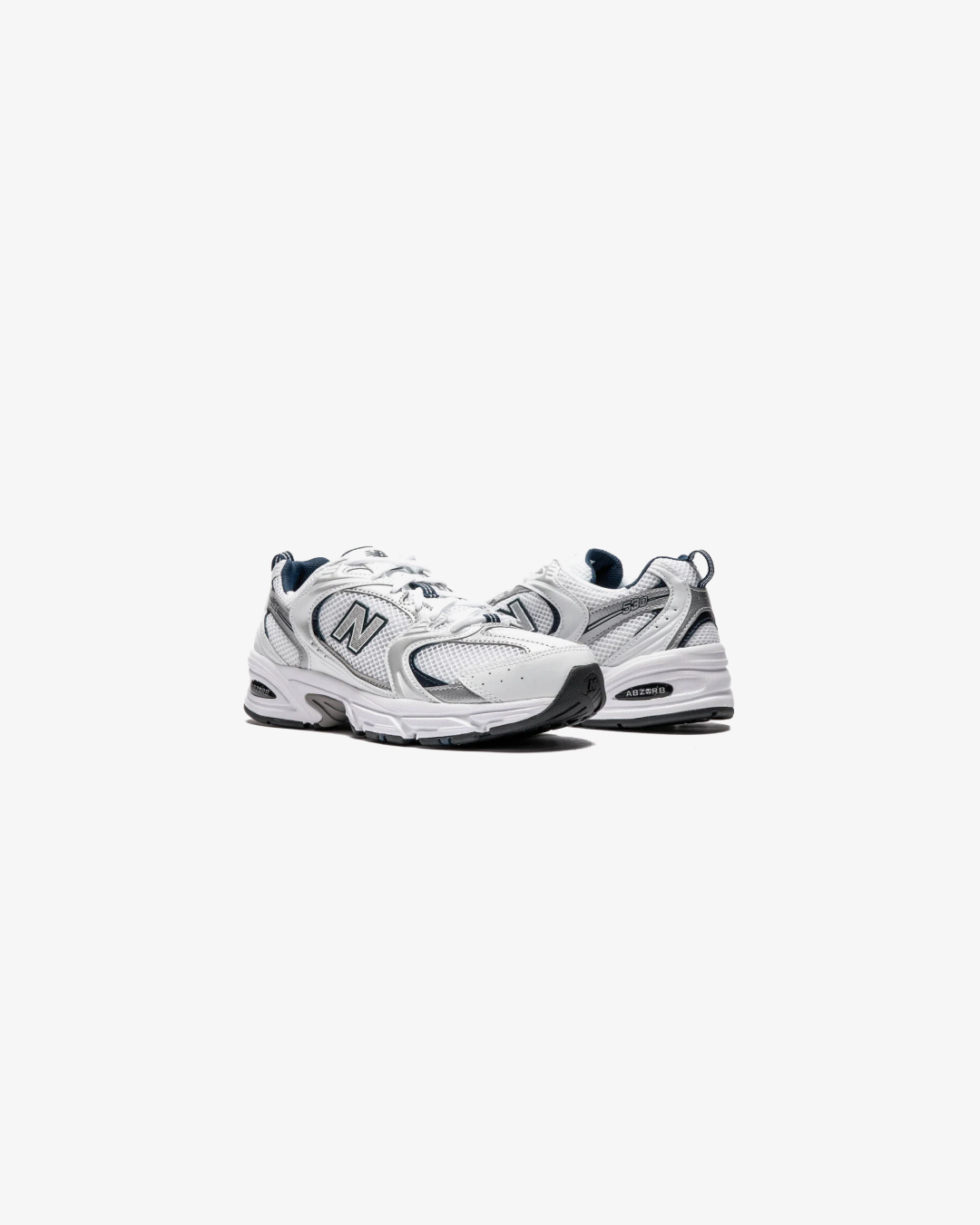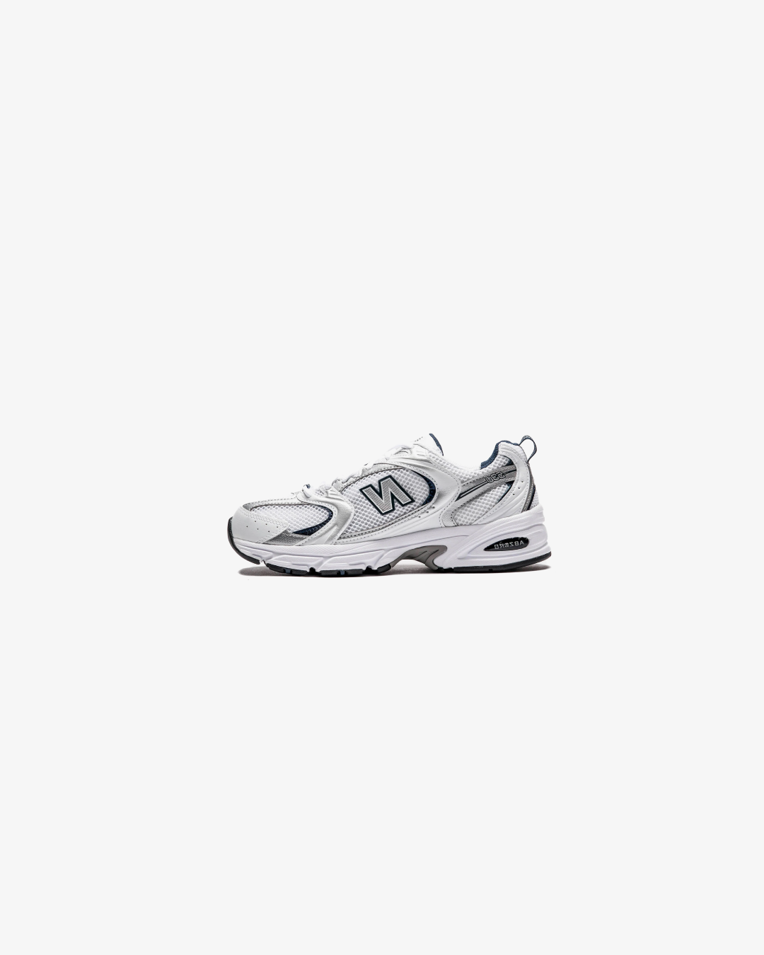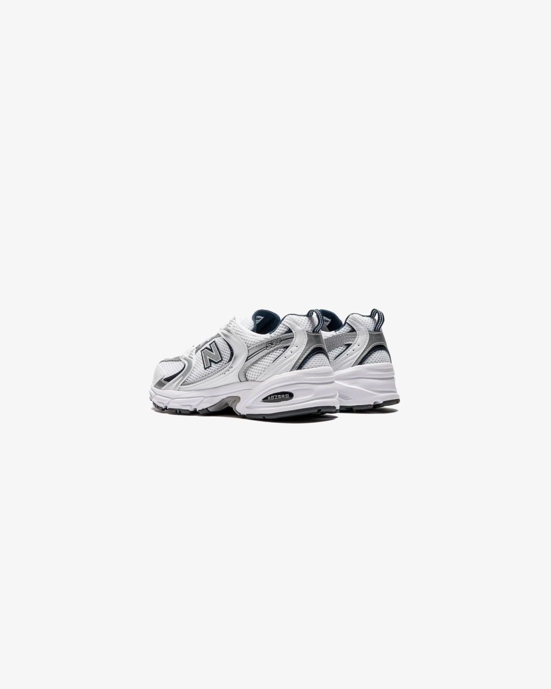 The New Balance 530 White Silver Navy features a white mesh upper with metallic silver and white leather overlays.