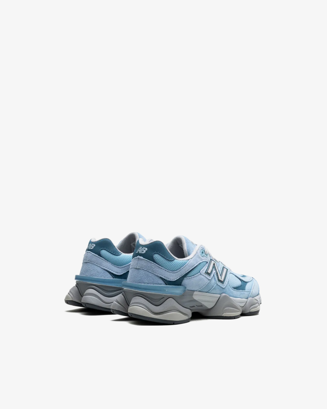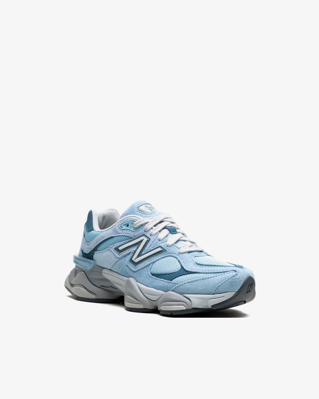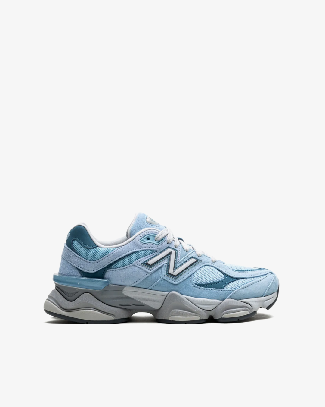 The New Balance 9060 “Chrome Blue” is a bold fusion of retro inspiration and futuristic design, released on April 10, 2024. This sneaker features a breathable mesh upper in light blue, complemented by suede overlays in varying shades of darker blue, creating a monochromatic and eye-catching aesthetic. The signature "N" logo appears on both sides—solid white outlined in dark blue on one side, and composed of small white dashes on the other. A translucent heel counter and a chunky grey outsole equipped with ABZORB cushioning technology ensure comfort and durability.