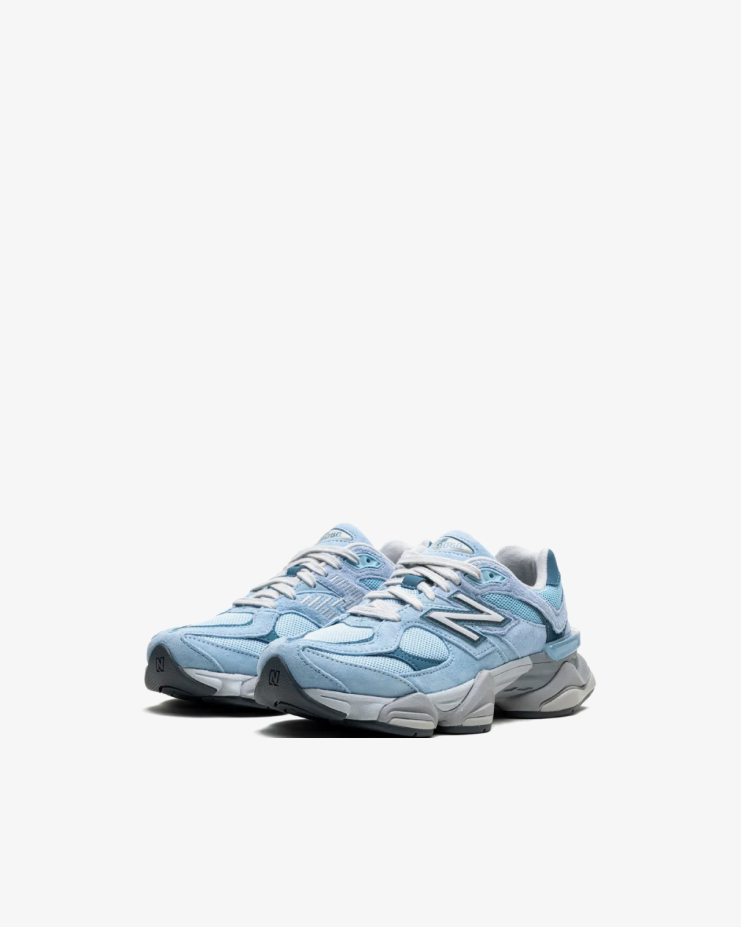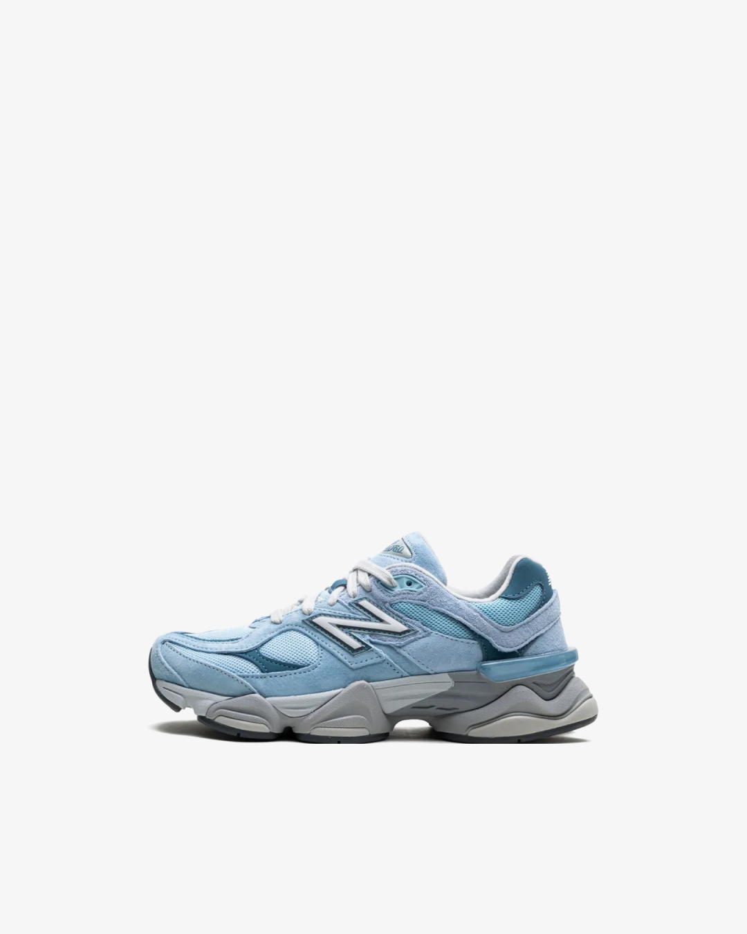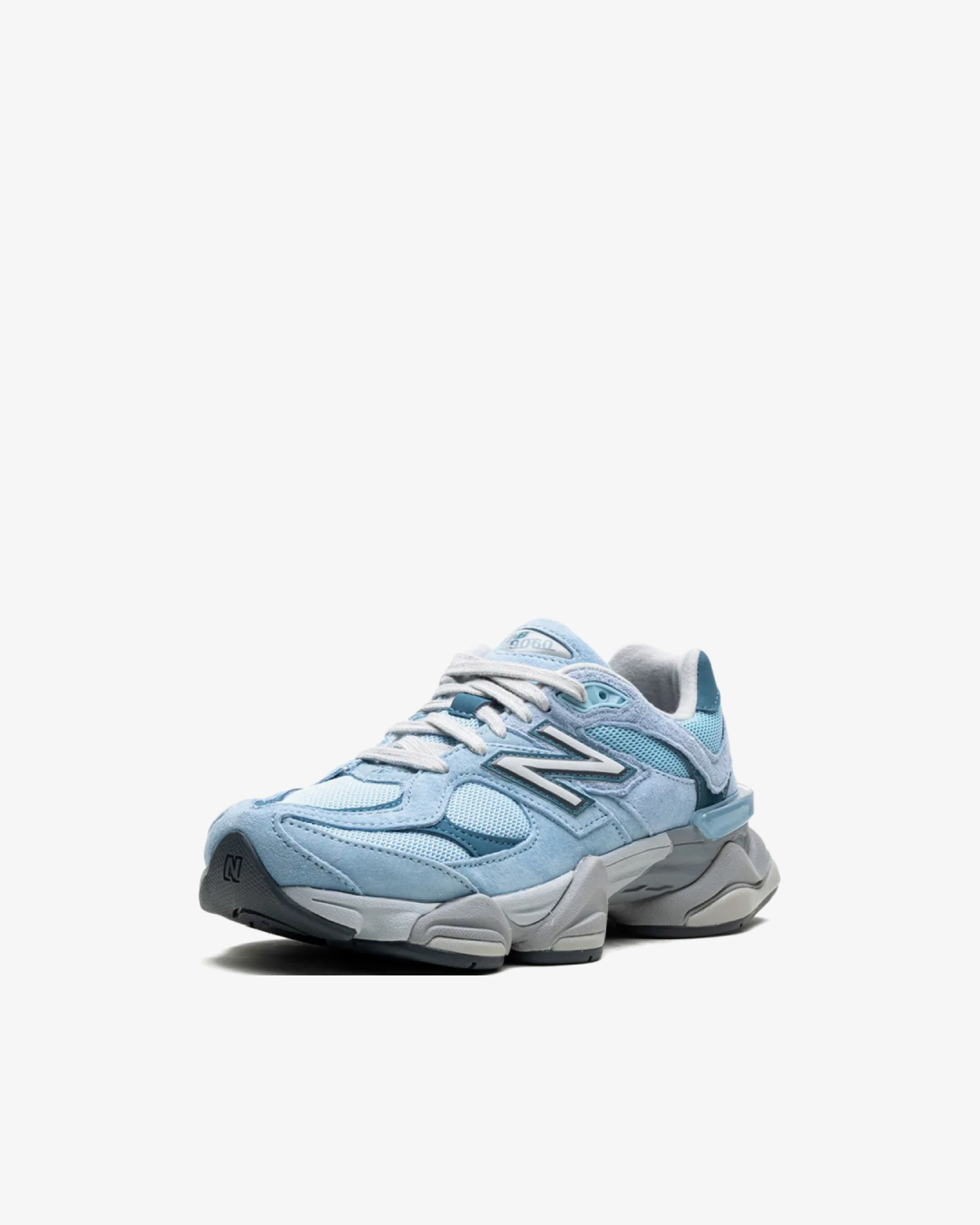 The New Balance 9060 “Chrome Blue” is a bold fusion of retro inspiration and futuristic design, released on April 10, 2024. This sneaker features a breathable mesh upper in light blue, complemented by suede overlays in varying shades of darker blue, creating a monochromatic and eye-catching aesthetic. The signature "N" logo appears on both sides—solid white outlined in dark blue on one side, and composed of small white dashes on the other. A translucent heel counter and a chunky grey outsole equipped with ABZORB cushioning technology ensure comfort and durability.